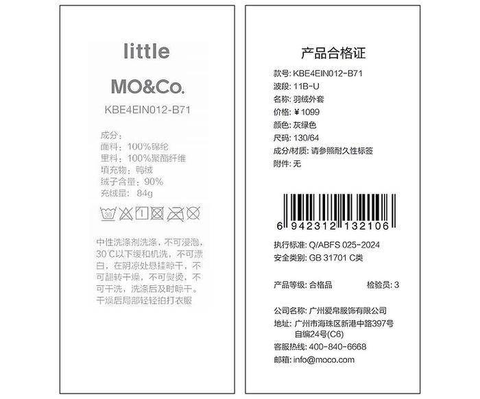 【云粉节】8楼摩安珂儿童little MO&Co.25年冬季新款90%绒子拒水鸭绒连帽男女同款羽绒外套KBE4EIN012【吊牌价:1099 元 ,活动价:989元】