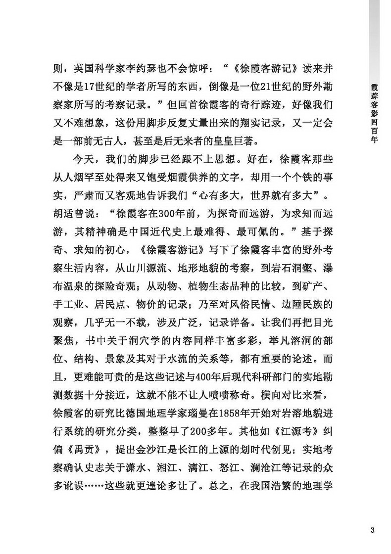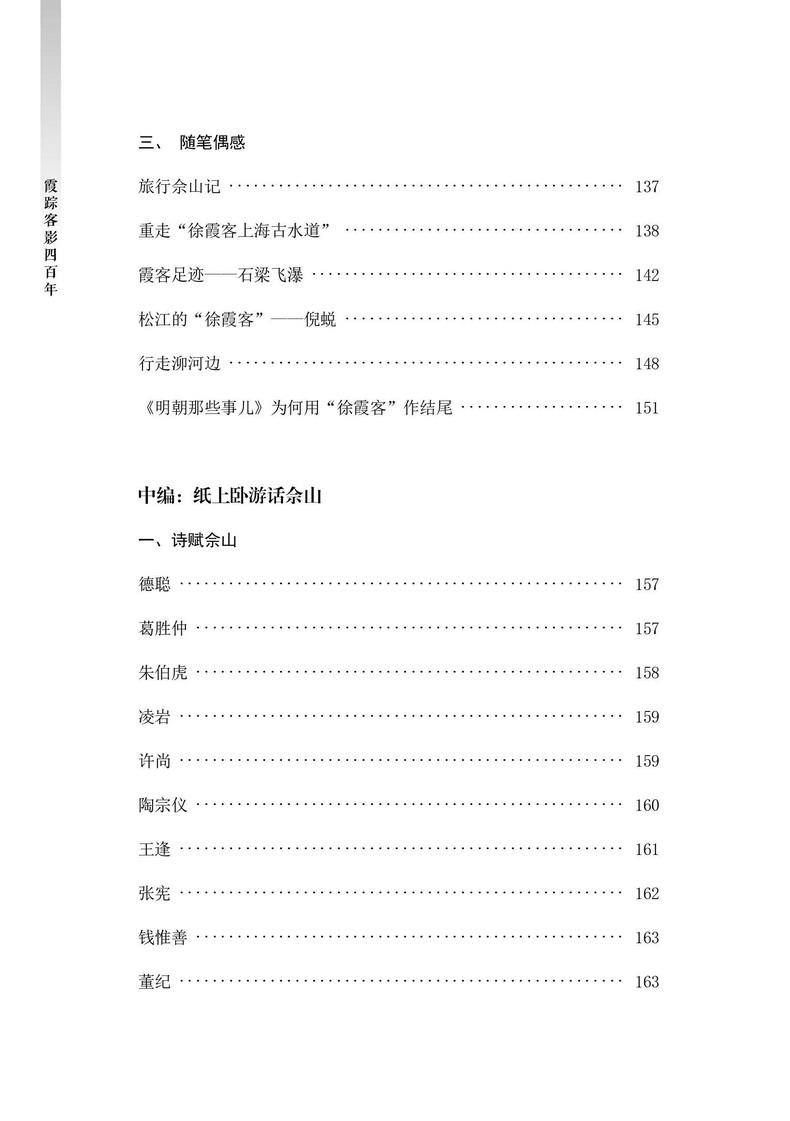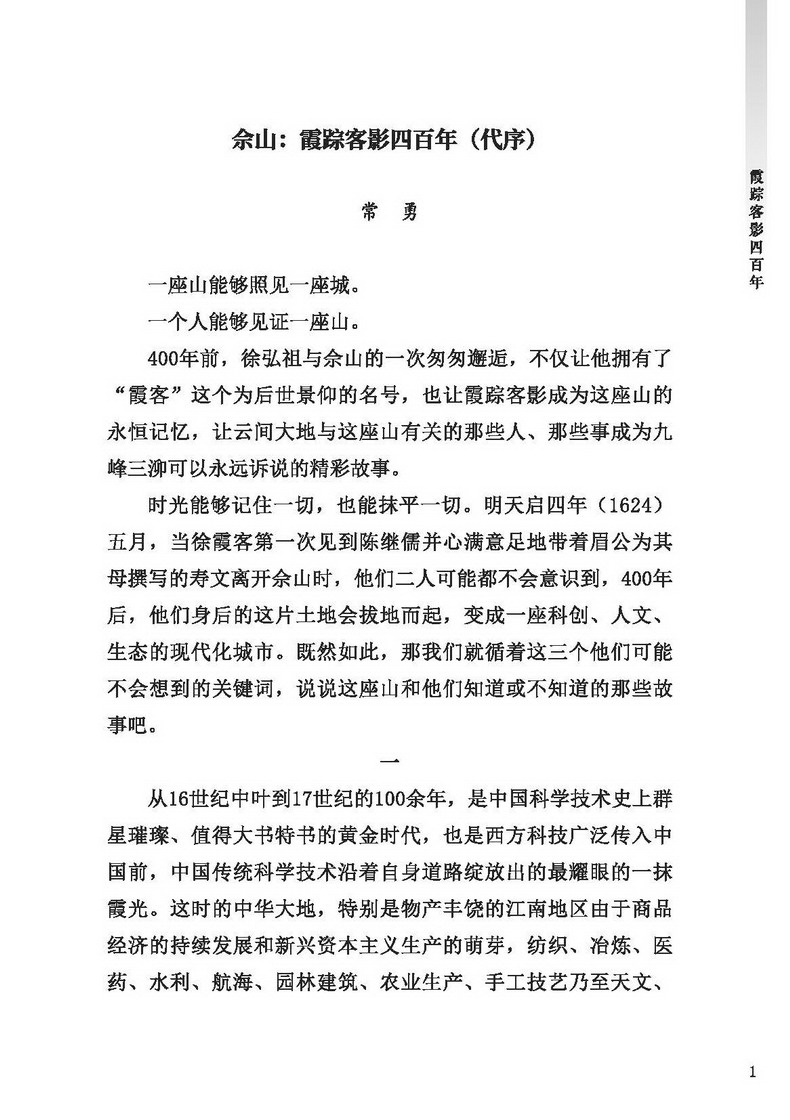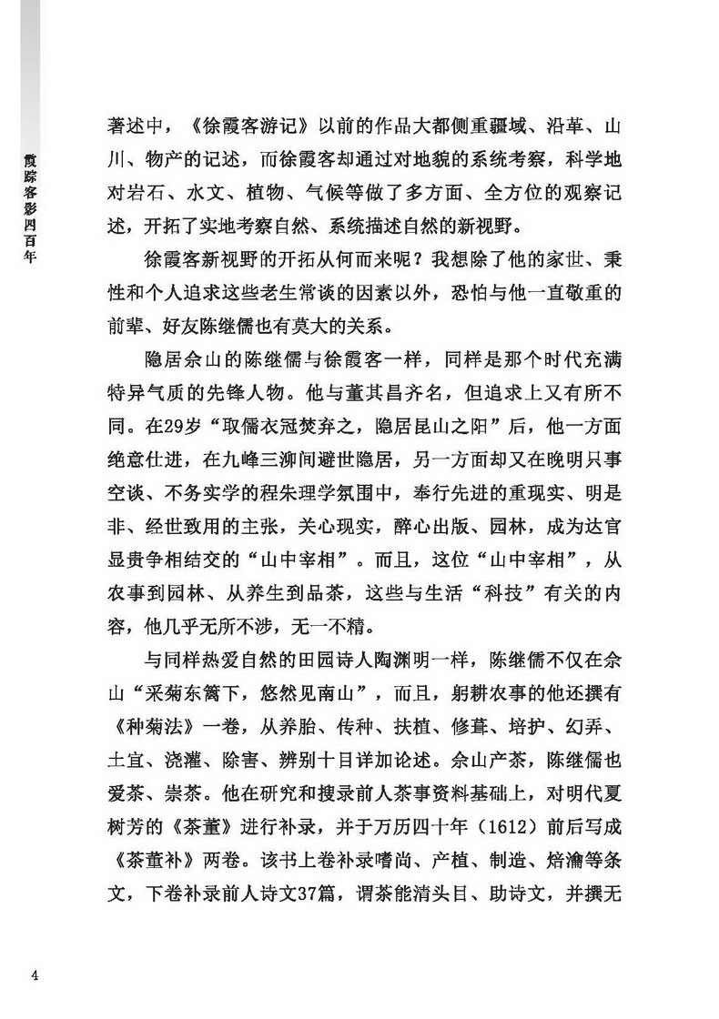 ;江山留胜迹,我辈复登临。综观《霞踪客影四百年》这本书,编著者力图通过一篇篇文章、一首首诗歌、一帧帧图片,沿着400年前徐霞客走过的足迹,来漫游一座山和一座城的史脉与文脉,去追寻背后的那些故事,擦亮一段记忆。