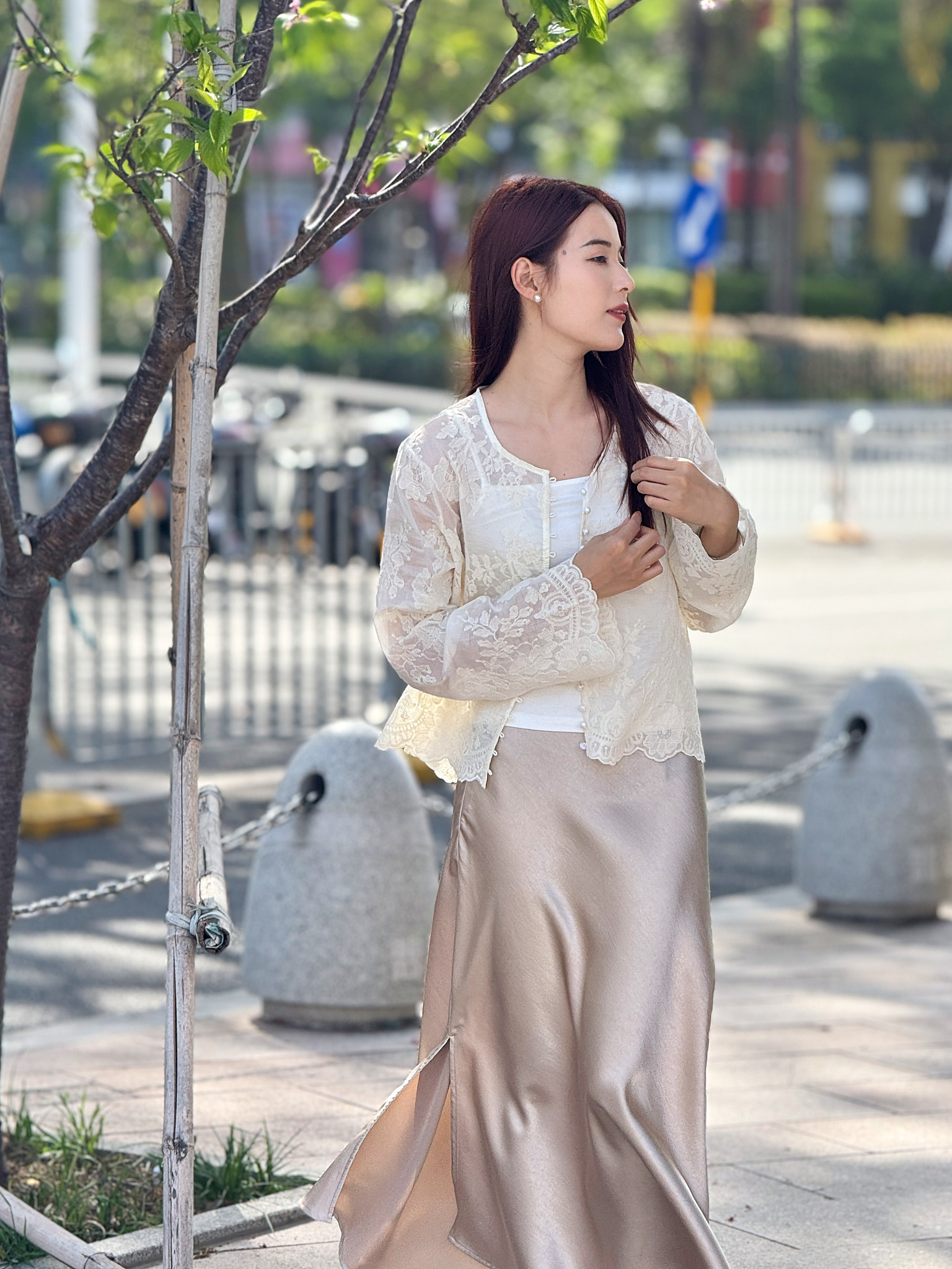 材质:波浪边天丝刺,绣上衣成分:30%天丝34.5%棉纱35.5%欧根纱,分裙成分:100%聚酯纤维