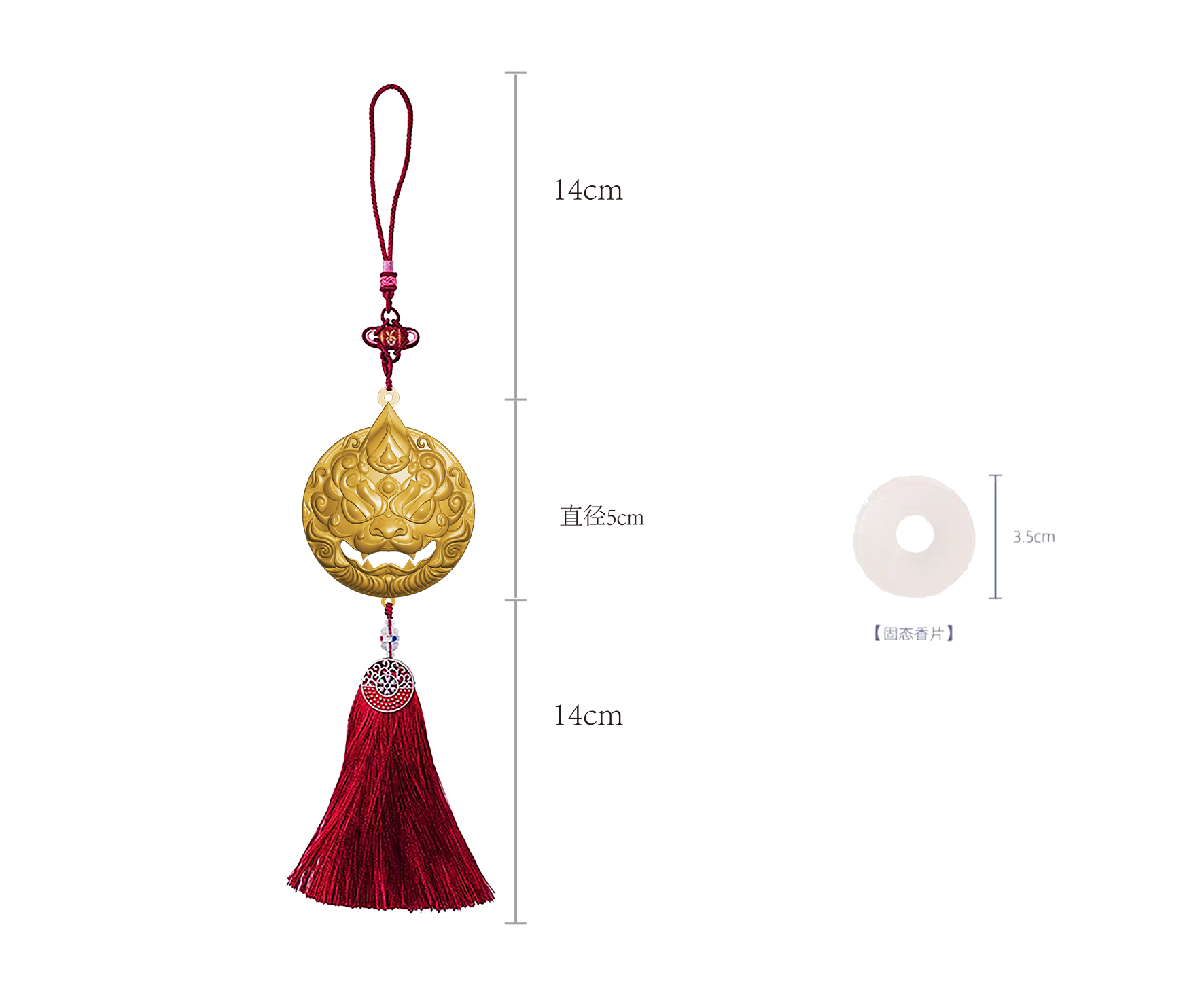 名称:廌行万里香薰车挂,材质:金属、流苏、铜版纸烫金包装盒,产品尺寸:330*50*15mm,包装尺寸:320*90*30mm,定价:128元