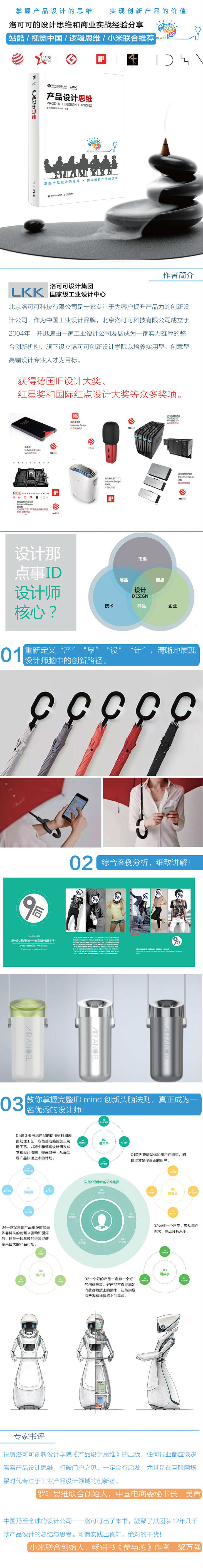 记得2011 年,就答应过出版社要写一系列关于设计的书,当时答应得特别痛快,觉得一年的时间怎么也能写一两本。每年出版社的负责人都催我一两次,问我写得怎么样了,我都在找不同的借口说还没完成。一晃就是5 年,发现真的一个章节都没写。做设计师二十多年了,创办洛可可也有12 年了,每年都有超过50 次演讲,获得几十个国内外奖项、几百个设计案例,其实出本书本应该不是一件难事,但最终发现自己是个懒人,没有把这些变成文字与大家分享。一个月前,洛可可创新设计学院的创始人王晓丹突然跟我说,她准备了半年,要为洛可可出第一本书,我惊讶地问她为什么要出这本书,她说实在看不下去出版社年年催我,而且成立设计学院4 年了,累计培养了两万多名设计专业学生,为知名企业与洛可可也累计输送了近两千多个优秀设计师,她希望通过设计学院来出一本书,来把这12 年在洛可可的经验、案例、奖项做个总结,分享给洛可可近千名设计师和更多的人。昨天晓丹还跟我商量这本书的名字,我说就叫《产品设计思维》吧,因为前两年有太多的人讲互联网思维,洛可可创新设计学院作为一家设计公司,我希望让更多的人去了解设计思维,让更多的产品经理和设计师了解如何用互联网的理性思维和设计师的感性思维打造出完美的产品。这两年演讲我一直在讲设计思维,它与互联网思维的共同之处,都是以用户为核心、从用户的需求出发,但不同是,互联网思维强调连接和数据,设计思维更强调美学和创造性。我个人认为互联网思维相对更理性,而设计思维更感性。我经常说,互联网思维像一杯凉水,在炎热的夏天喝下去非常痛快并解渴;而设计思维像一杯热水,在寒冷的冬天带给我们温暖和关怀。很多人问我设计思维最重要的是什么,我说是想象力。一个产品从无到有,从设计师笔下的作品到工厂制造出的产品,到进入市场的商品,再到消费者手上的用品,最后被作为废品回收,所有产品的生命周期都像我们孕育一个新生命一样充满想象力和灵感。很多刚入行的设计师问我,灵感到底来自于哪里,关于灵感本书里总结了4 字——看、思、学、做,设计师应该从美学的角度去捕捉一切美好的事物,思考如何让世界变得更美好,更多地学习、掌握设计的技能与设计思维,动手创作出一件件美妙的作品。其实设计没有那么难,设计师本就是借助器物之美,在点、线、面中修行的人,设计师的生存法则,就是通过自己的眼与手,创造美好的事物。其实这本书也做不到全面地阐释设计思维的真谛和洛可可几千款产品的经验,但我真心地感谢晓丹和老孟,以及学院的伙伴们,用自己近半年的业余时间,写出这本书,我相信这一定是一个很好的开始,我期待洛可可创新设计学院的系列设计丛书的逐一到来。这也有利于鞭策我这个懒人,加快我的处女作尽快与大家见面。