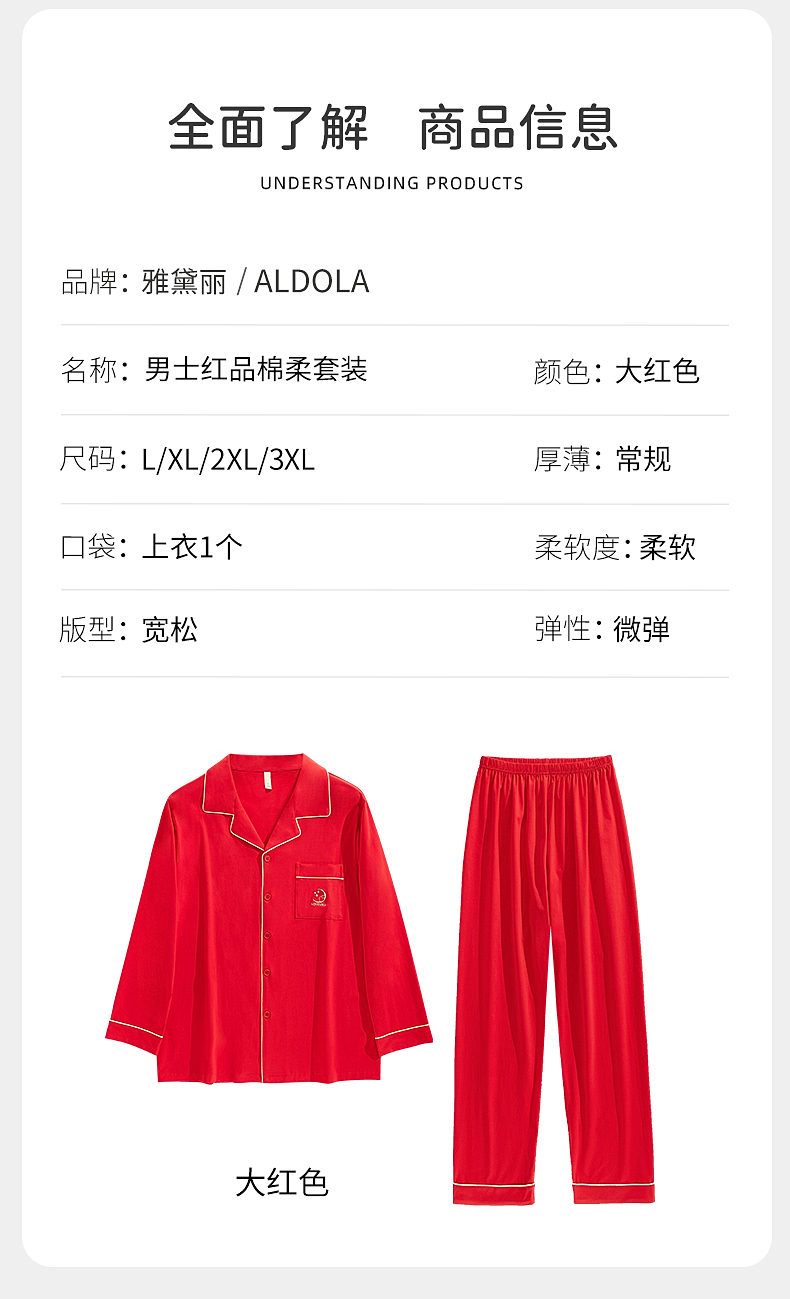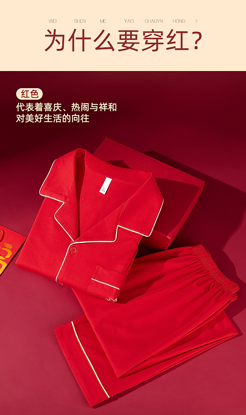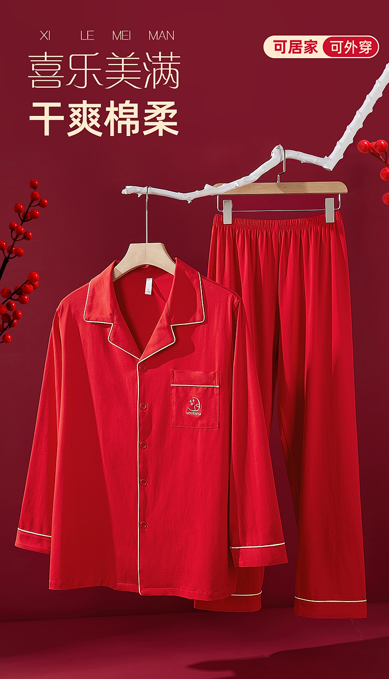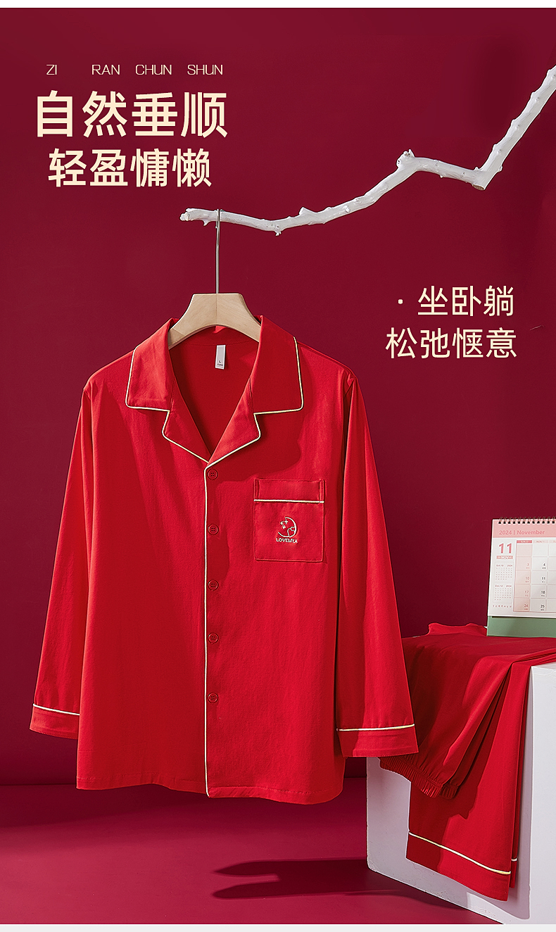 雅黛俪男士家居服套装结婚喜庆大红色本命年长袖长裤居家