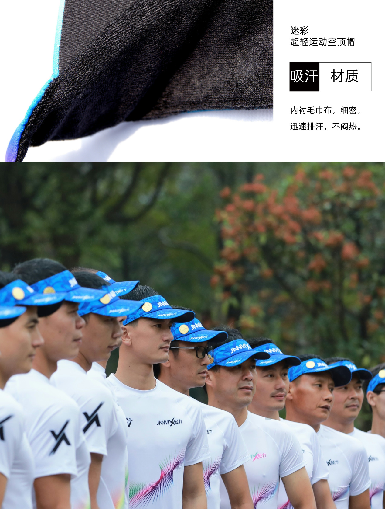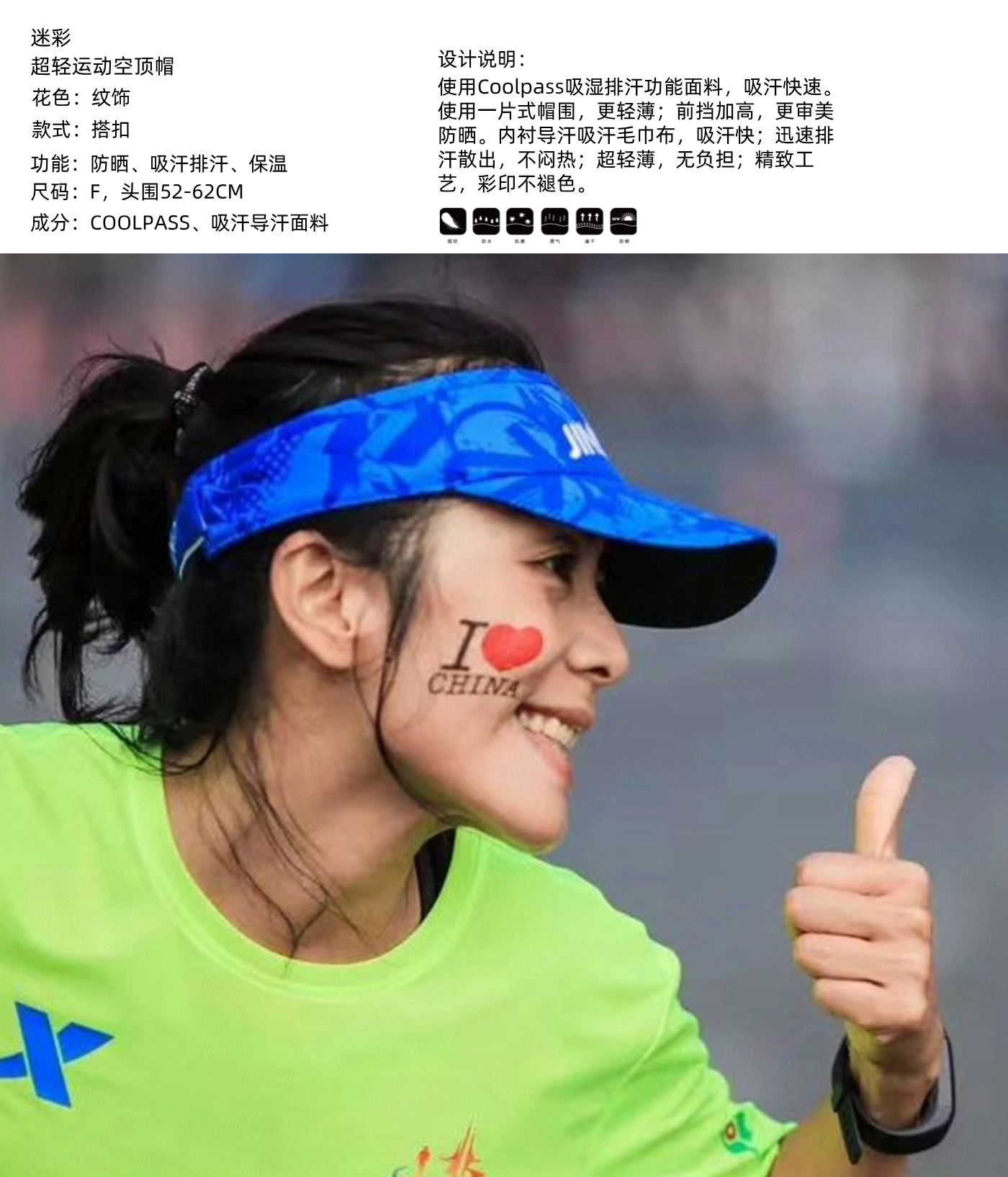 使用coolpass吸湿排汗功能纱线,具有抗霉菌功能。轻芯、细纤维制作,不褪色,不变形。前挡内层为毛巾布及吸湿排汗工艺,排汗快,透气舒适。细腻印花与刺绣,细节无忧。