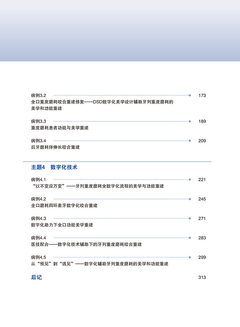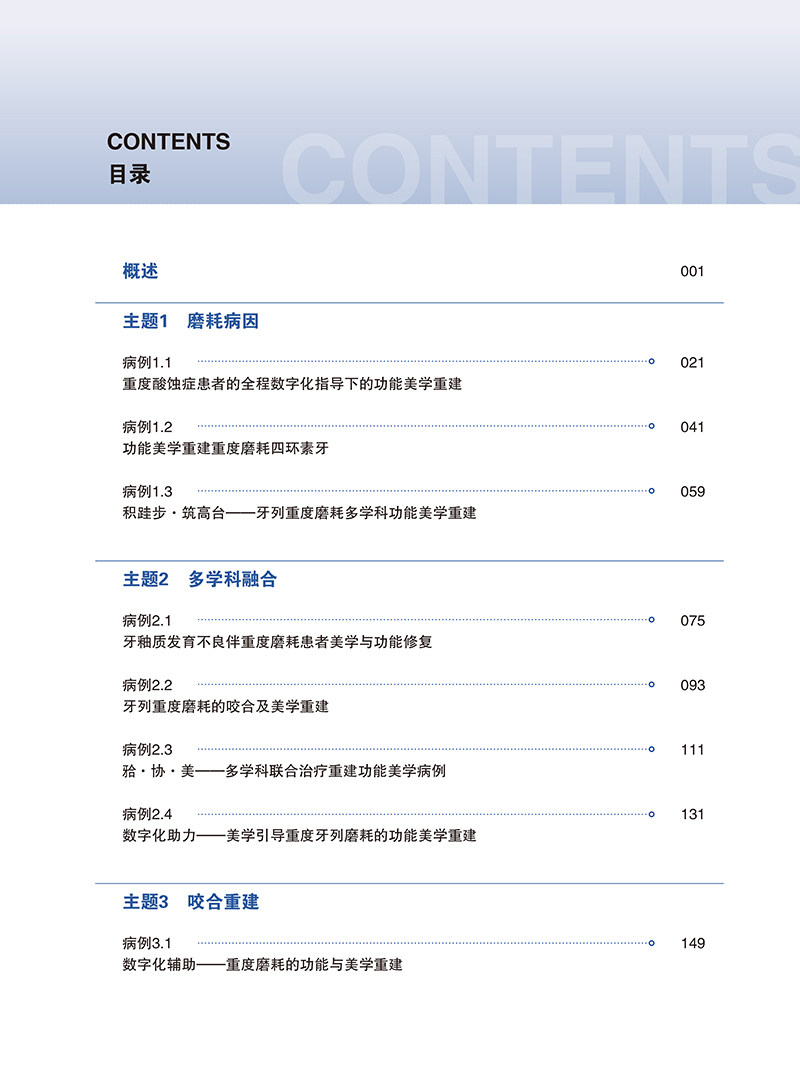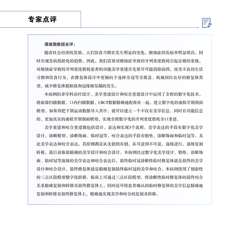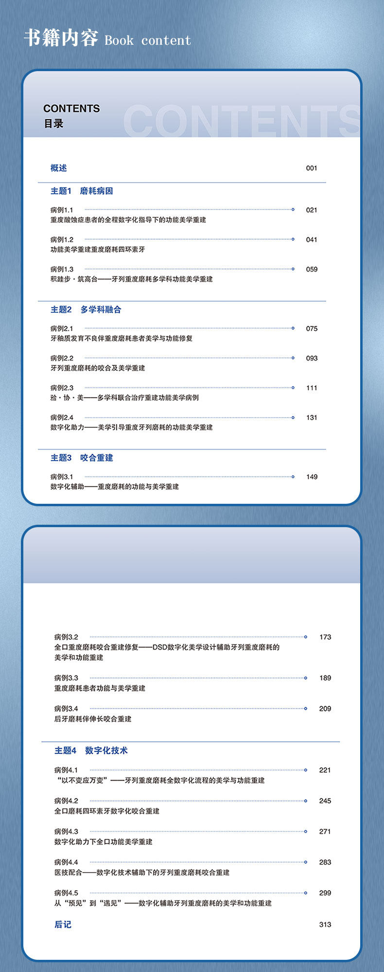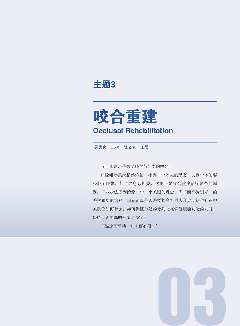 牙列重度磨耗是一种口腔临床常见的牙齿硬组织非龋性疾病,表现为全牙列或牙列中多颗牙,牙体表面硬组织明显缺损,牙列重度磨耗严重影响患者的口腔功能和美观。牙列重度磨耗的病因复杂且鉴别诊断困难、磨耗类型多样,修复重建涉及多个学科,不仅需要全口美学重建,还需要全口功能重建。本书病例都是作者运用八步法序列治疗技术完成的临床遇到的牙列重度磨耗复杂病例,每个病例都做到了病因诊断正确、治疗设计 、操作过程精准、治疗效果优良。病例分析设计脉络清晰、过程技术细节详尽、问题讨论启发引导,努力帮助读者理解和掌握八步法序列治疗体系。