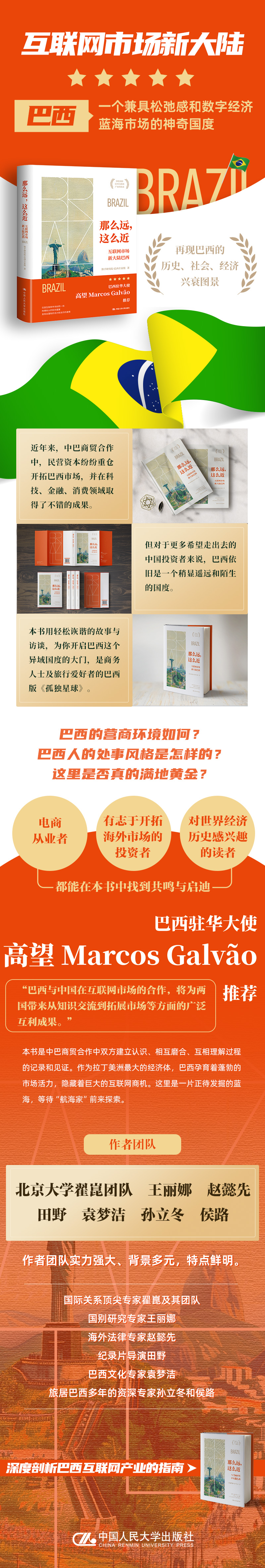 正如巴西驻华大使高望在推荐本书时所言:“巴西与中国在互联网市场的合作,将为两国带来从知识交流到拓展市场等方面的广泛互利成果。”相距万里的中国与巴西,跨越半个地球选择彼此,本书正是中巴商贸合作中双方建立认识、相互磨合、互相理解过程的记录和见证。作为拉丁美洲最大的经济体,巴西孕育着蓬勃的市场活力,隐藏着巨大的互联网商机。这里是一片正待发掘的蓝海,等待“航海家”前来探索。
