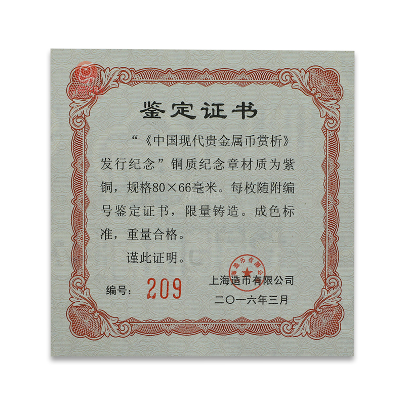 2016年,为纪念《中国现代贵金属币赏析》发行,上海造币厂发行了两枚铜章,分别是黄铜和紫铜材质。