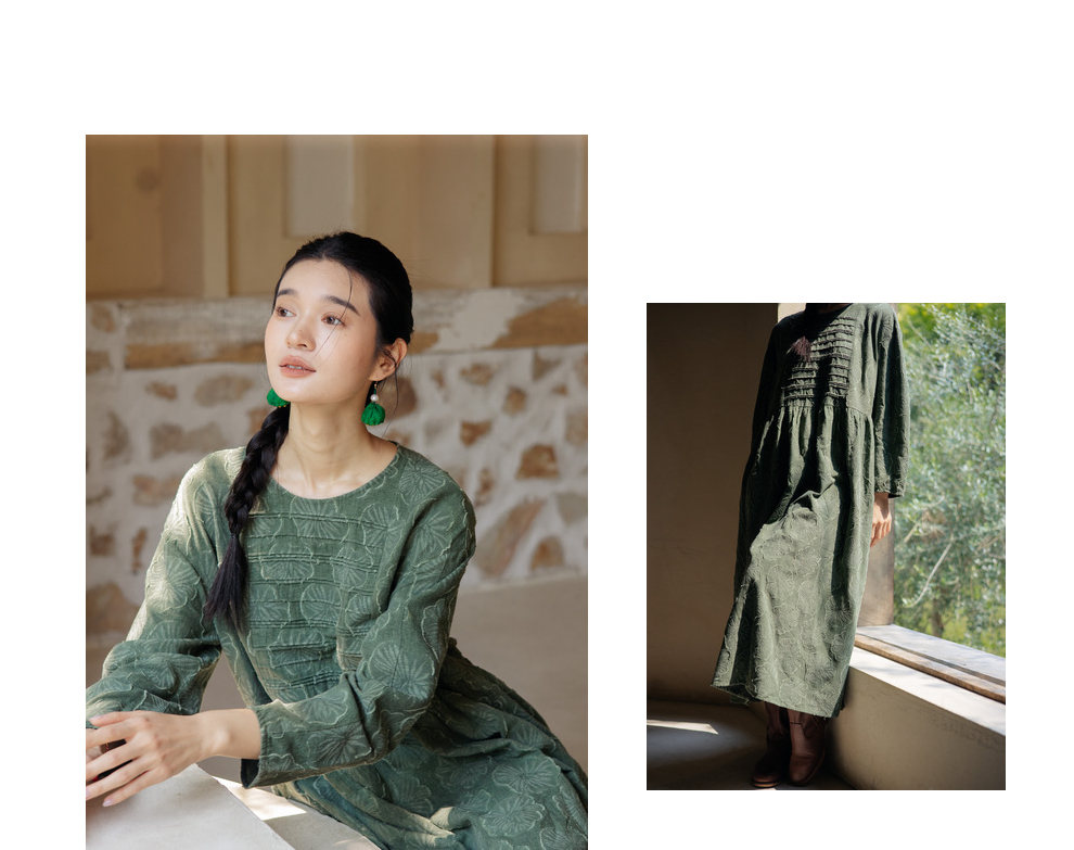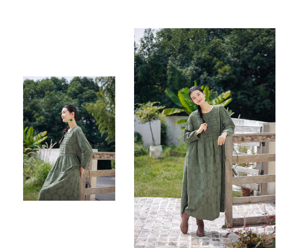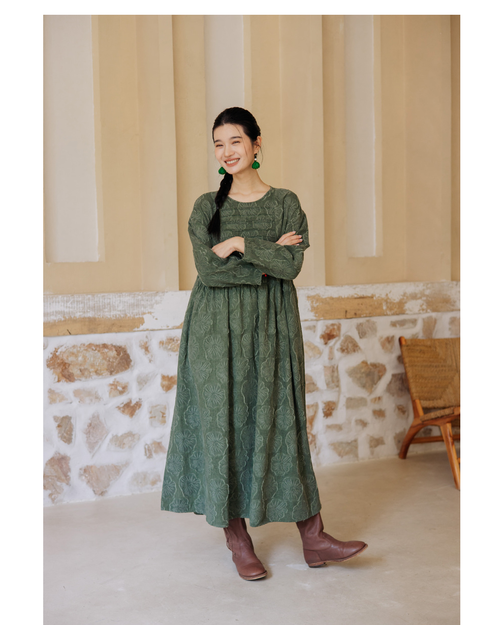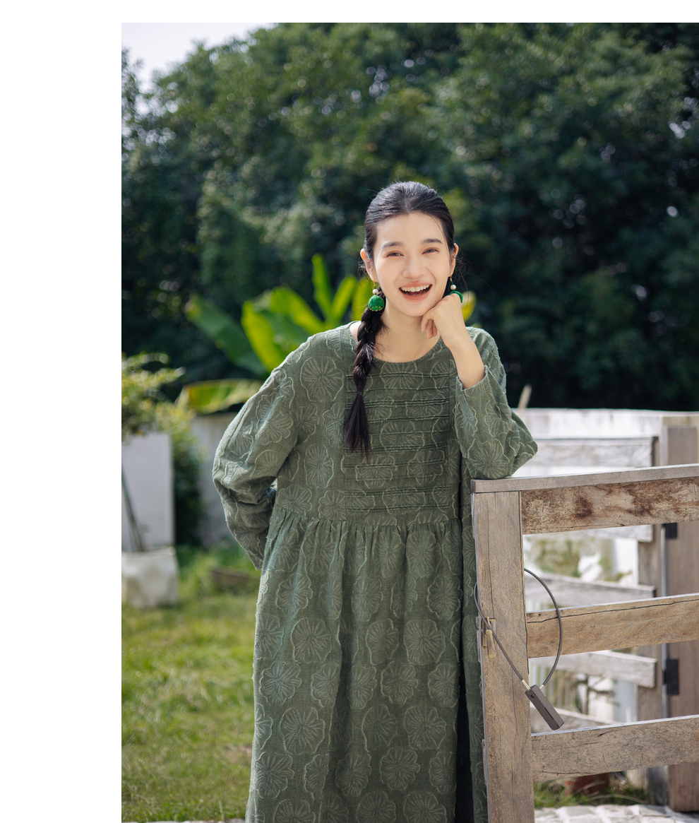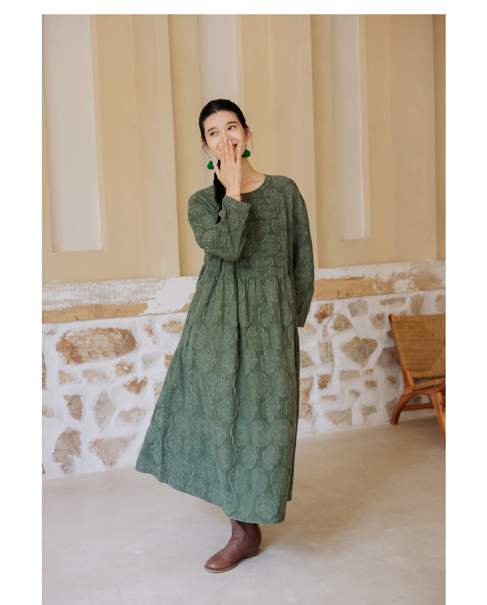 绽放旅行女装143朵/重磅棉麻花朵提花细塔克长袖经典百搭连衣裙