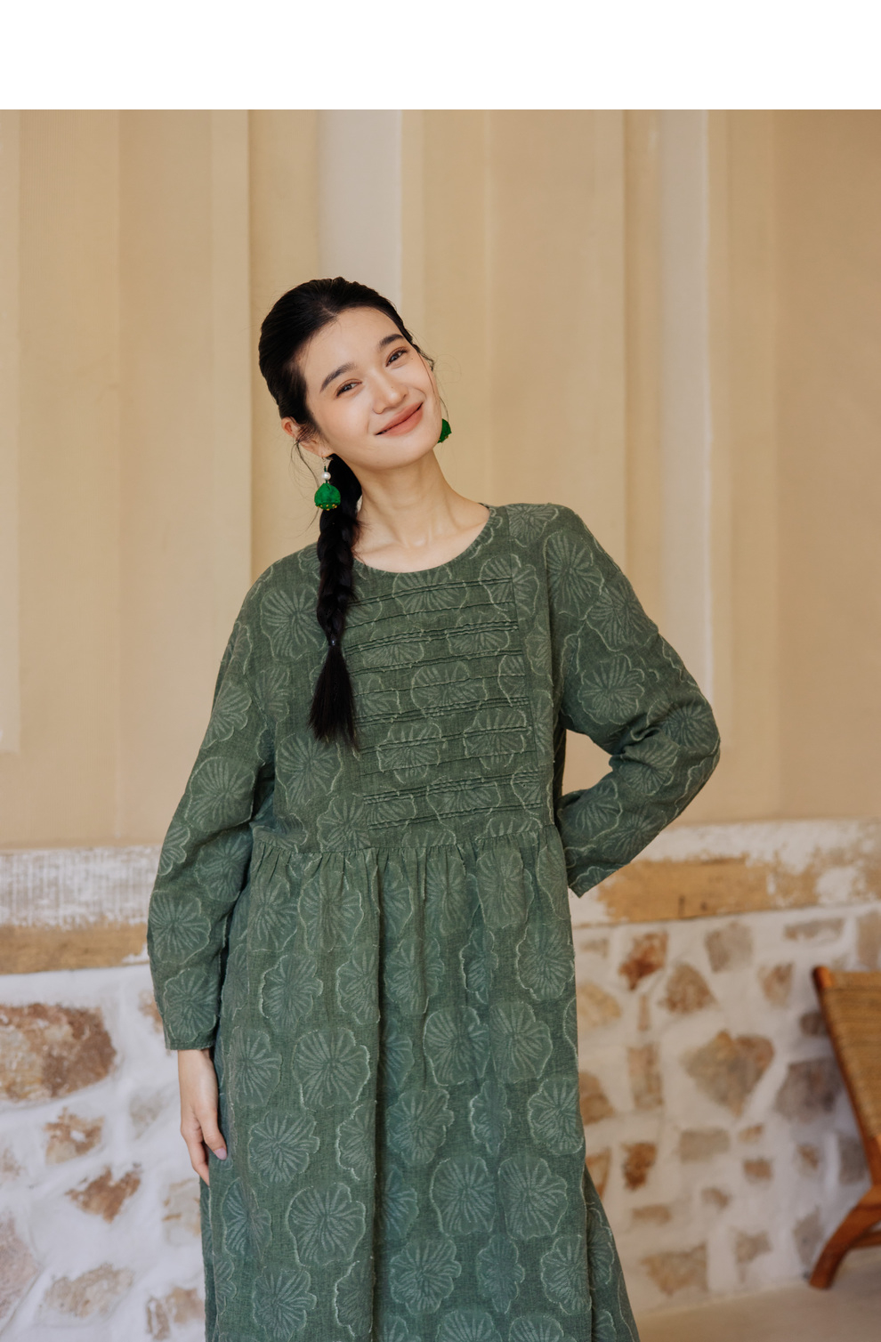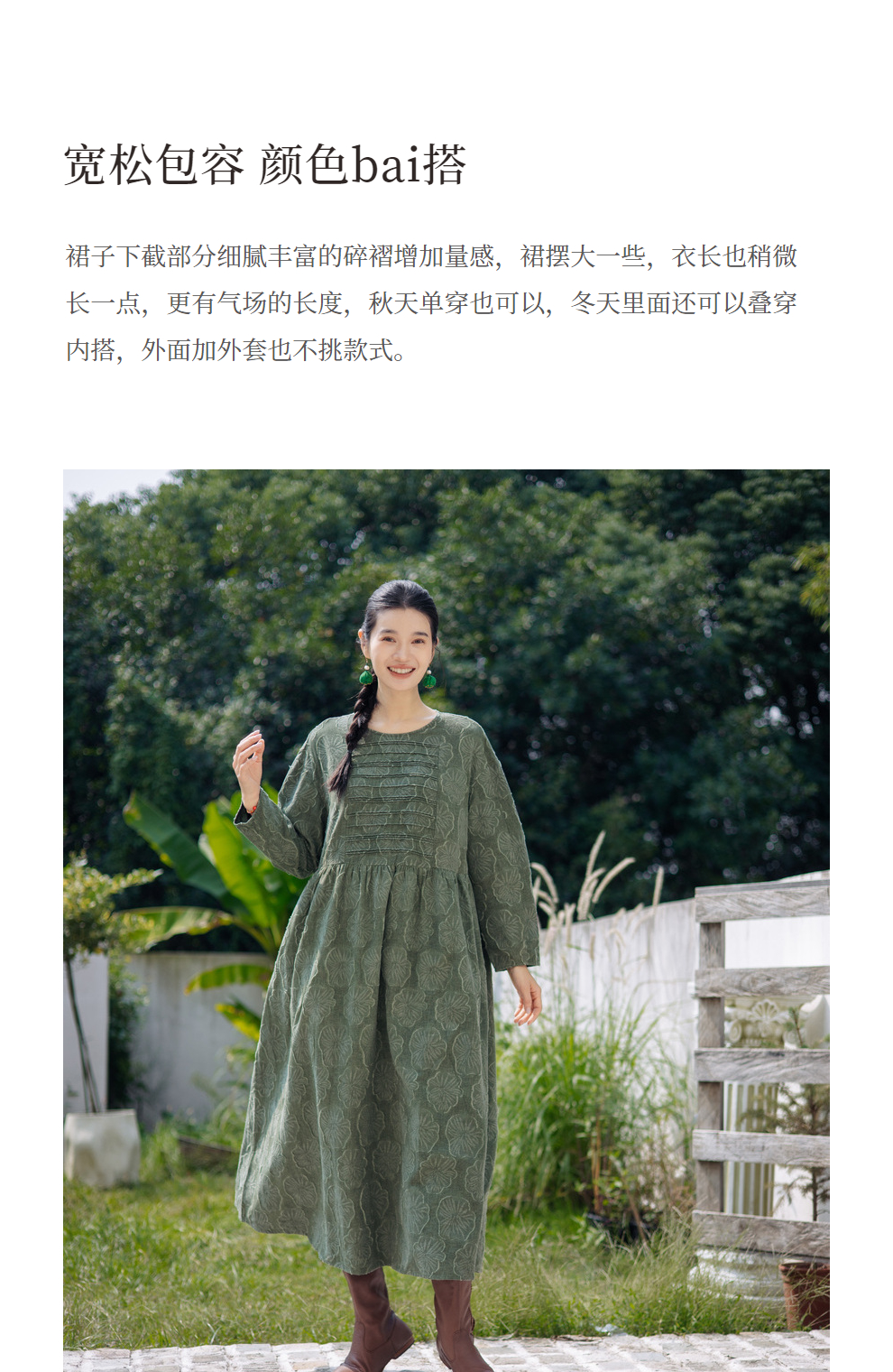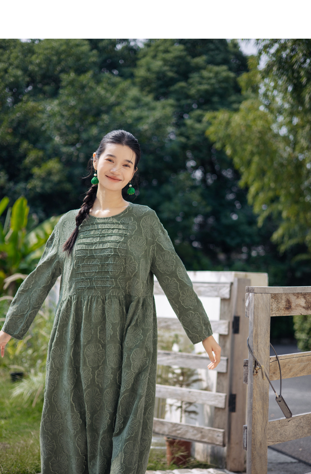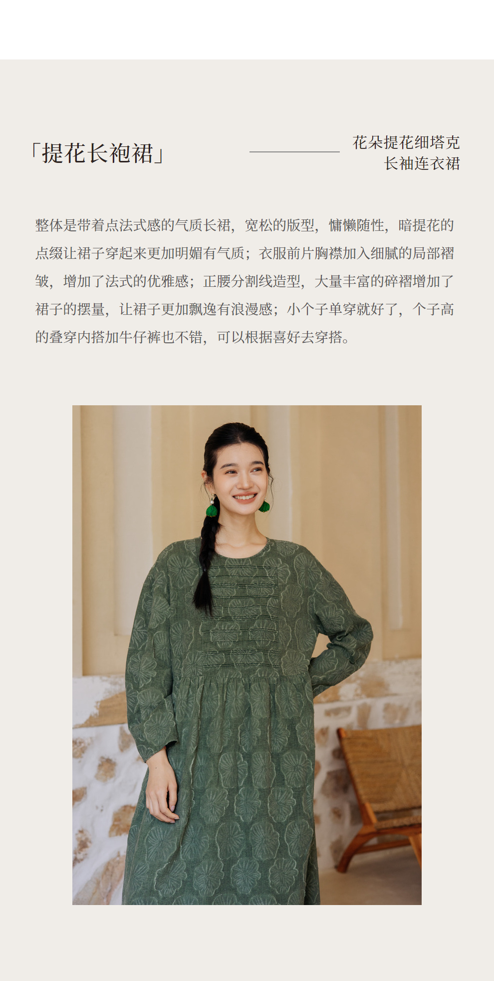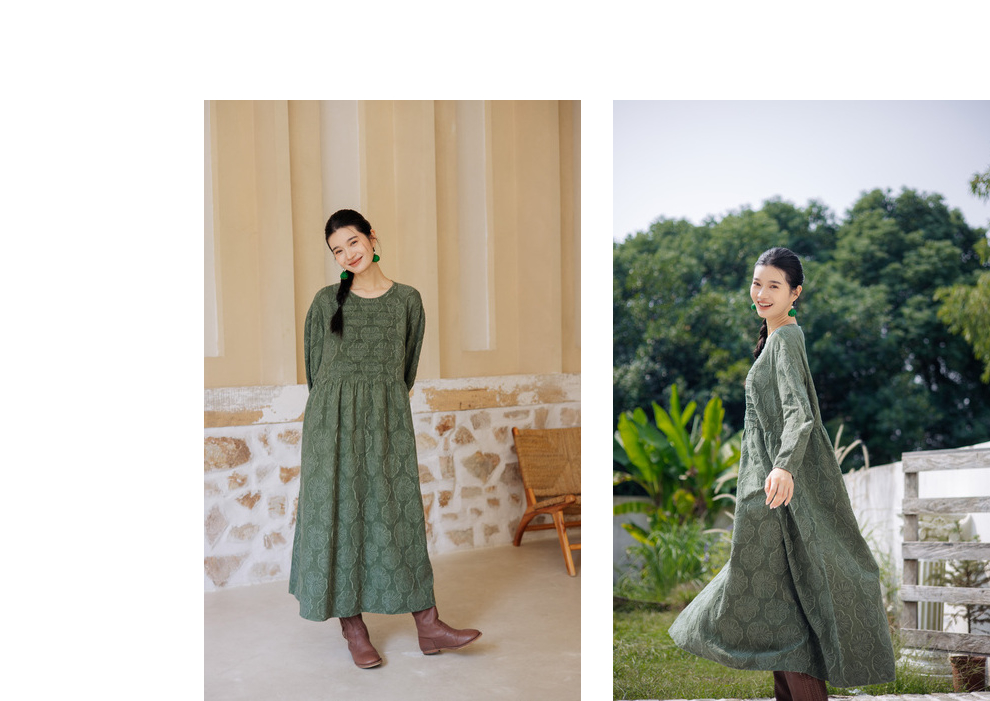 绽放旅行女装143朵/重磅棉麻花朵提花细塔克长袖经典百搭连衣裙