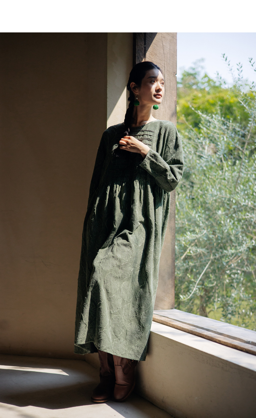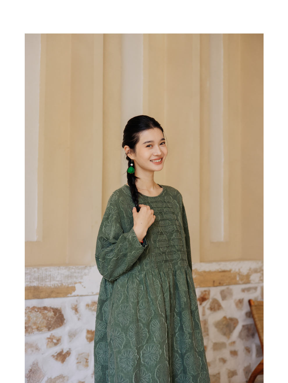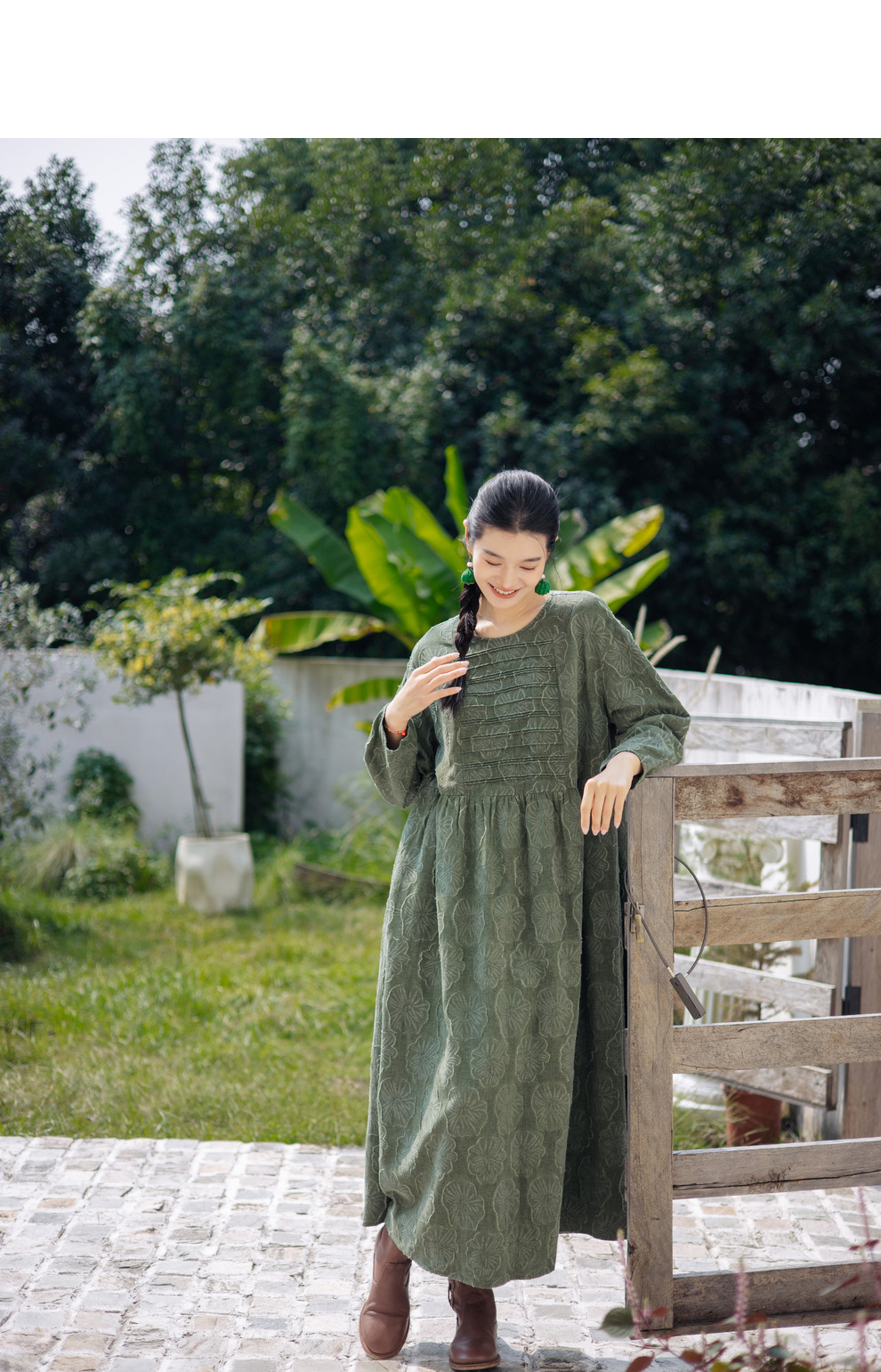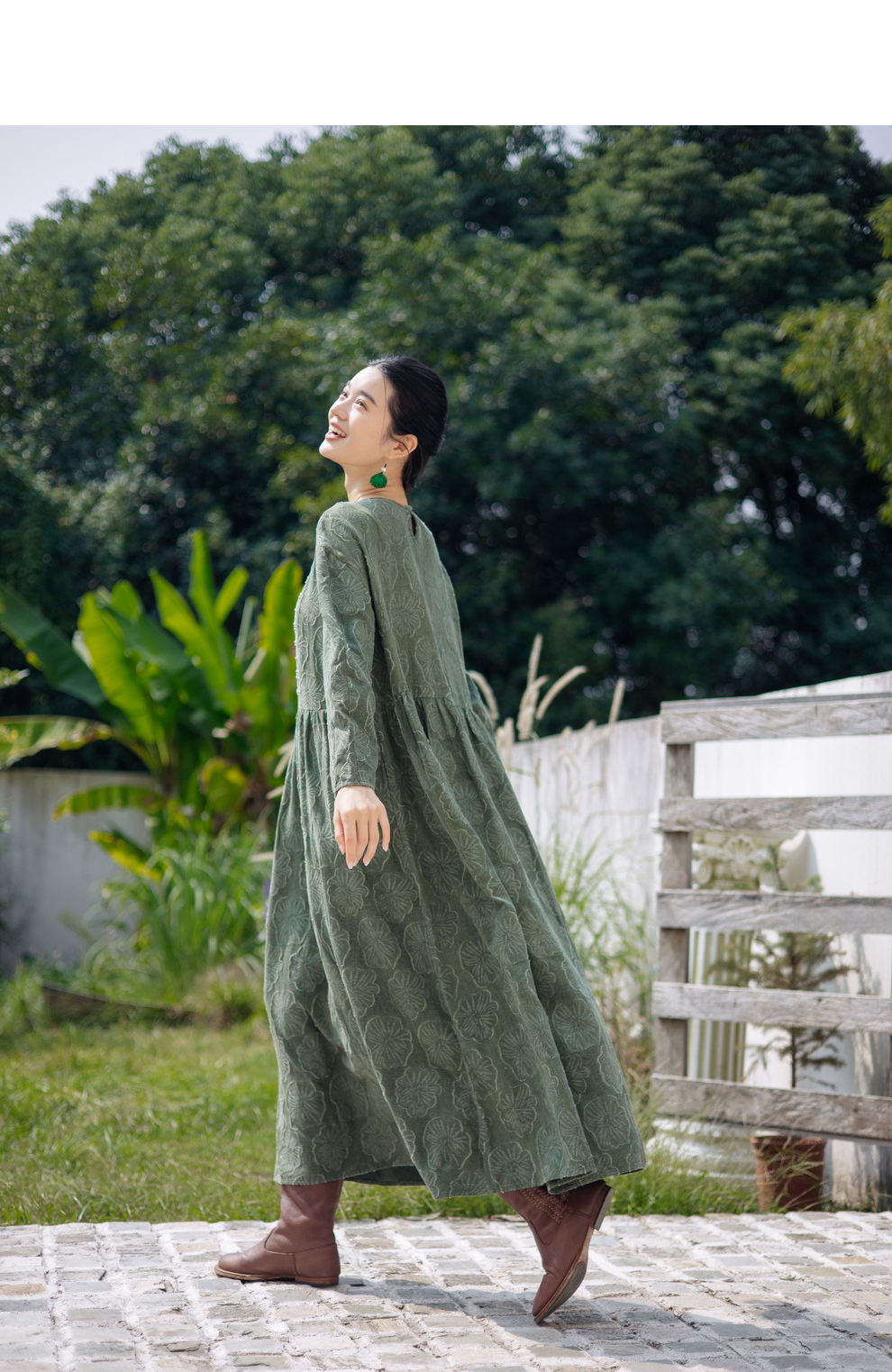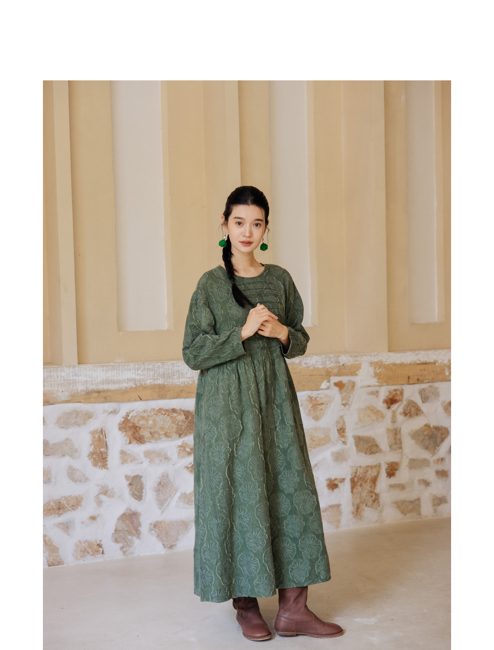 绽放旅行女装143朵/重磅棉麻花朵提花细塔克长袖经典百搭连衣裙