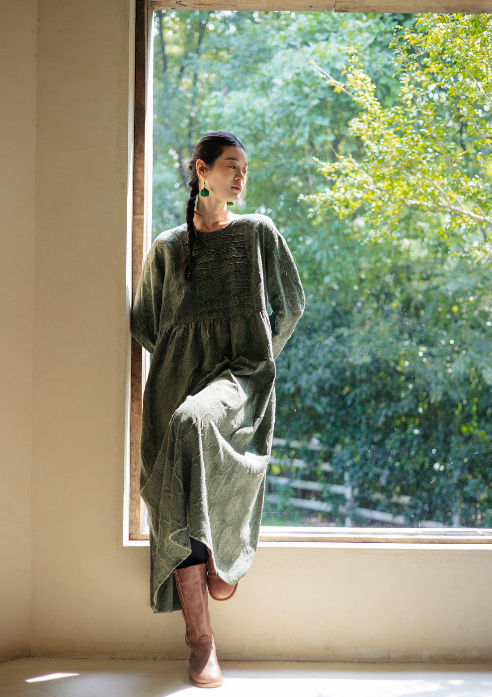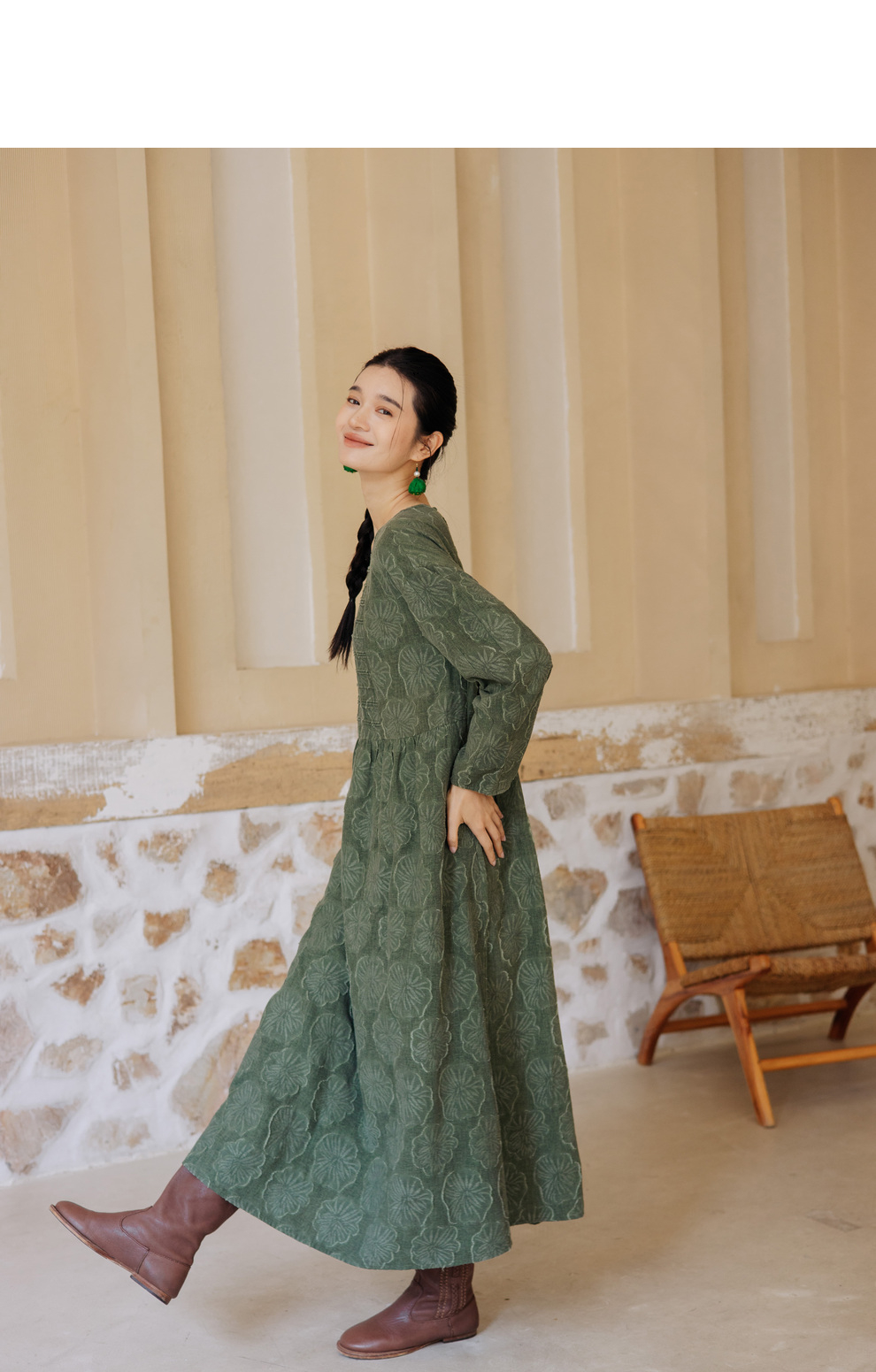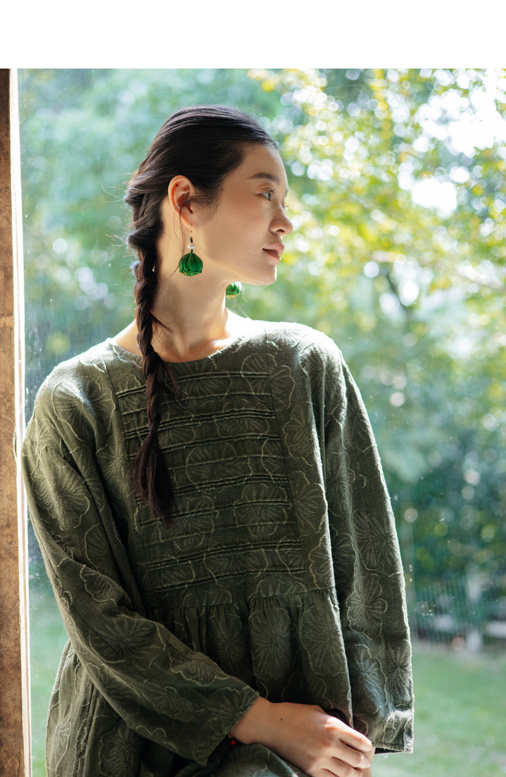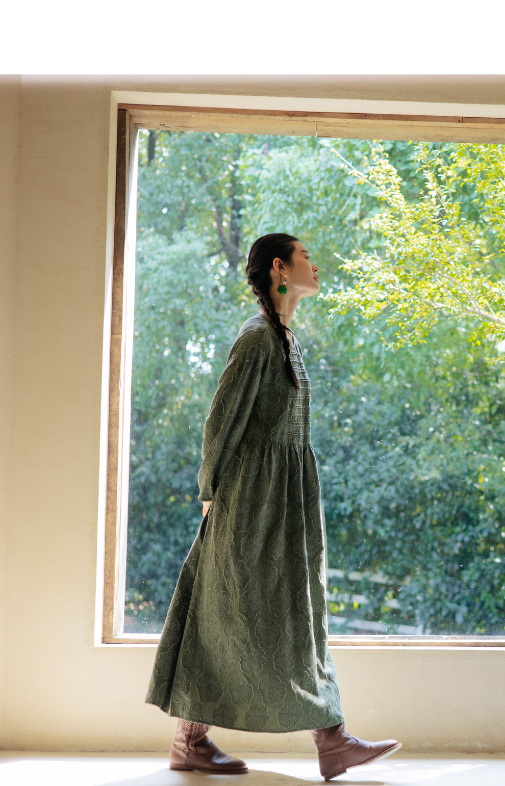 绽放旅行女装143朵/重磅棉麻花朵提花细塔克长袖经典百搭连衣裙