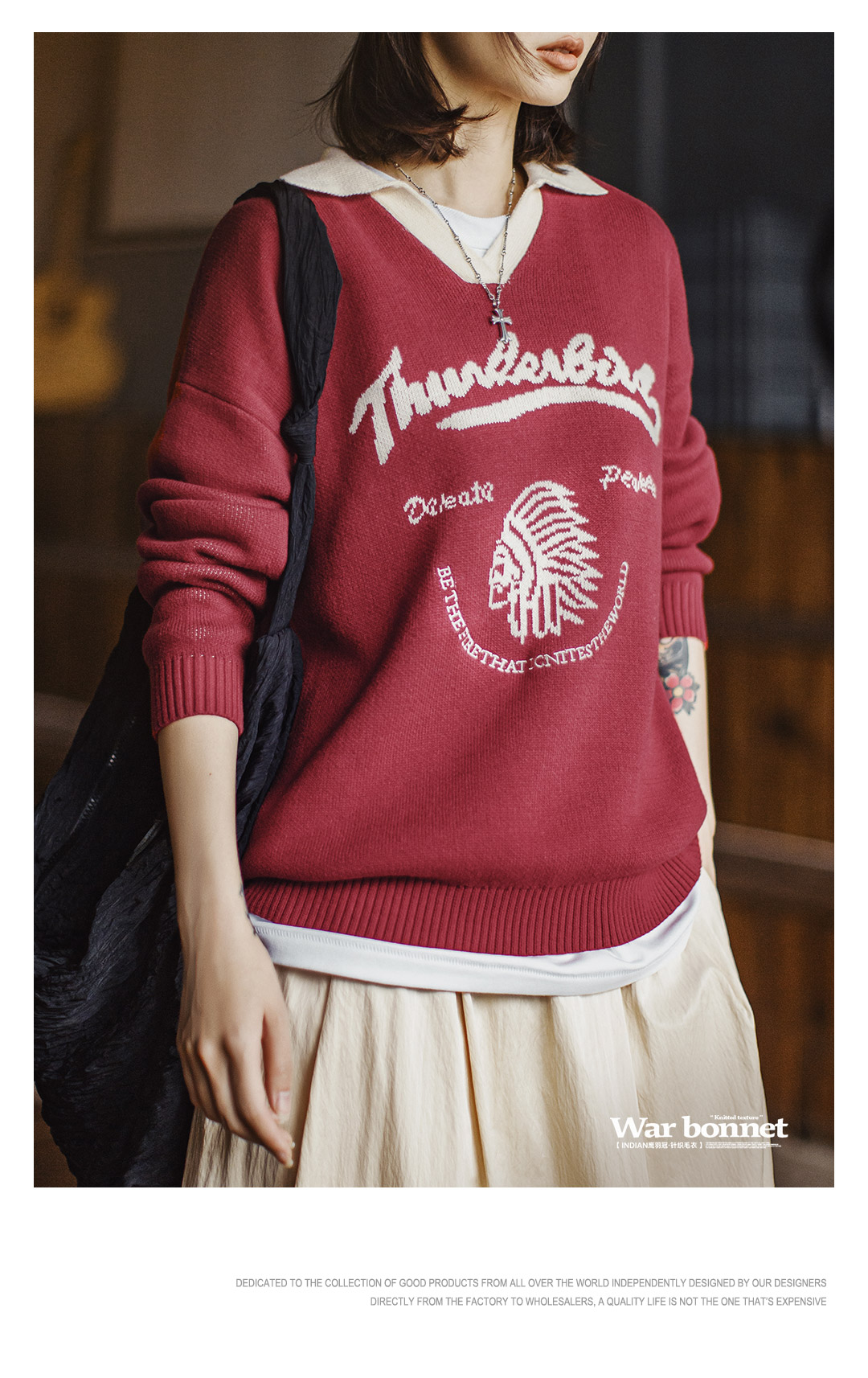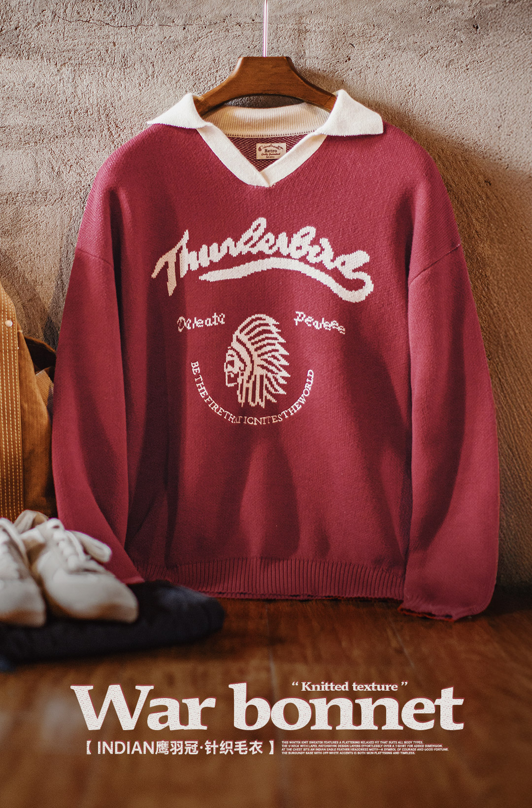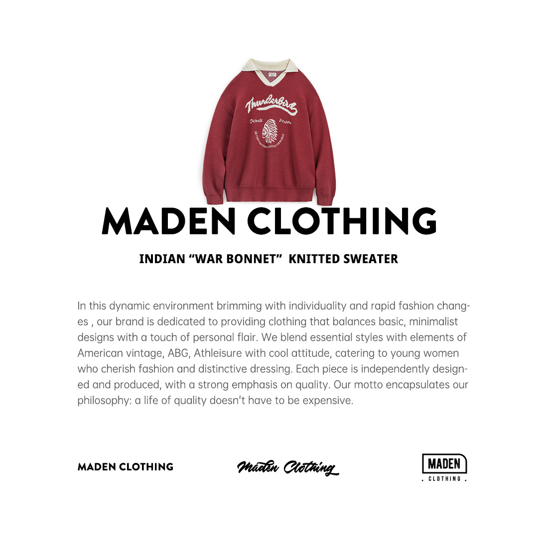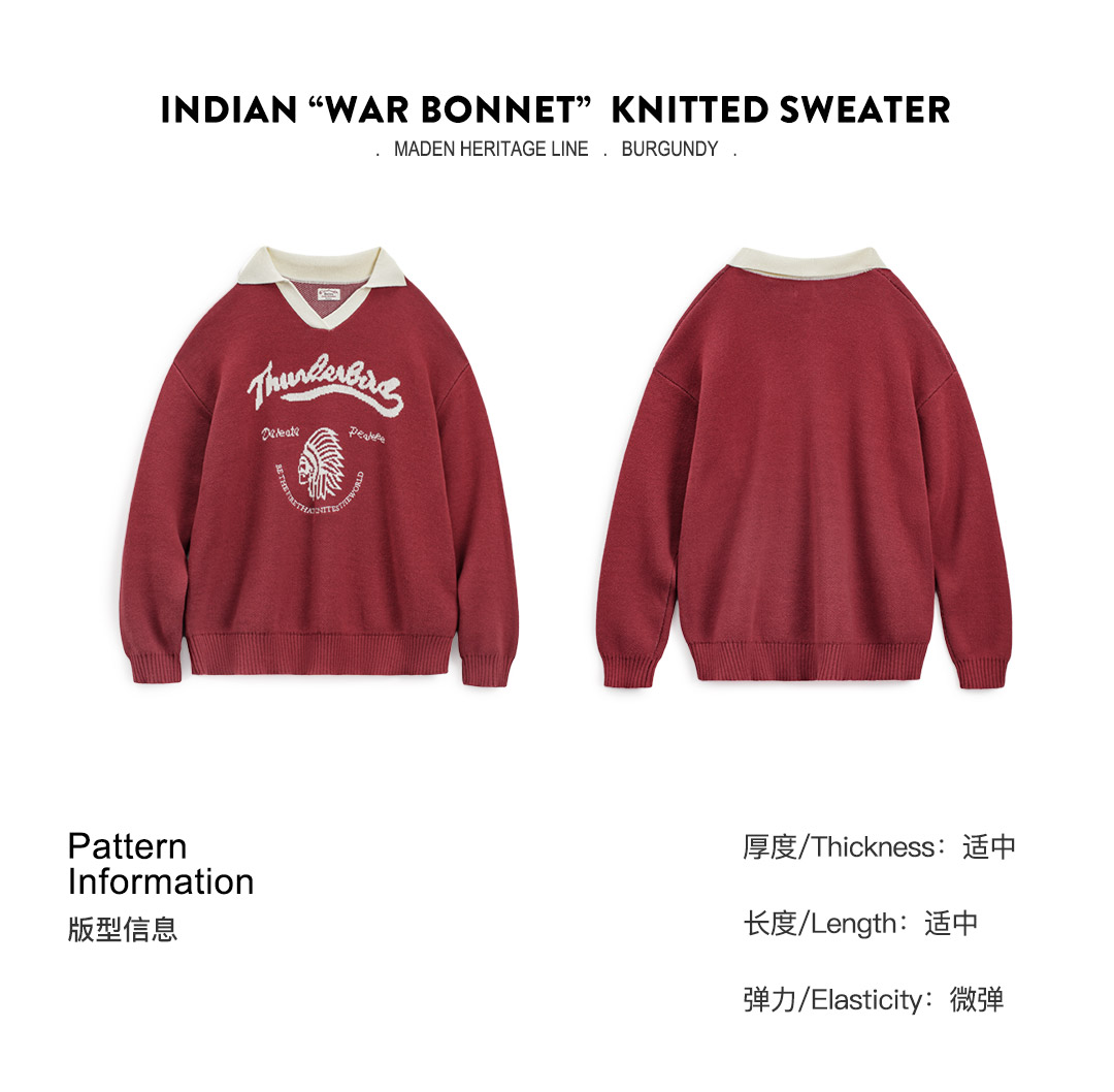 马登复古酒红撞色V翻领宽松套头提花保暖加厚毛衣针织衫上衣女冬