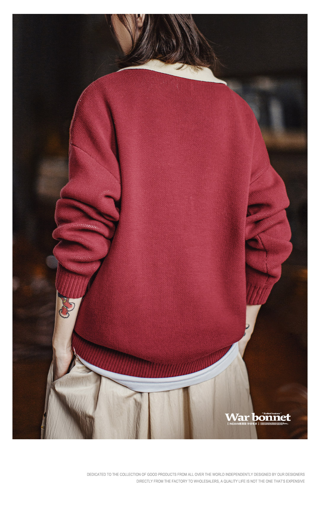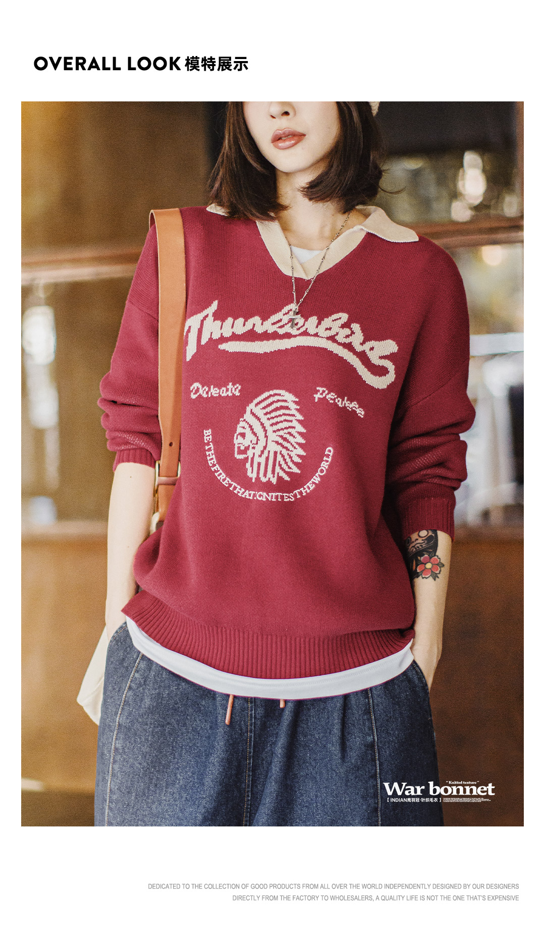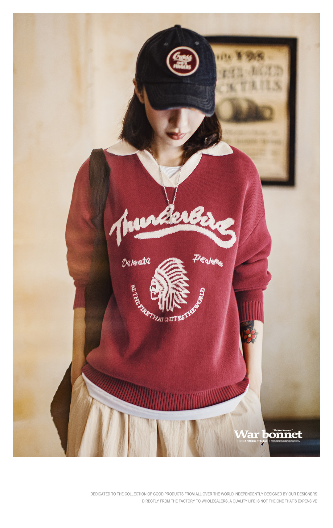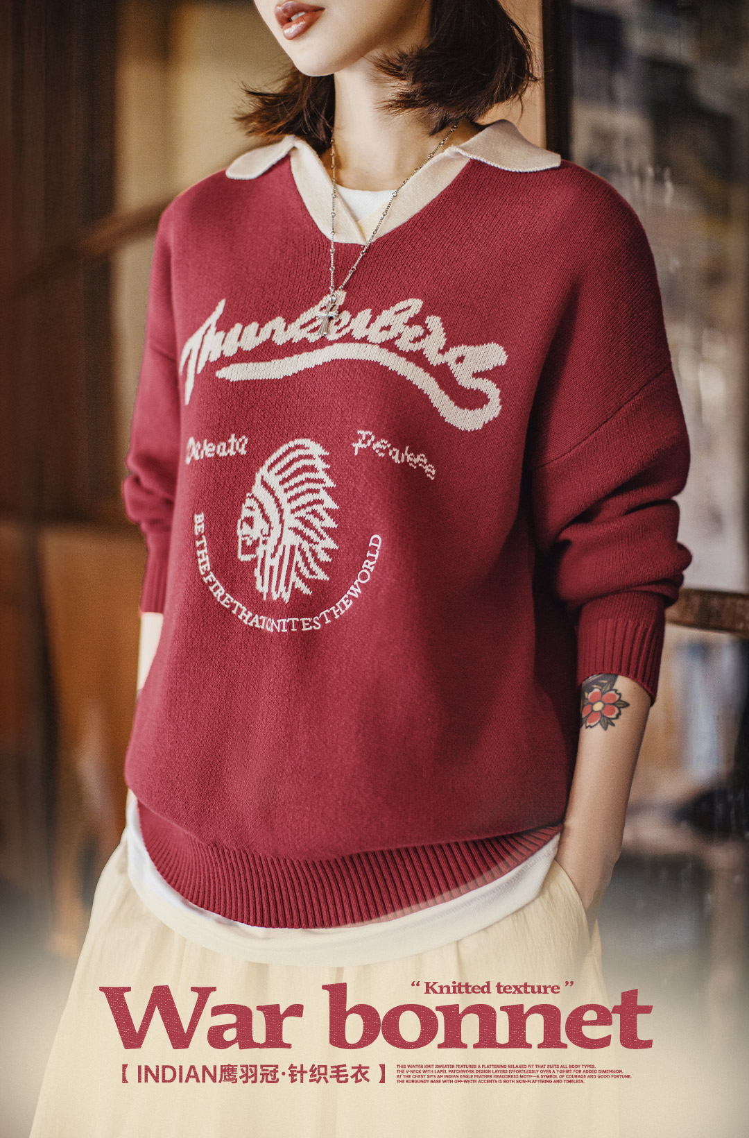 马登复古酒红撞色V翻领宽松套头提花保暖加厚毛衣针织衫上衣女冬