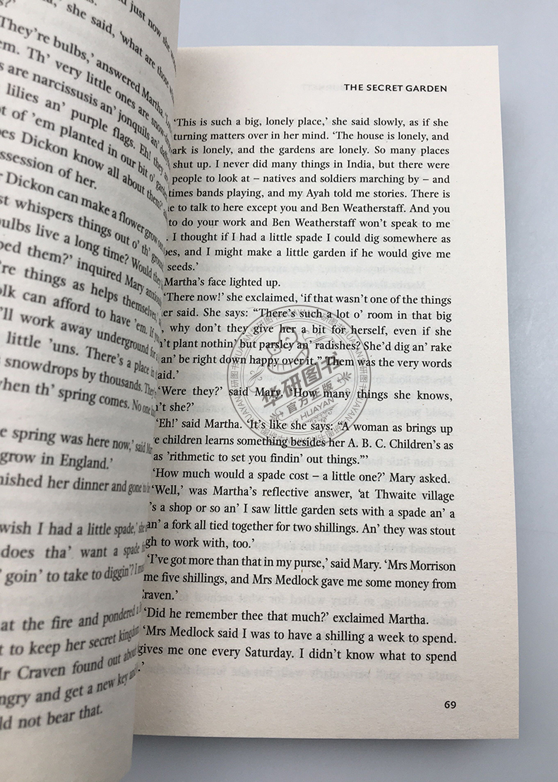 The Secret Garden《秘密花园》主要讲述了一个任性而孤僻的富家小女孩玛丽因为一场突来的瘟疫变成了孤儿,被送往英国一处古老庄园里的亲戚家中收养。在幽僻宁静的乡野和淳朴的乡人中间,她的性情渐渐变得平易。一天深夜,循着神秘大宅长廊一端传来的隐隐哭声,她被带到了一个同样古怪而孤独的小生命面前。玛丽的表兄,大宅的少主人科林生来体弱,长年卧病在床,性情乖戾难测。为了帮助科林,玛丽带他进入了庄园里被关闭多年的秘密花园。孩子们在生机蓬勃的小天地里不受干扰地玩耍,学会了友爱待人,恢复了纯真快乐的天性。