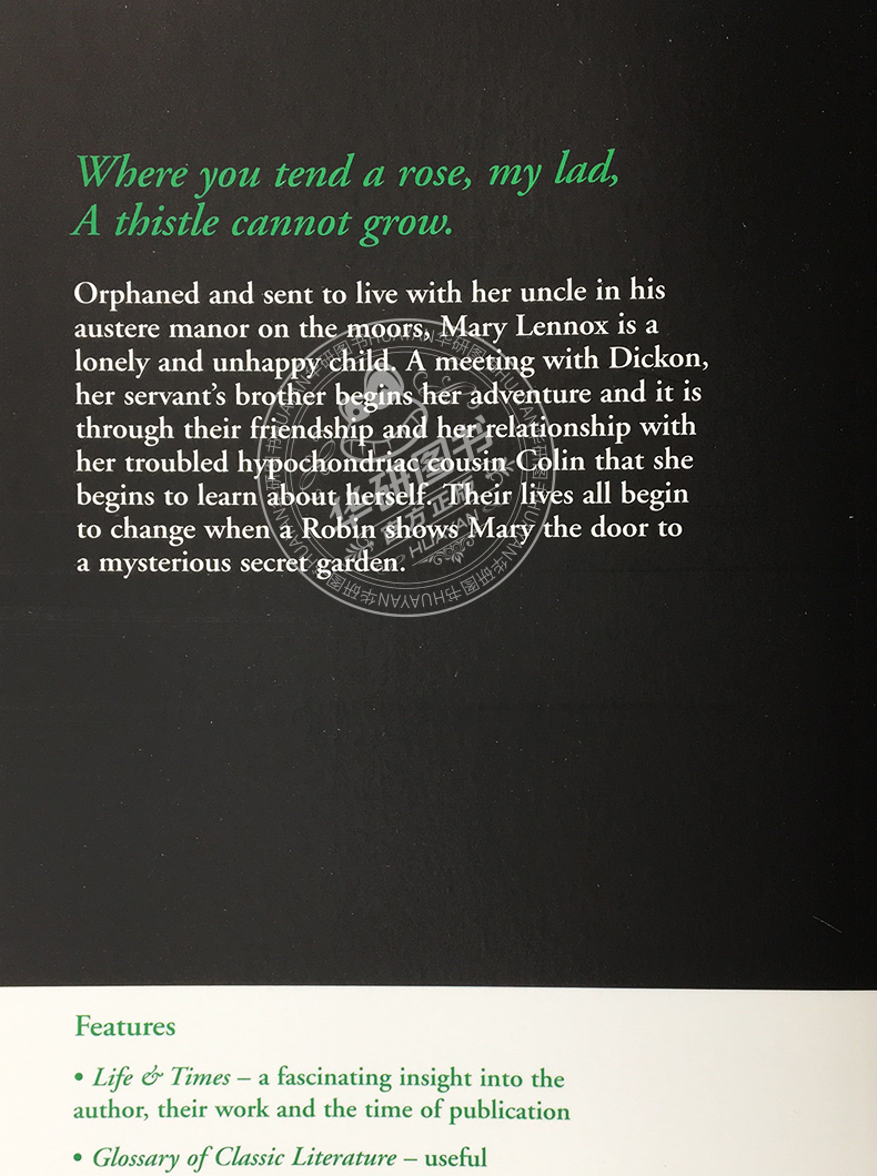 The Secret Garden《秘密花园》是美国儿童文学作家伯内特夫人经典代表作品,一百多年来,被翻译成50多种语言。小说以秘密花园的“复活”阐释了现代社会人们的精神旅程,旨在告诉我们当面对挫折和痛苦时,要学会开启心灵的秘密花园,是成长必读书籍。