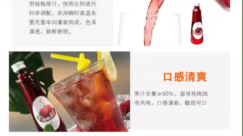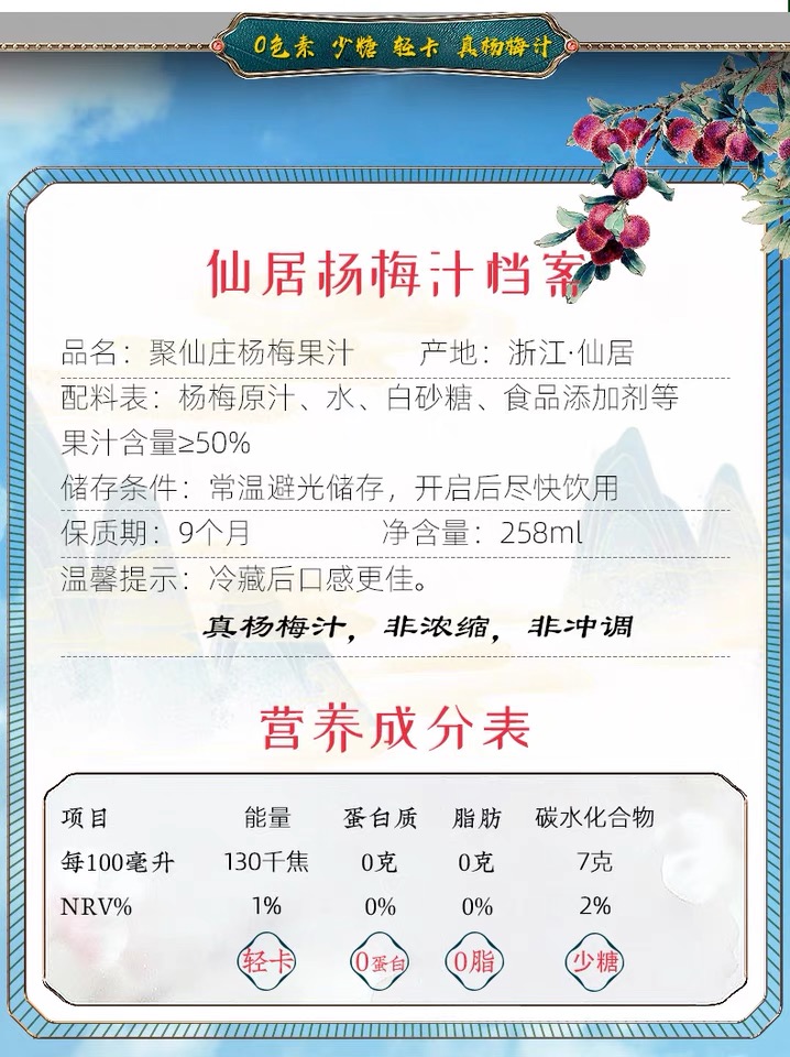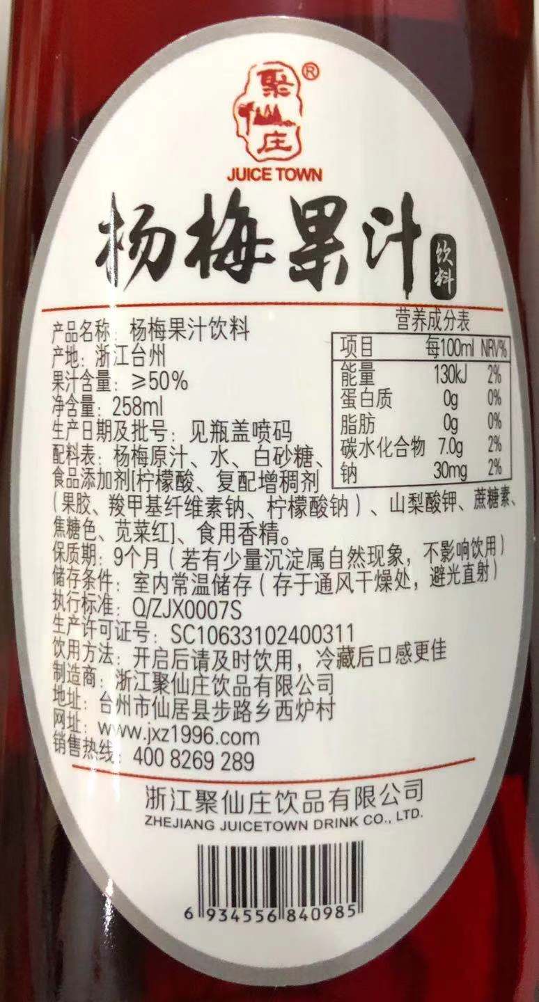 聚仙庄仙居杨梅汁果汁饮料258ml*6瓶