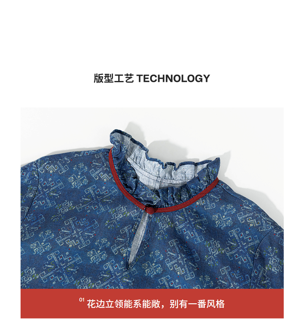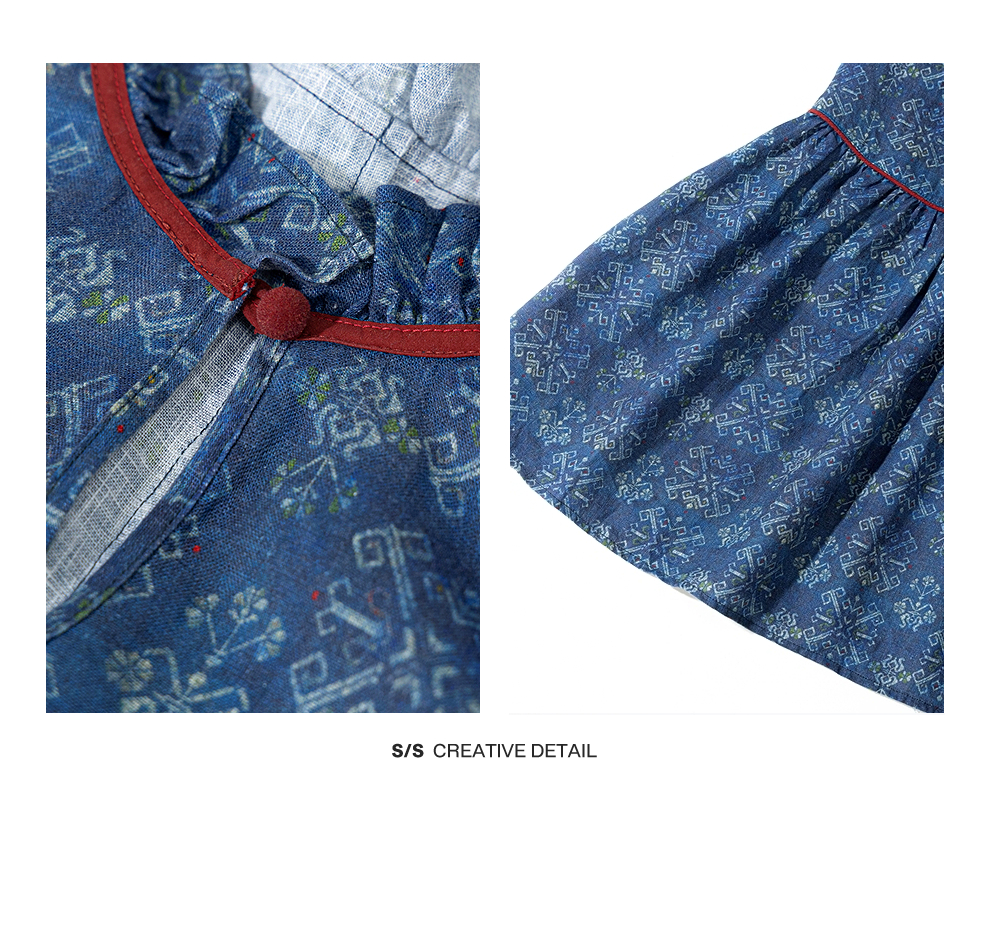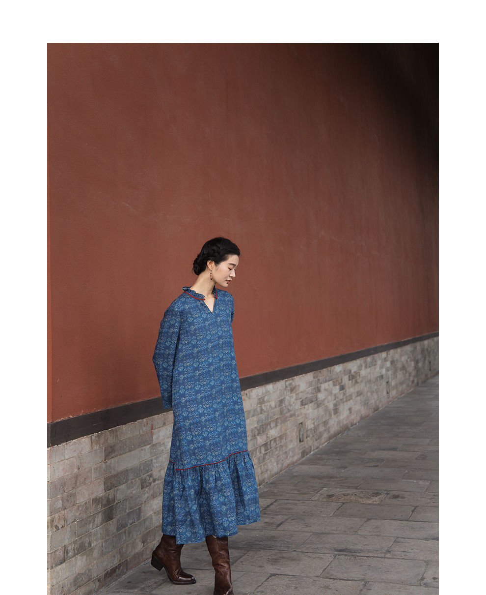 绽放590朵/亚麻印花花边领设计感文艺正常肩度假裙长袖连衣裙女秋