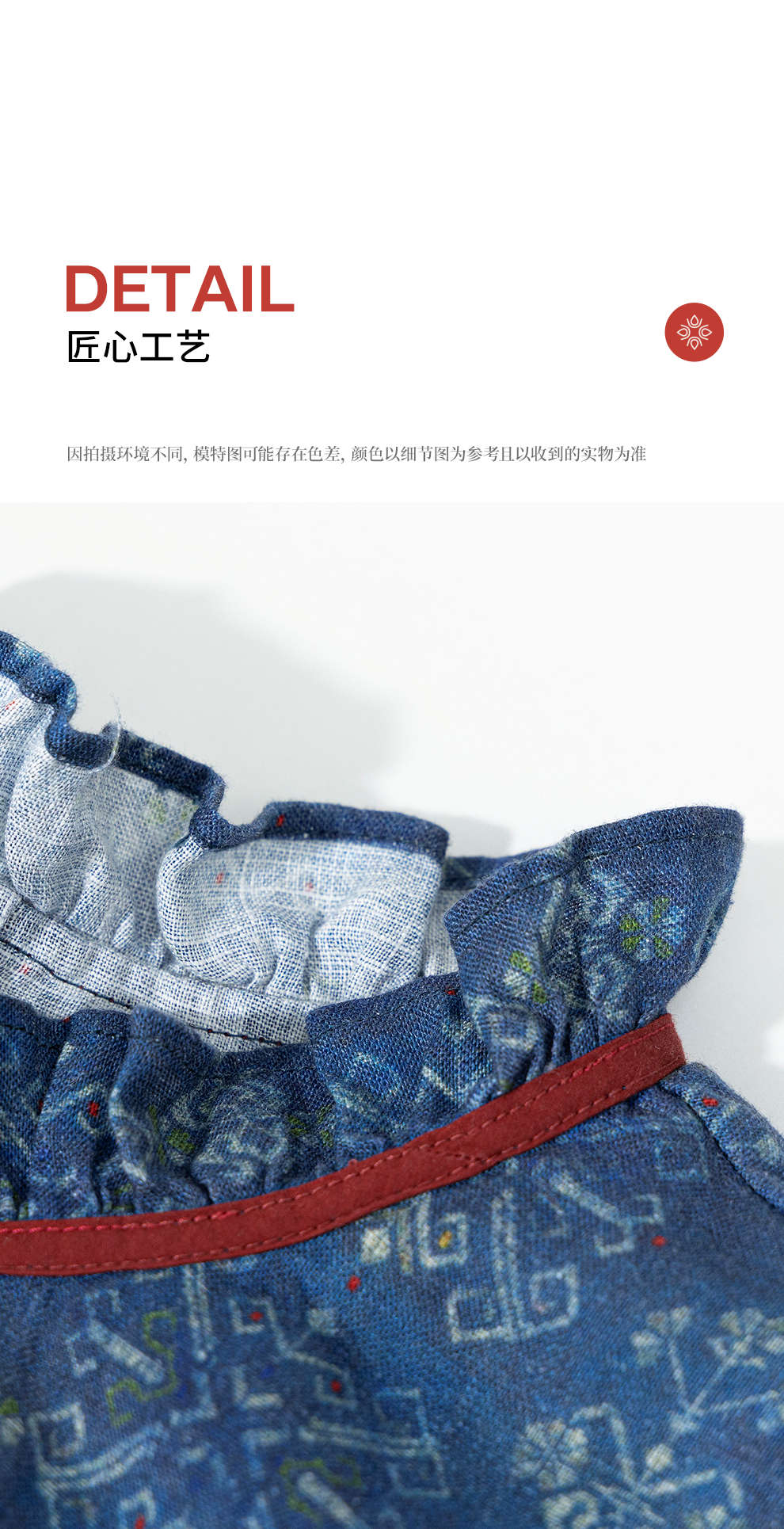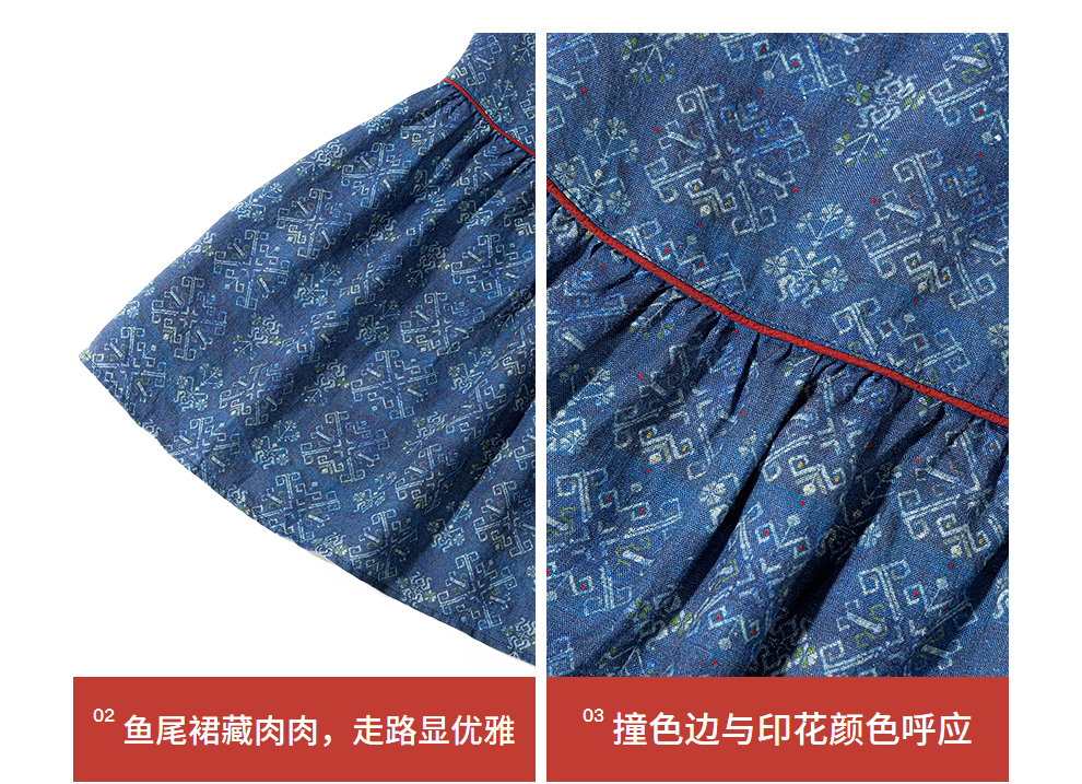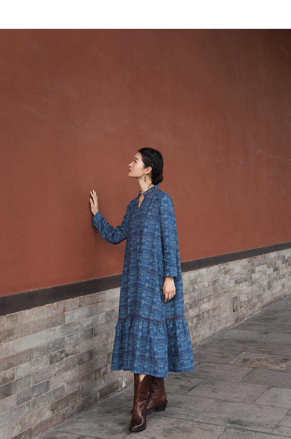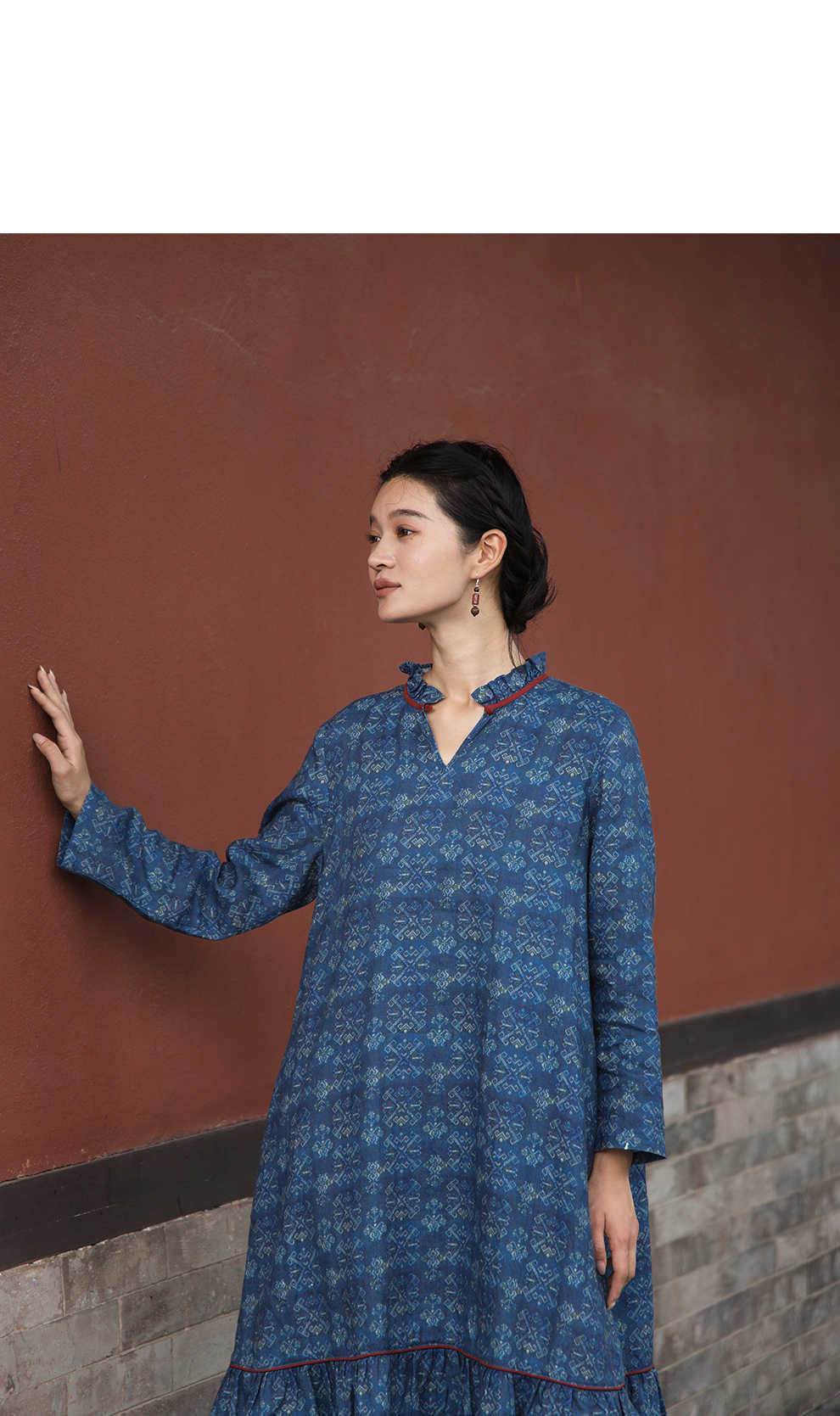 绽放590朵/亚麻印花花边领设计感文艺正常肩度假裙长袖连衣裙女秋