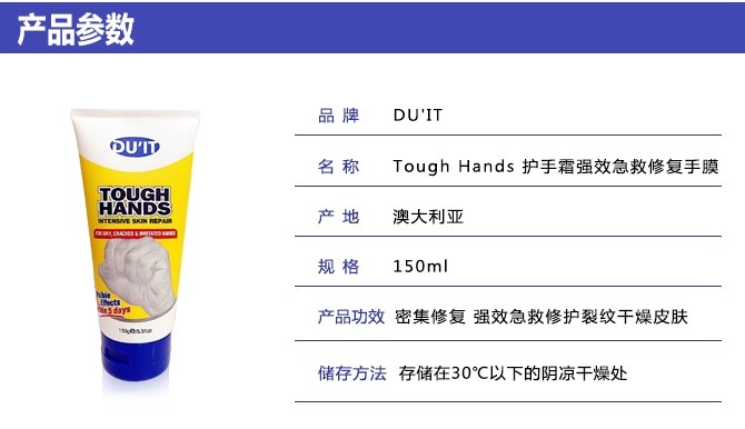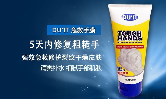 DU'IT Tough Hands是一个强力有效的配方,强效急救修复裂纹干燥手部皮肤,平衡皮肤油脂,在皮肤表层形成一个保护屏障,让手部皮肤达到一个最佳状态,针对各体力劳动导致手部粗糙、家务装修等频繁与化学物品接触造成的手部皮肤粗糙,对于真菌等引起的湿疹手癣也有显著效果!
