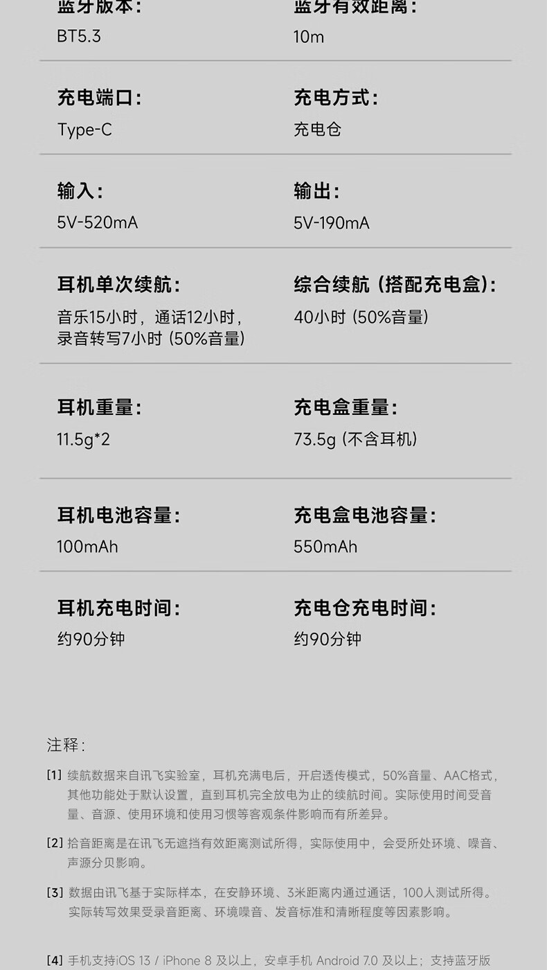 ● 耳机电池容量:100mah