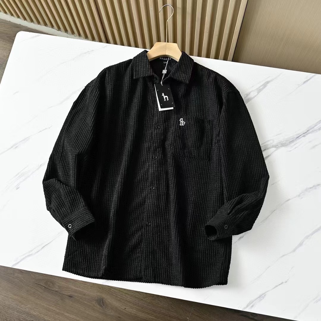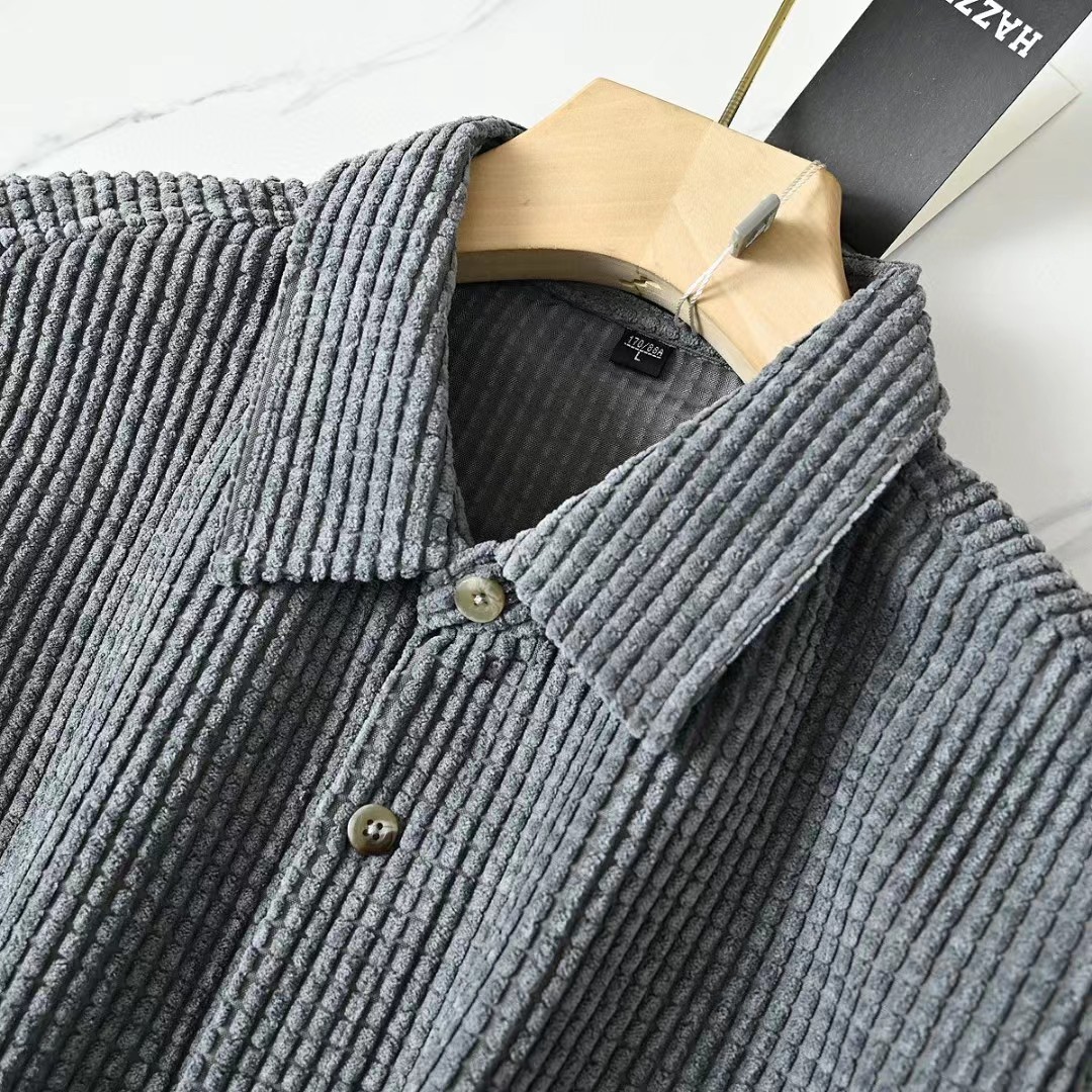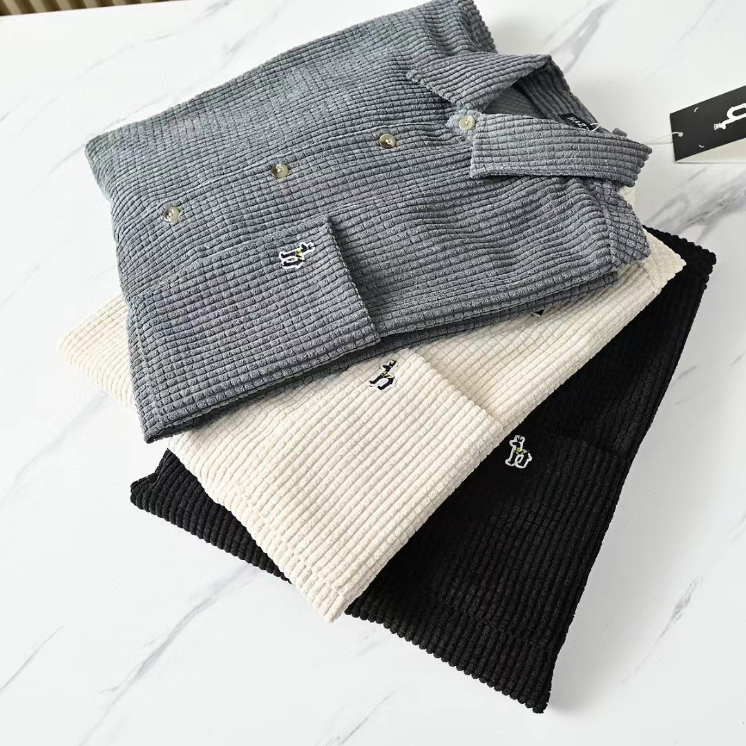 春秋新款男士灯芯绒复古纯色宽松条纹衬衫,修身款休闲衬衫时尚灯芯绒设计上身的效果真的是非常的wan美的,果断入手看看咱们的价钱我很骄傲,看一下细节图,里面的辅料还是做工都是超棒!厚度适中,绒毛耐磨,手感柔软。春秋都可以穿。合体版型的剪裁,贴身非常舒适.