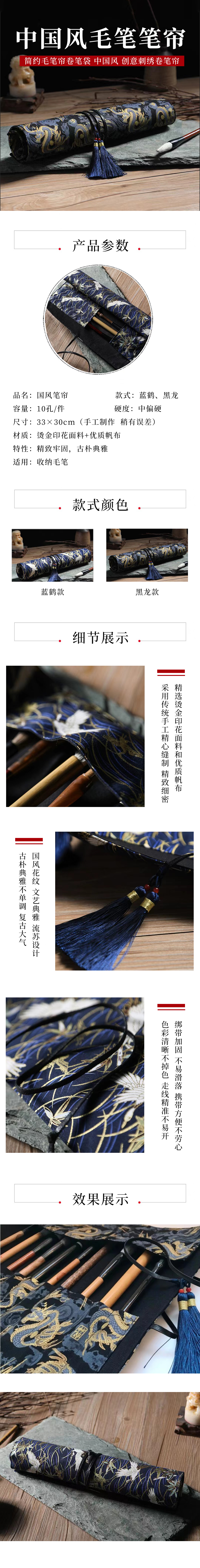 笔袋丨布艺手工收纳国风文创布艺笔袋 笔帘10孔入 保护毛笔套33*30cm