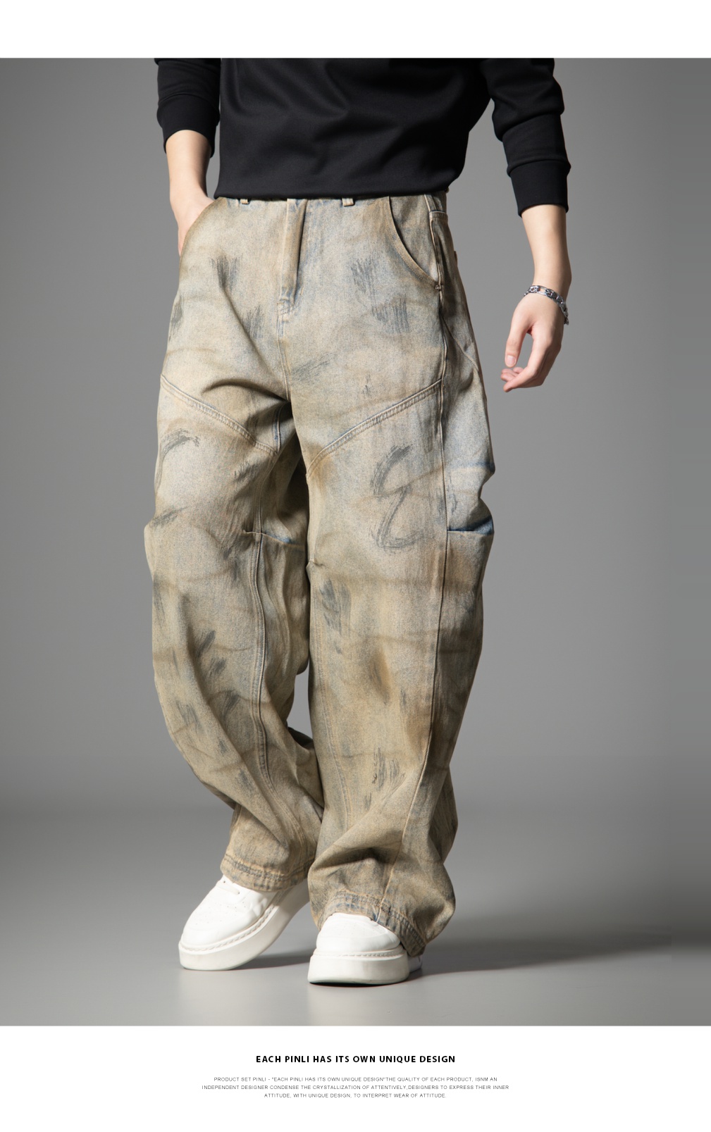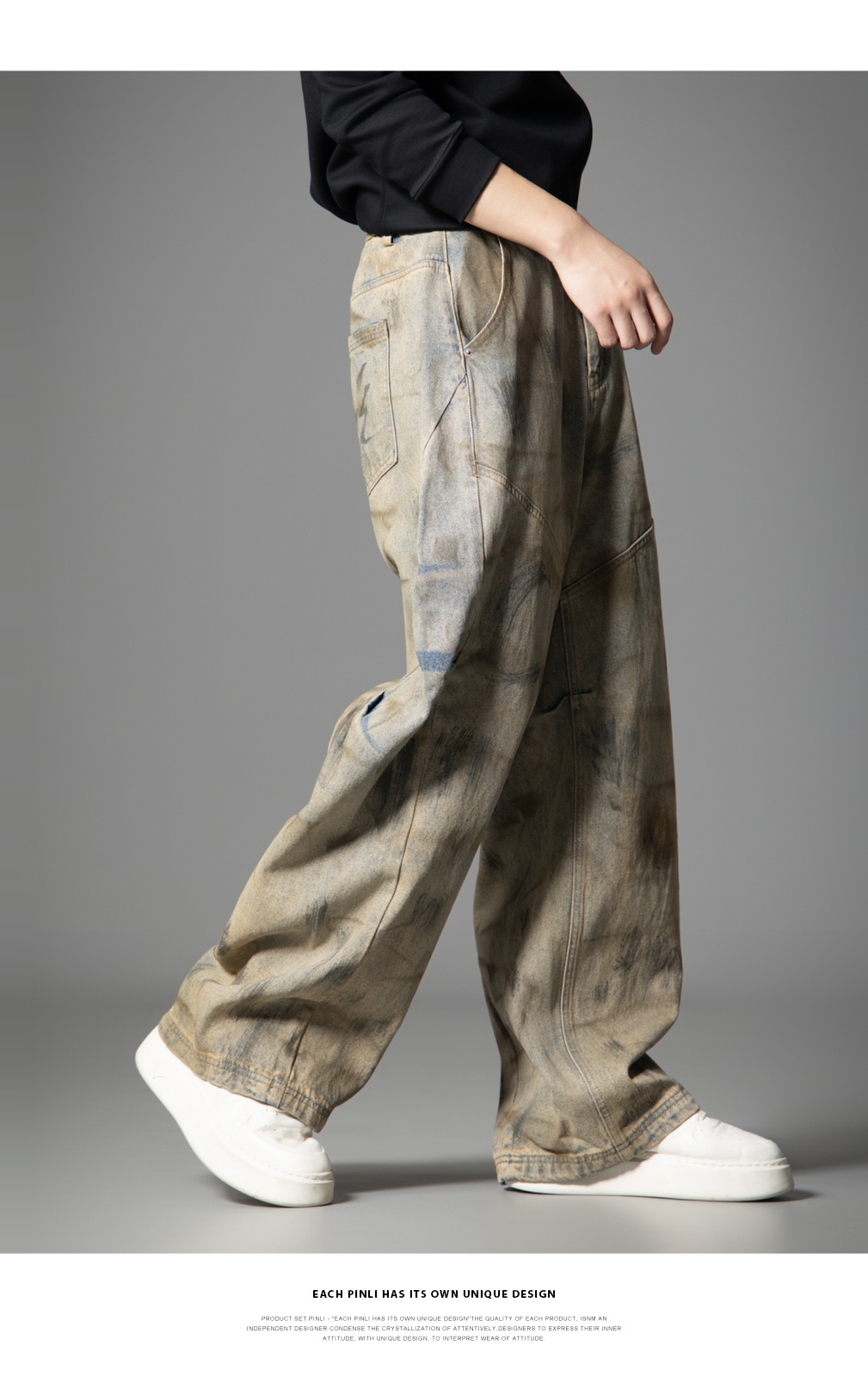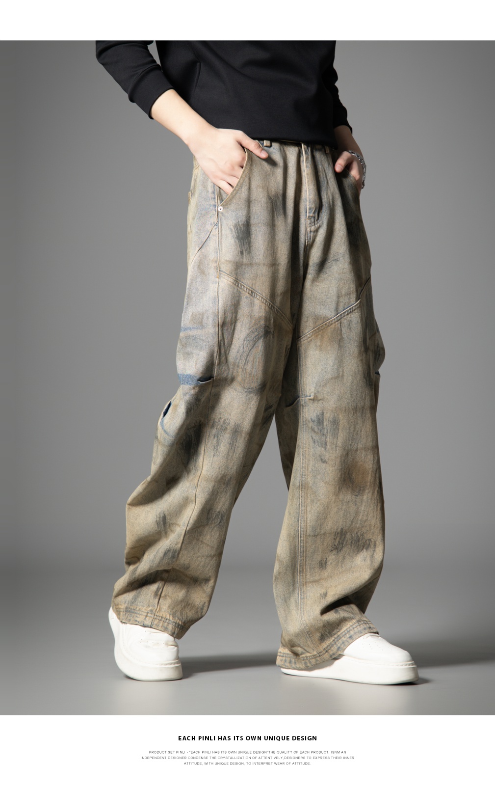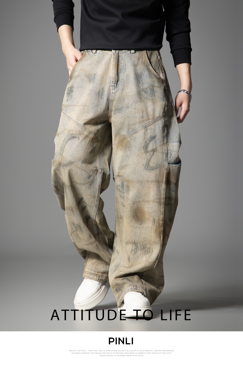 PINLI品立2025秋季新款涂鸦印花嘻哈街头宽松直筒休闲牛仔长裤男GD253116145