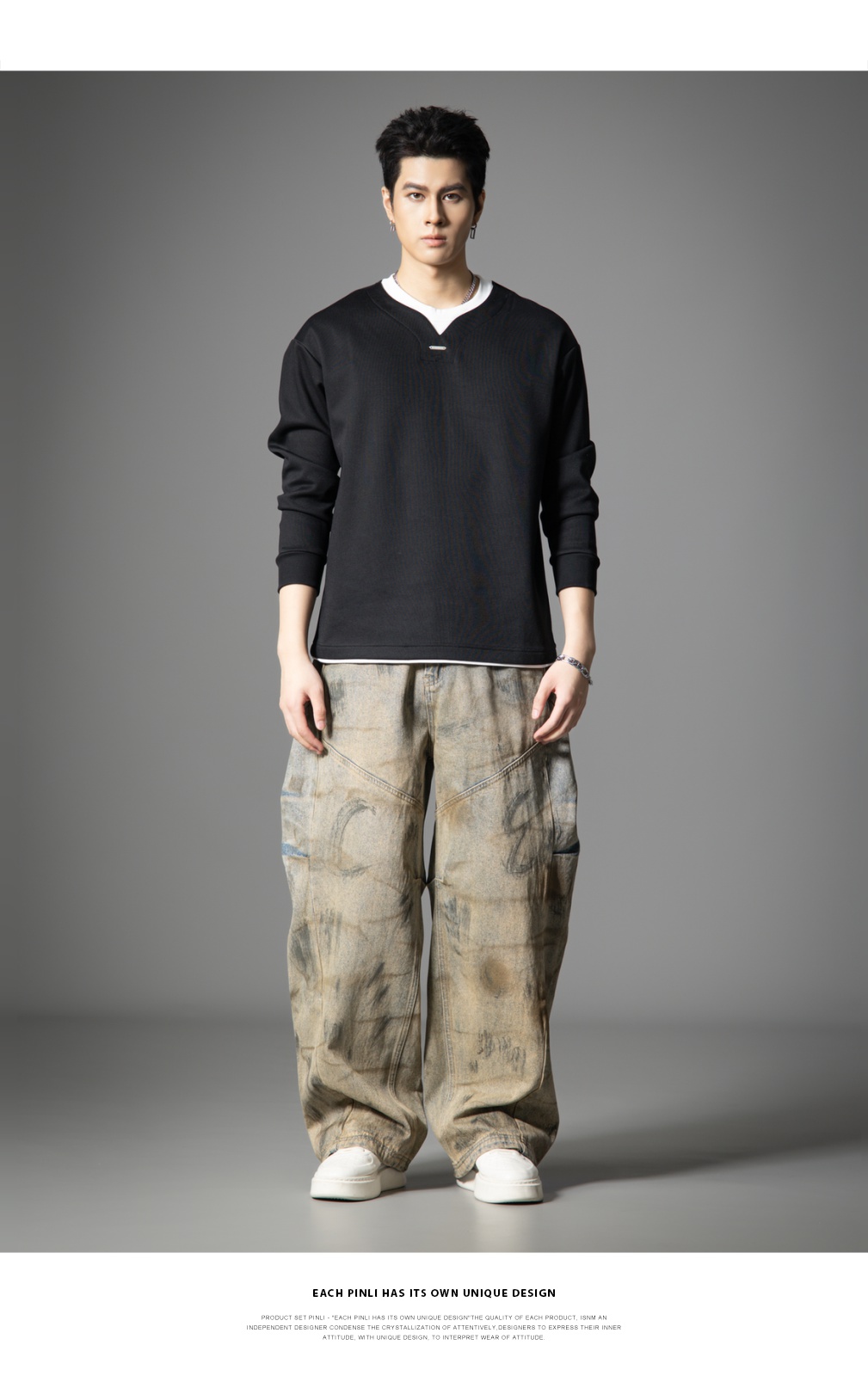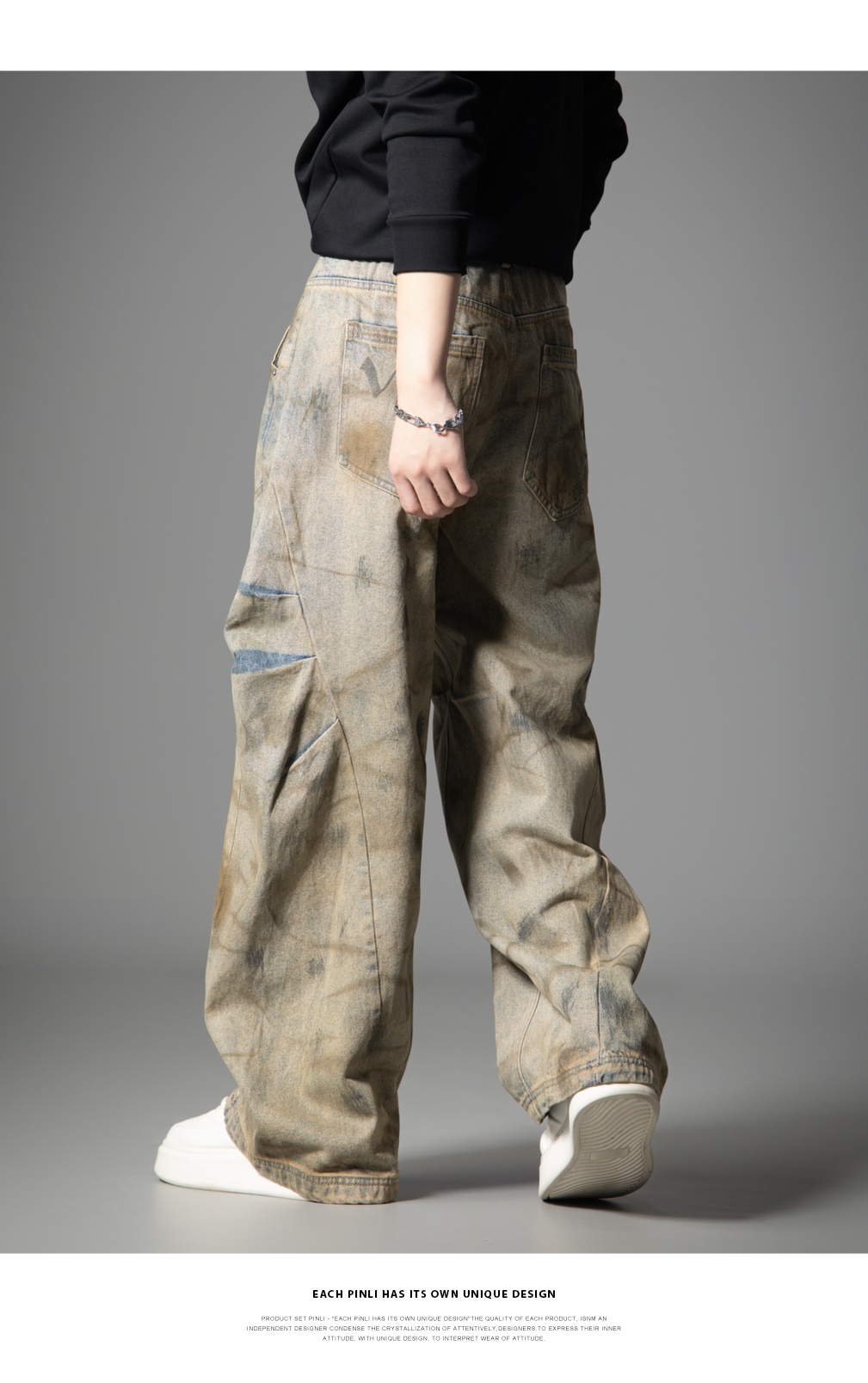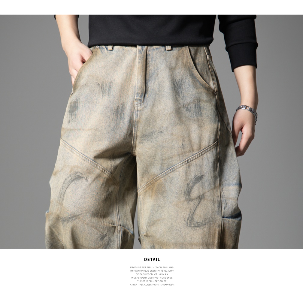 PINLI品立2025秋季新款涂鸦印花嘻哈街头宽松直筒休闲牛仔长裤男GD253116145