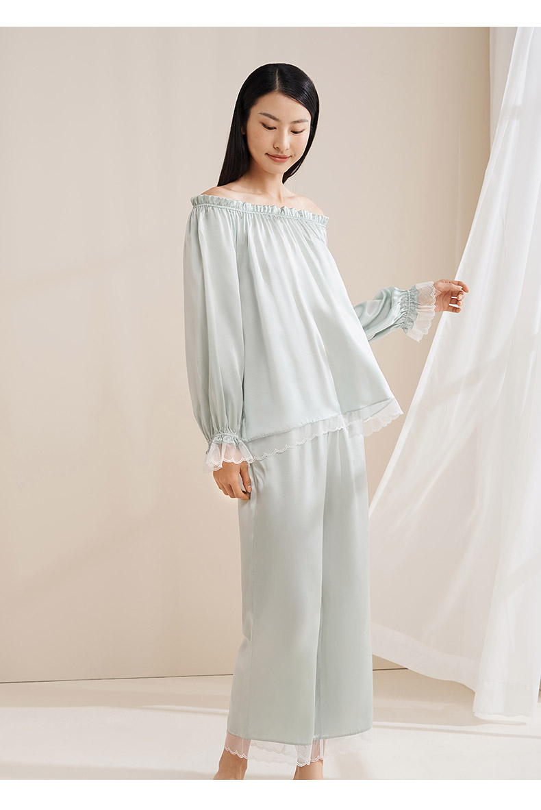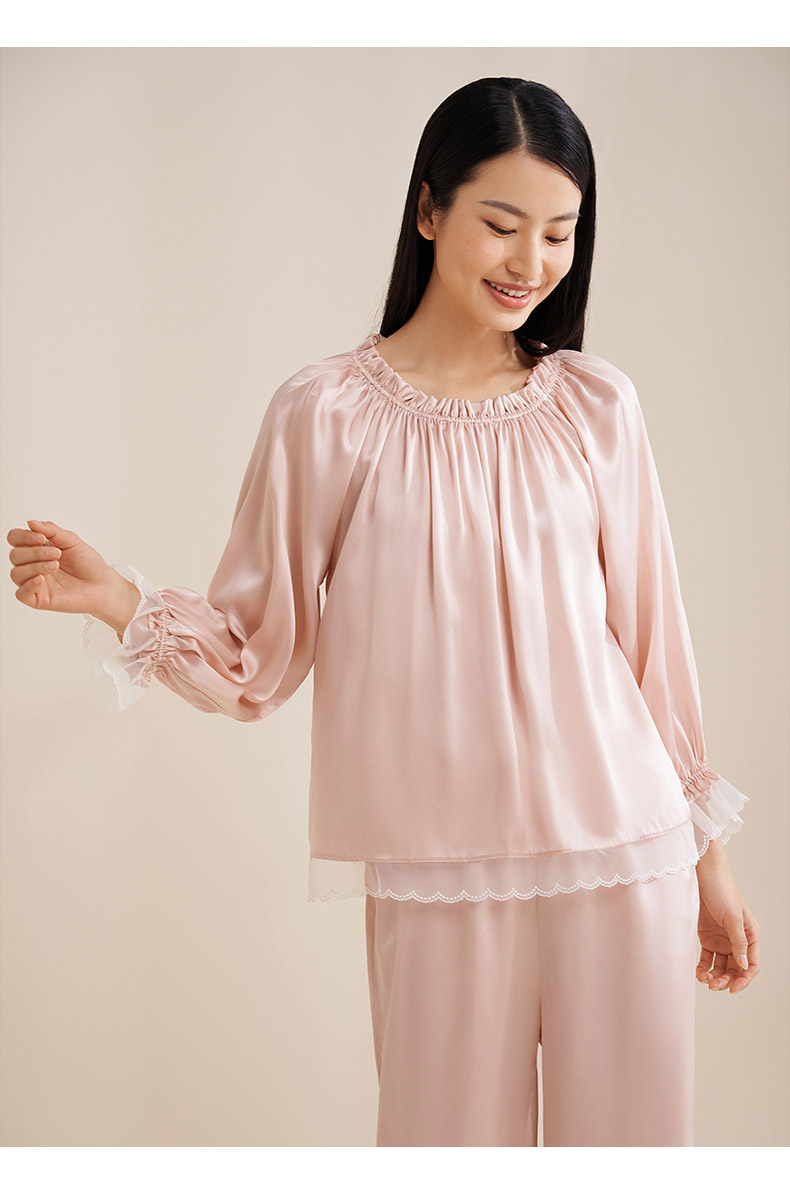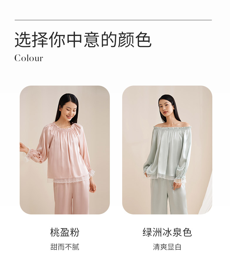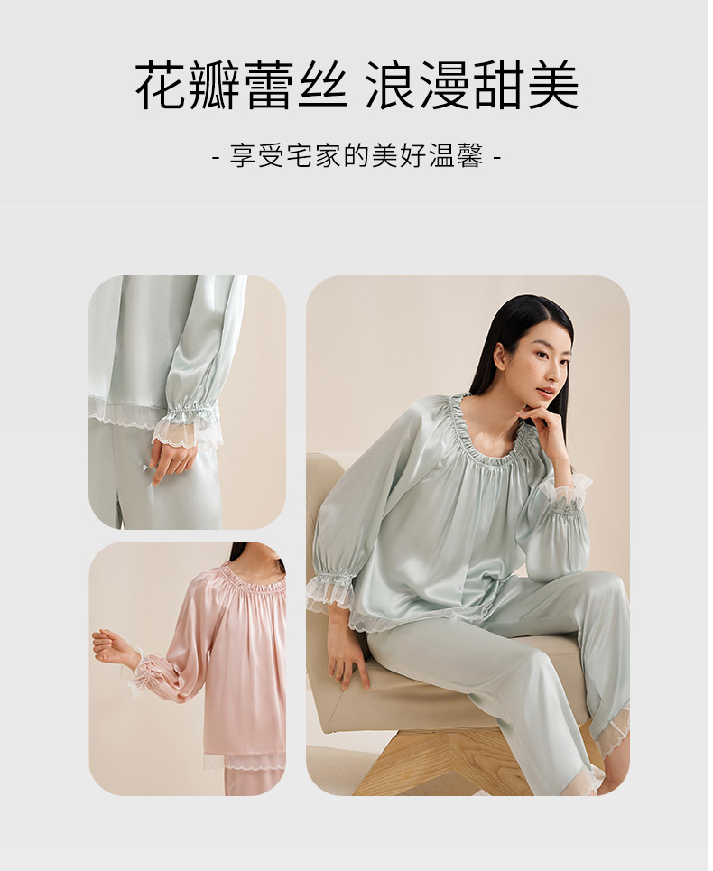 【圆领/一字肩】真丝睡衣女100%桑蚕丝蕾丝边可外穿衣裤套金三塔 YSFEA209