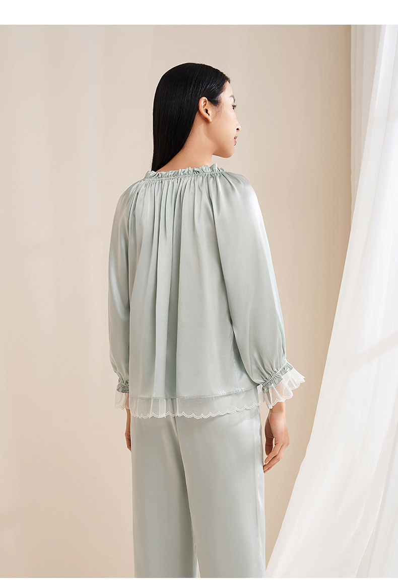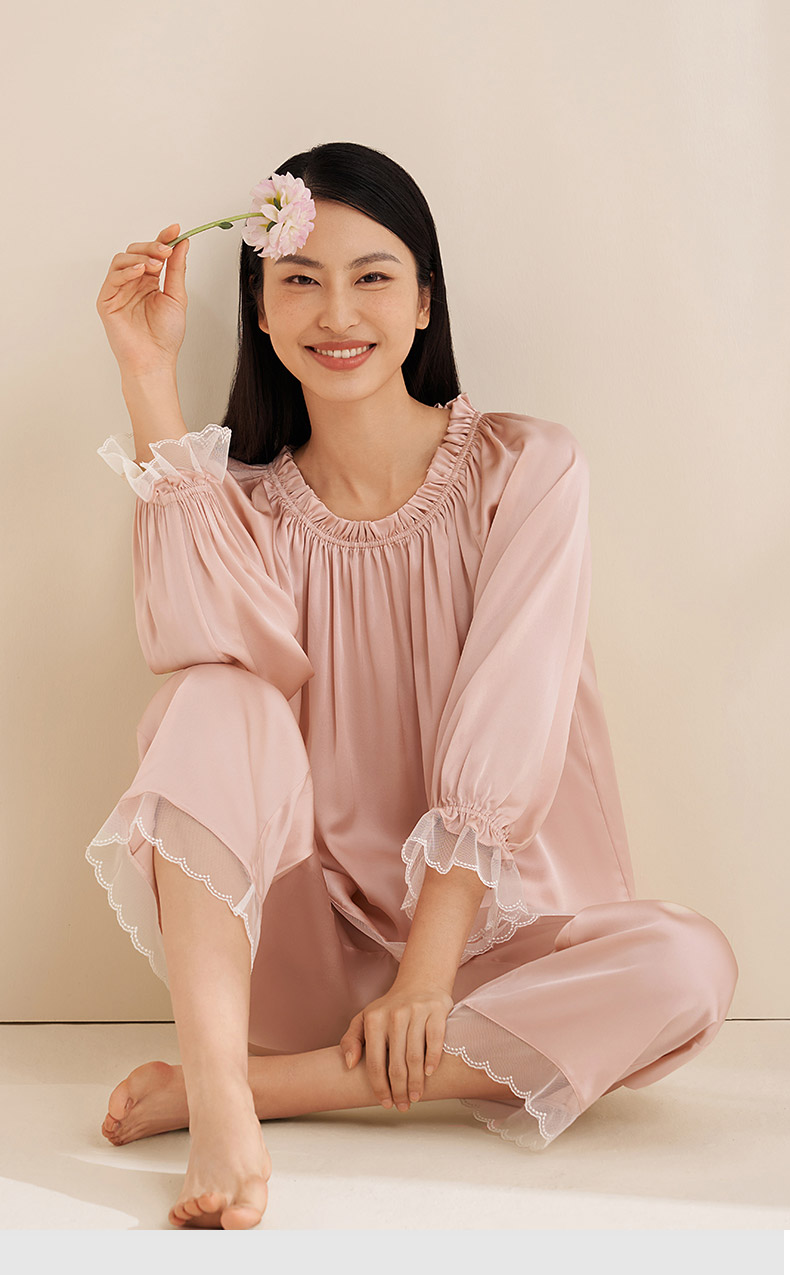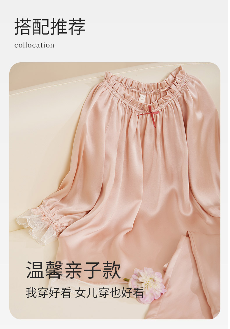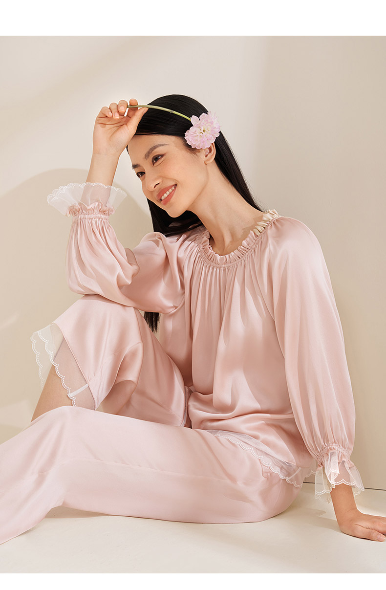 【圆领/一字肩】真丝睡衣女100%桑蚕丝蕾丝边可外穿衣裤套金三塔 YSFEA209