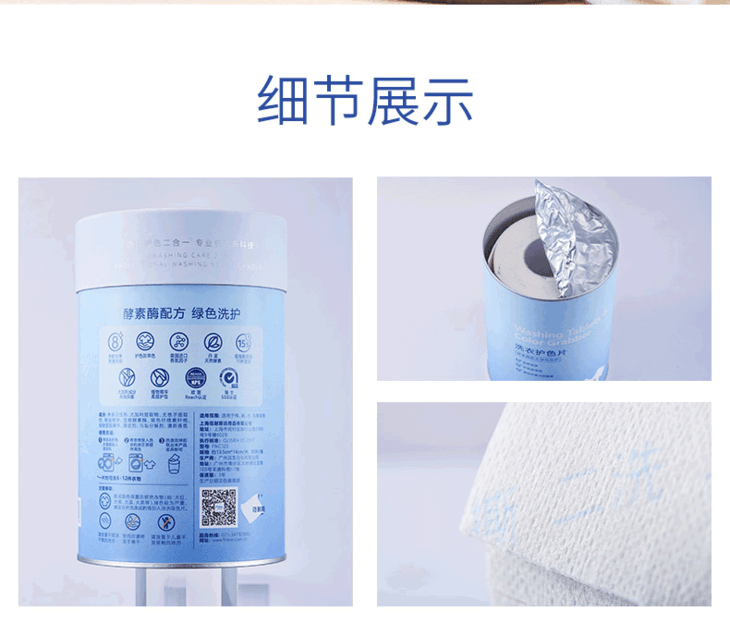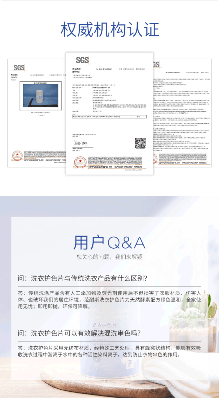 洗衣片还低泡易漂,漂洗两次,洗衣机里就看不见泡泡了。经测试,它不含荧光剂,并通过欧盟Reach认证(175种高关注物质检测)、全球检测机构 SGS 的验证及中国日用化学工业研究院认证(不含增白剂、不含重金属、不含任何刺激成分、无染色剂、可吸附重金属),入口无毒级,安全到婴儿都能用。小朋友衣物、女士内衣都可以放心洗,不用单独买新的洗衣液了。