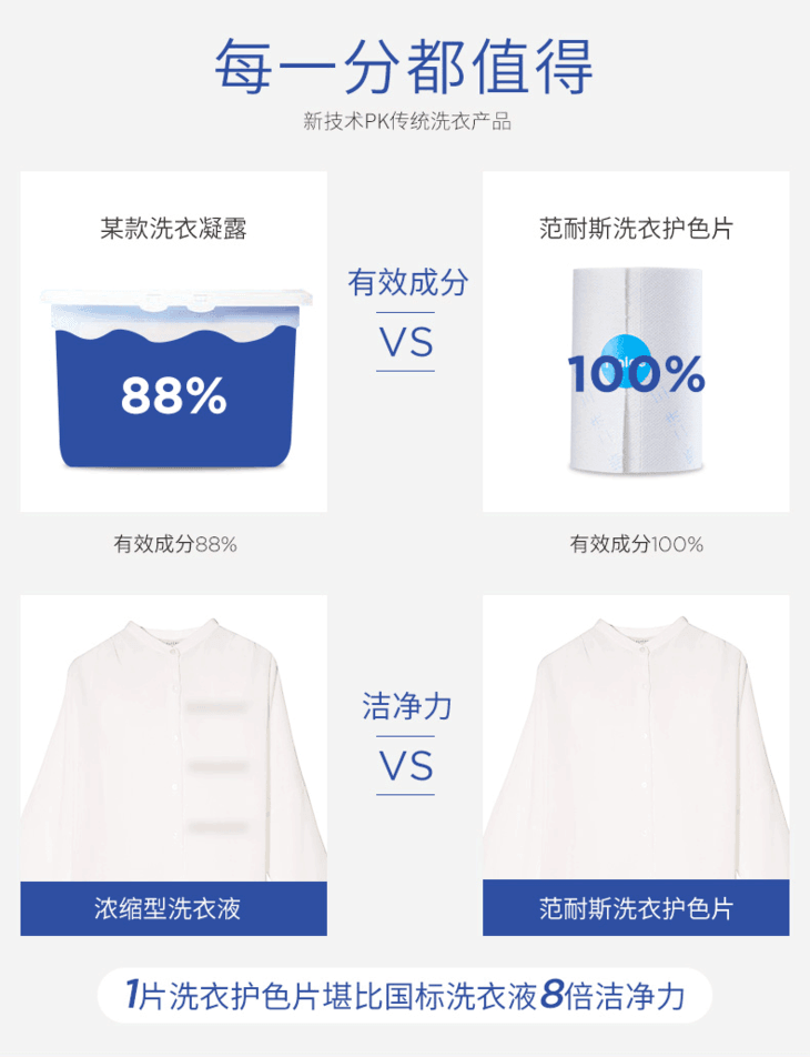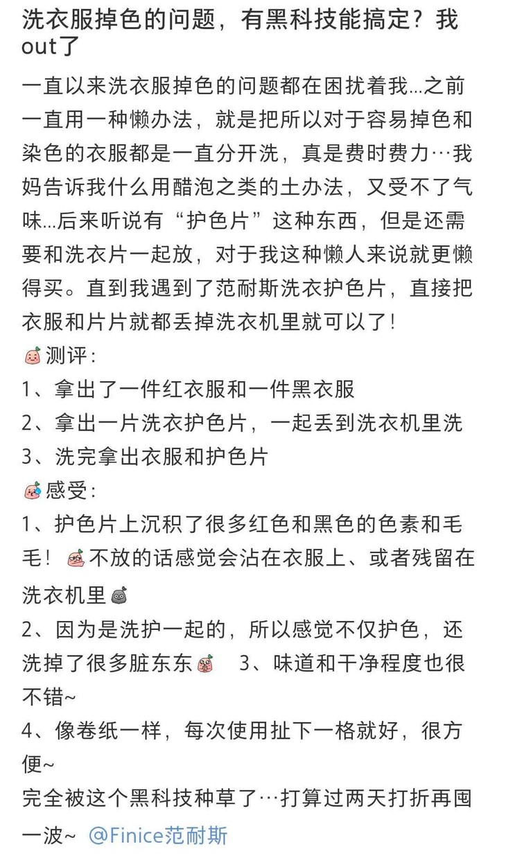 有句话说的好,懒惰是科技进步的原动力,洗衣黑科技——finice范耐斯洗衣护色片应运而生。1片相当于洗衣液+吸色片+消毒除箘+留香珠+柔顺剂!无论衣服什么颜色什么材质,内衣外衣裤子袜子,统统一锅丢进洗衣机,再放上范耐斯洗衣片就行咯!