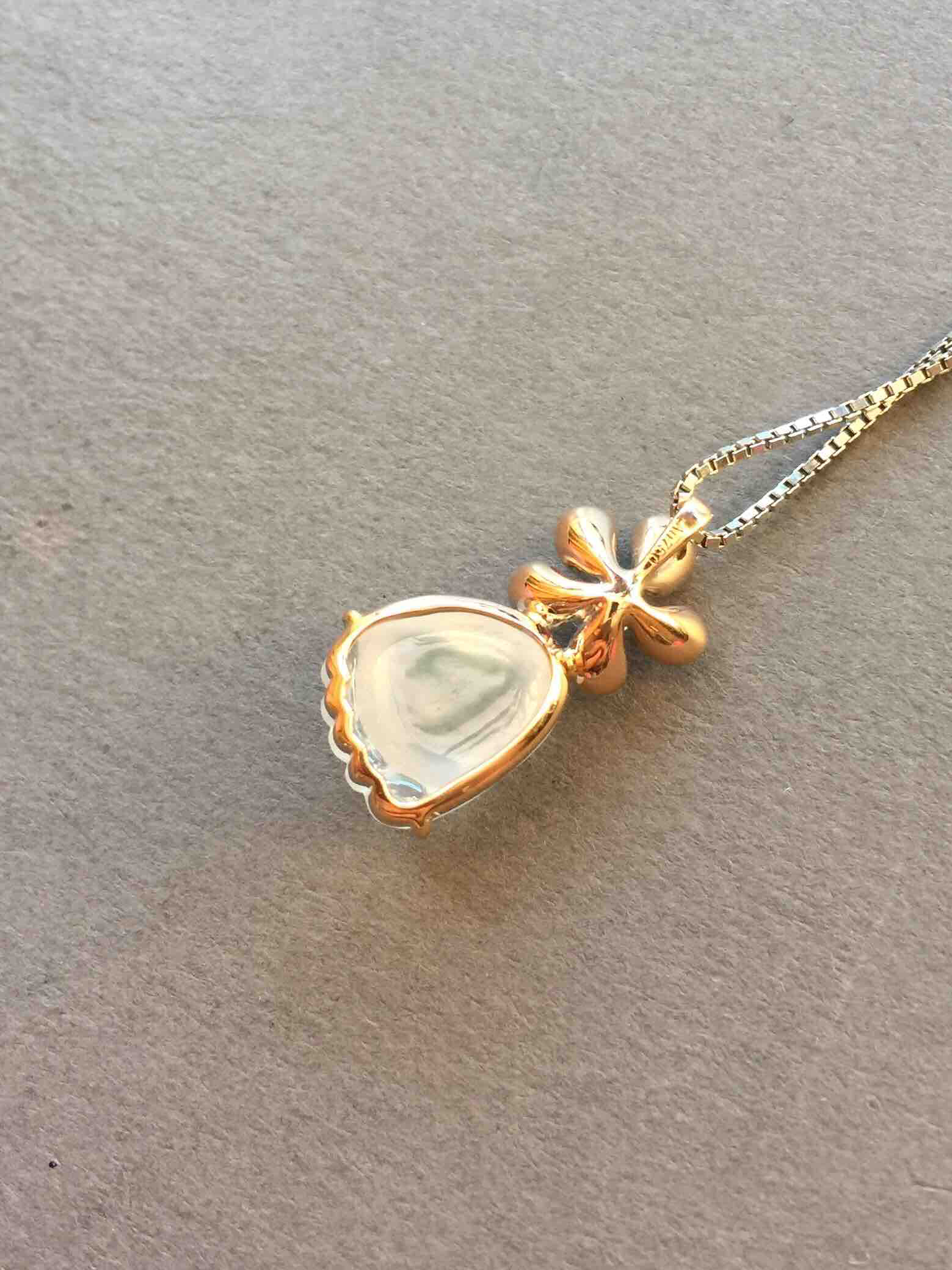 种水小精品,高冰种知足常乐,12×10.3×6.2mm,镶嵌后19.9×11×7.5mm。厚实饱满,荧光四射,鼓鼓的像个球一样,就像baby feet一样可爱,很难得的品质。设计款,18k黄金混合白金钻石镶嵌,时尚大方小四价位精品推荐