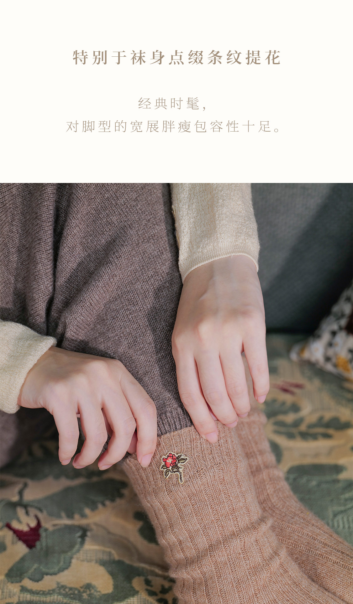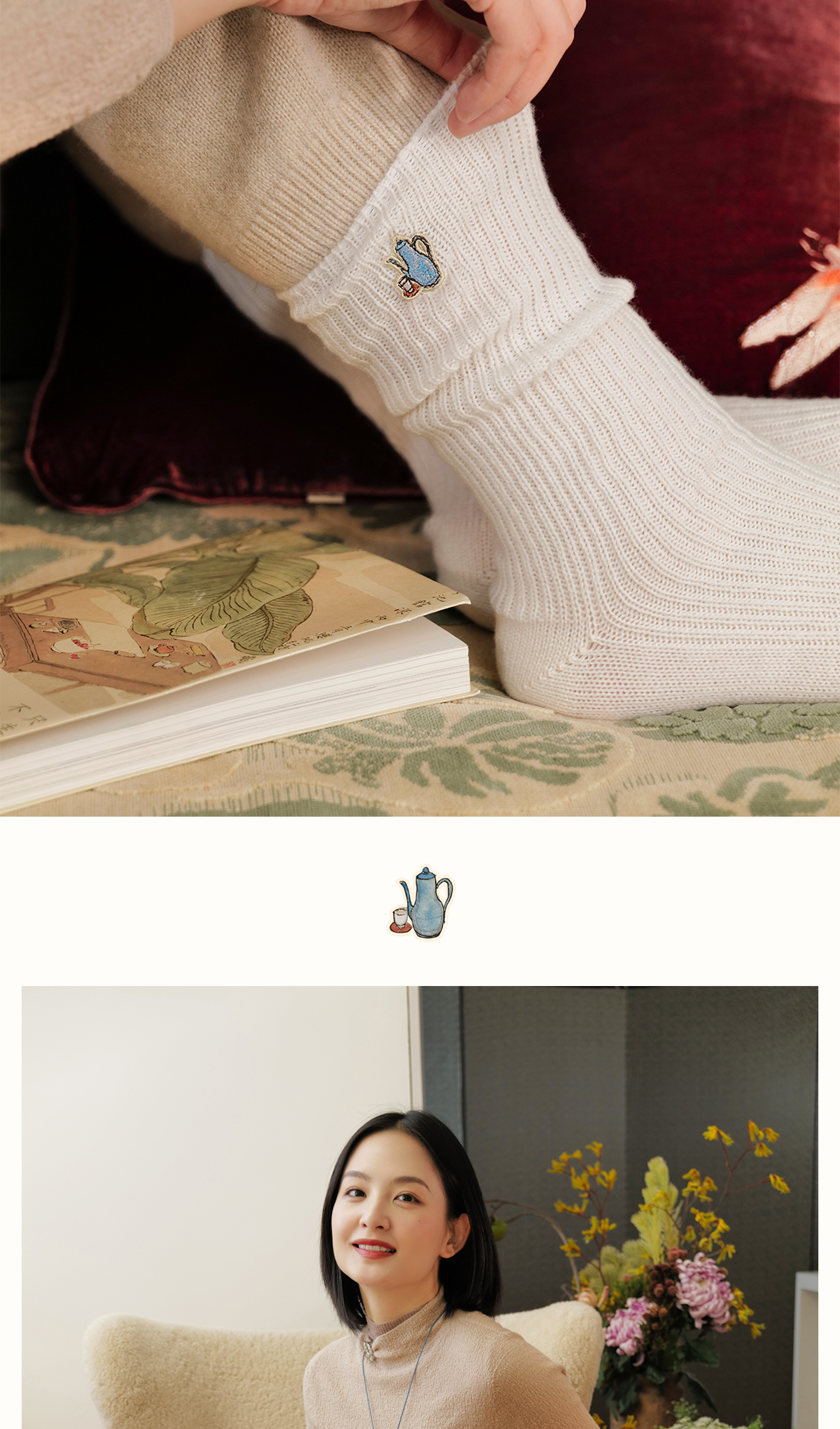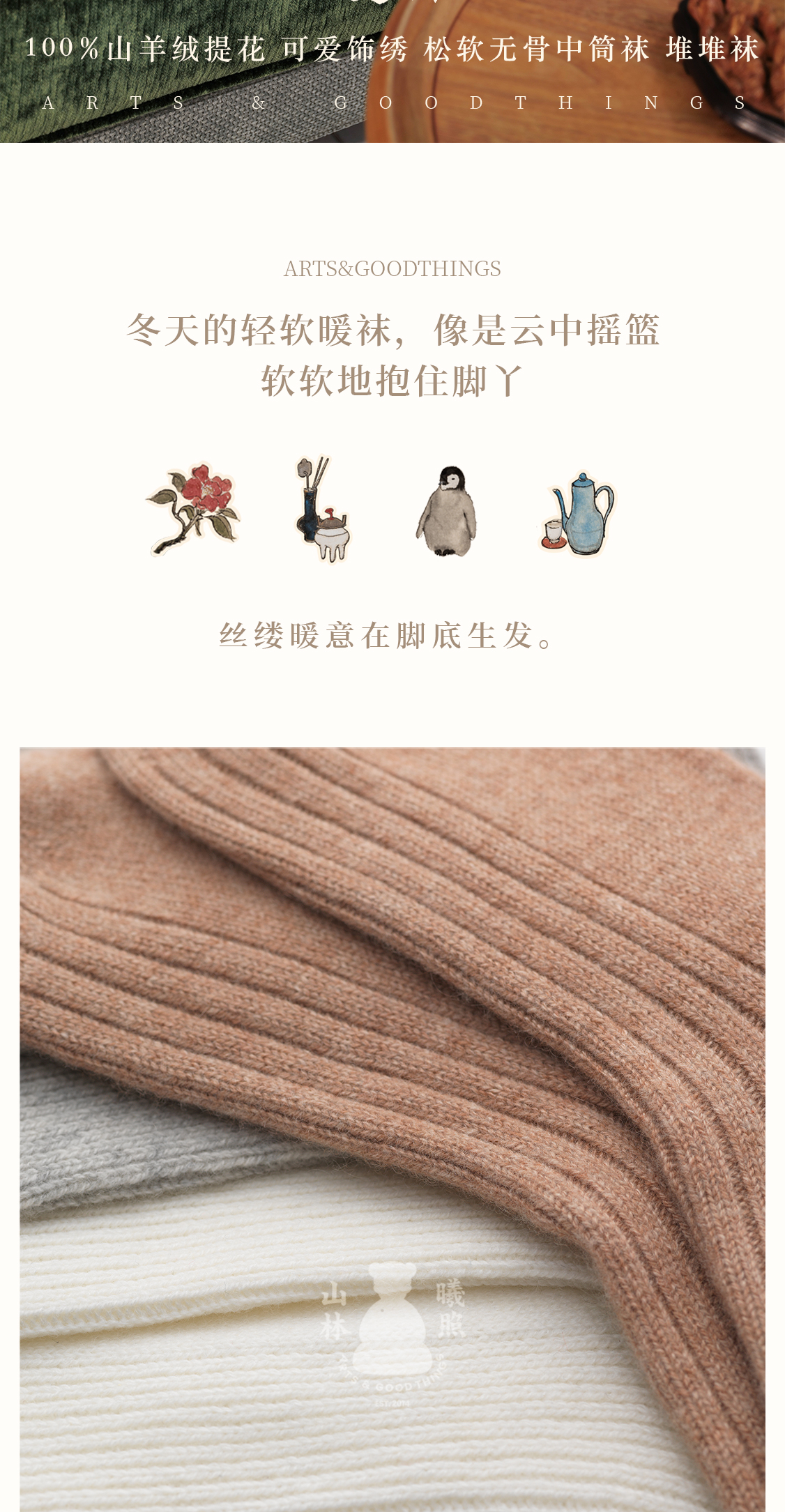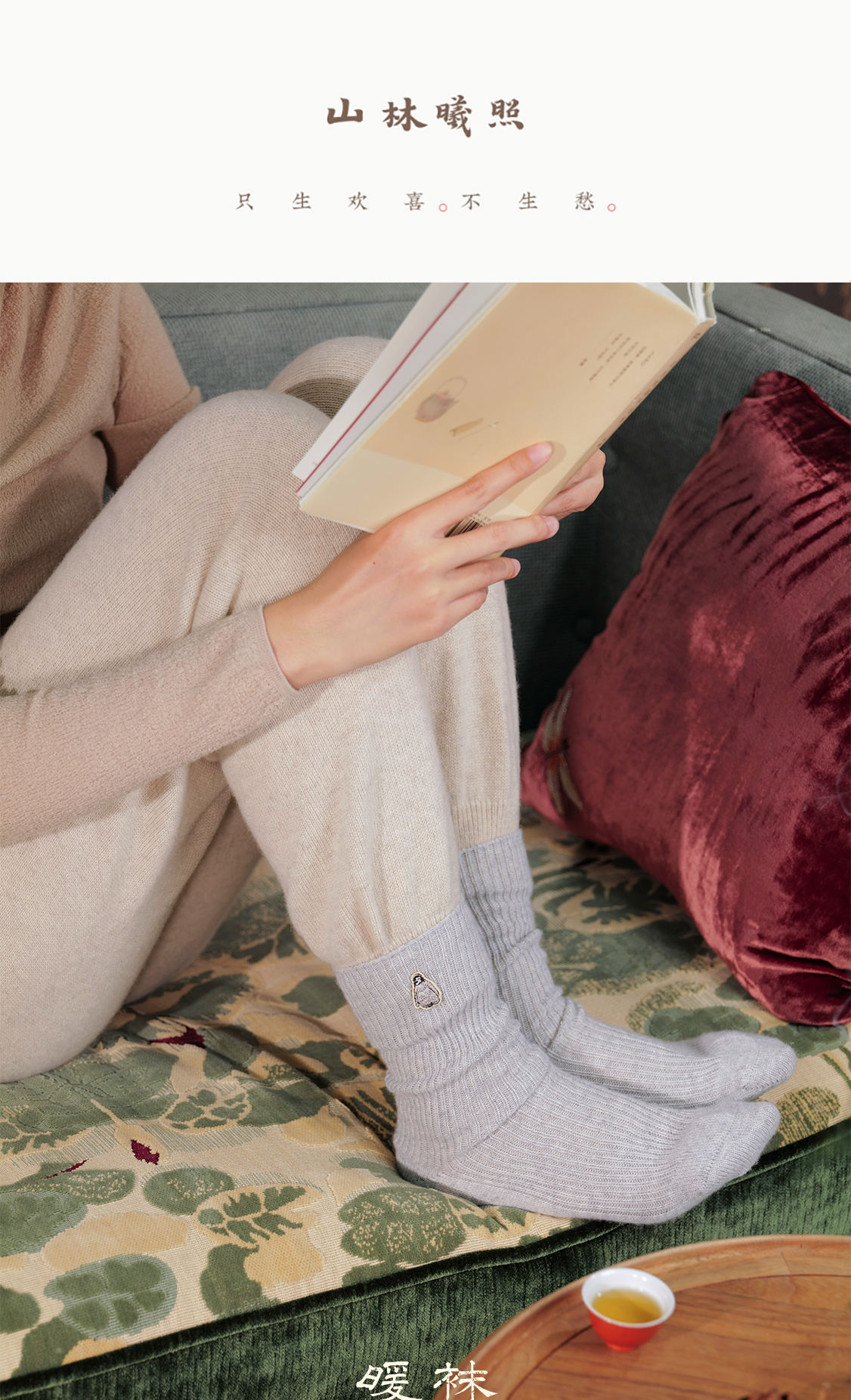暖袜 100%山羊绒提花 可爱饰绣 松软无骨中筒袜 堆堆袜 山林曦照