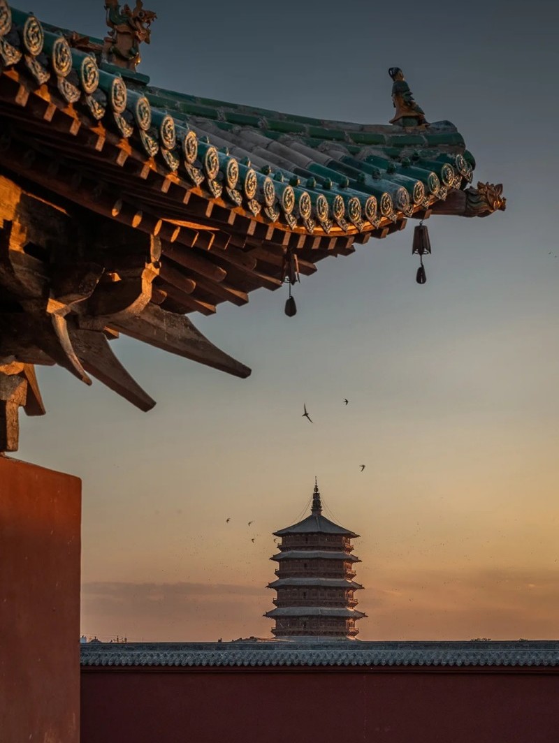 - 下午到达【应县木塔】,1933年,建筑学家梁思成慕名而来考察,感慨不已:“我到镇西五英里外时,正是落日时辰。前方几乎笔直的道路尽头,兀然间看见暗紫色天光下远远闪烁着的珍宝:红白相间的宝塔映照着金色的夕阳,掩映在远山之上。不见此塔,不知木构的可能性到了什么程度。我佩服极了!佩服建造这塔的时代,和那时代里不知名的大建筑师,不知名的匠人。11木塔的设计,全靠斗拱、柱梁镶嵌穿插吻合,不用钉不用铆,全塔共用斗拱54种,木塔每个斗拱都有一定的组合形式,有的将梁、枋、柱结成一个整体,每层都形成了一个八边形中空结构层。是我国古建筑中使用斗拱种类相对较多,造型设计十分精妙的建筑,堪称一座斗拱博物馆。日落。下的木塔,是永远都忘不了的动人一幕。
