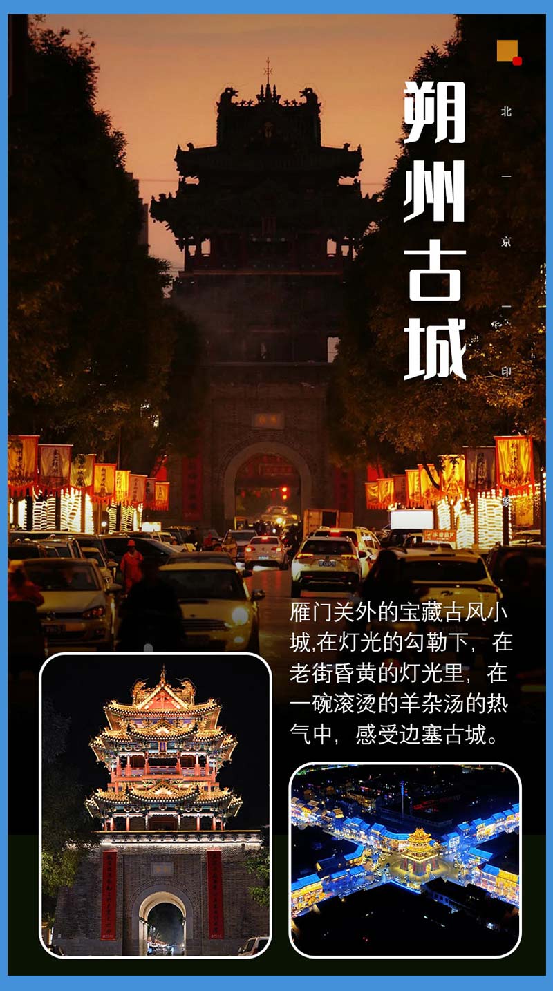 - 适时集合,我们前往【朔州古城】。步行推荐路线:南门→文昌阁→天主教堂→文庙→马邑博物馆→崇福寺→东门古城墙公园。晚上可夜游古城、品尝美食。
