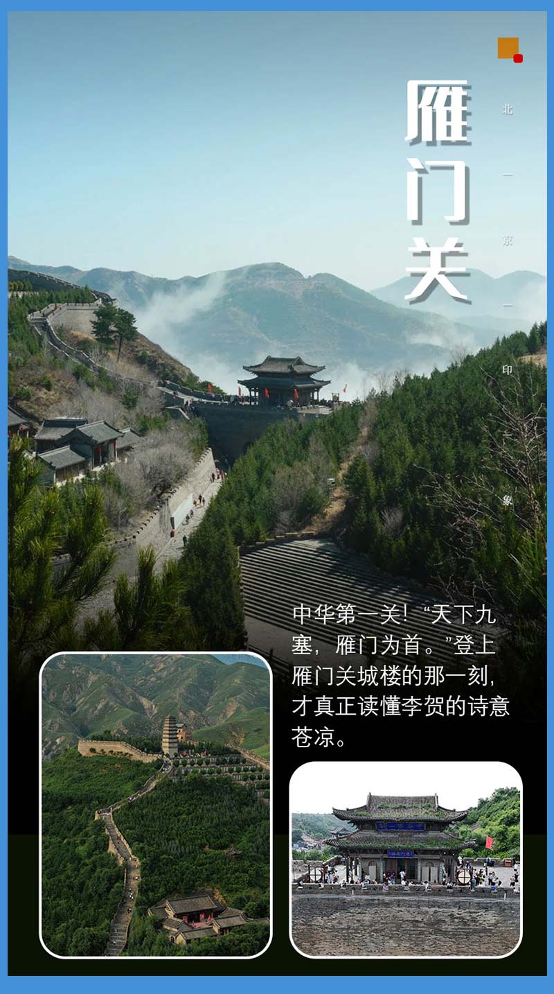- 适时前往【雁门关】游览。雁门关,是世界文化遗产万里长城的重要组成部分,是历史最为悠久,经历战事最为频繁、知名度最高、影响面最广的古关隘,被誉为“中华第一关”,有“天下九塞,雁门为首”之说。与宁武关、偏关合称为“外三关”。雁门关景区是以雁门关军事防御体系历史遗存、遗址为主要景观资源的边塞文化、长城文化、关隘文化旅游区。