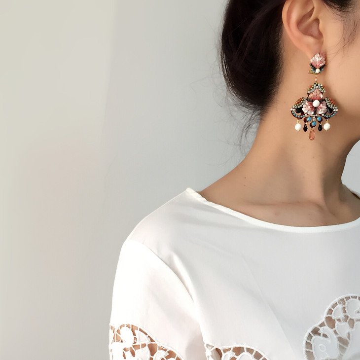 耳环材质为:珠宝级合金镀14K黄金 施华洛世奇水晶 贝母 珠宝级树脂 人工玻璃水晶。