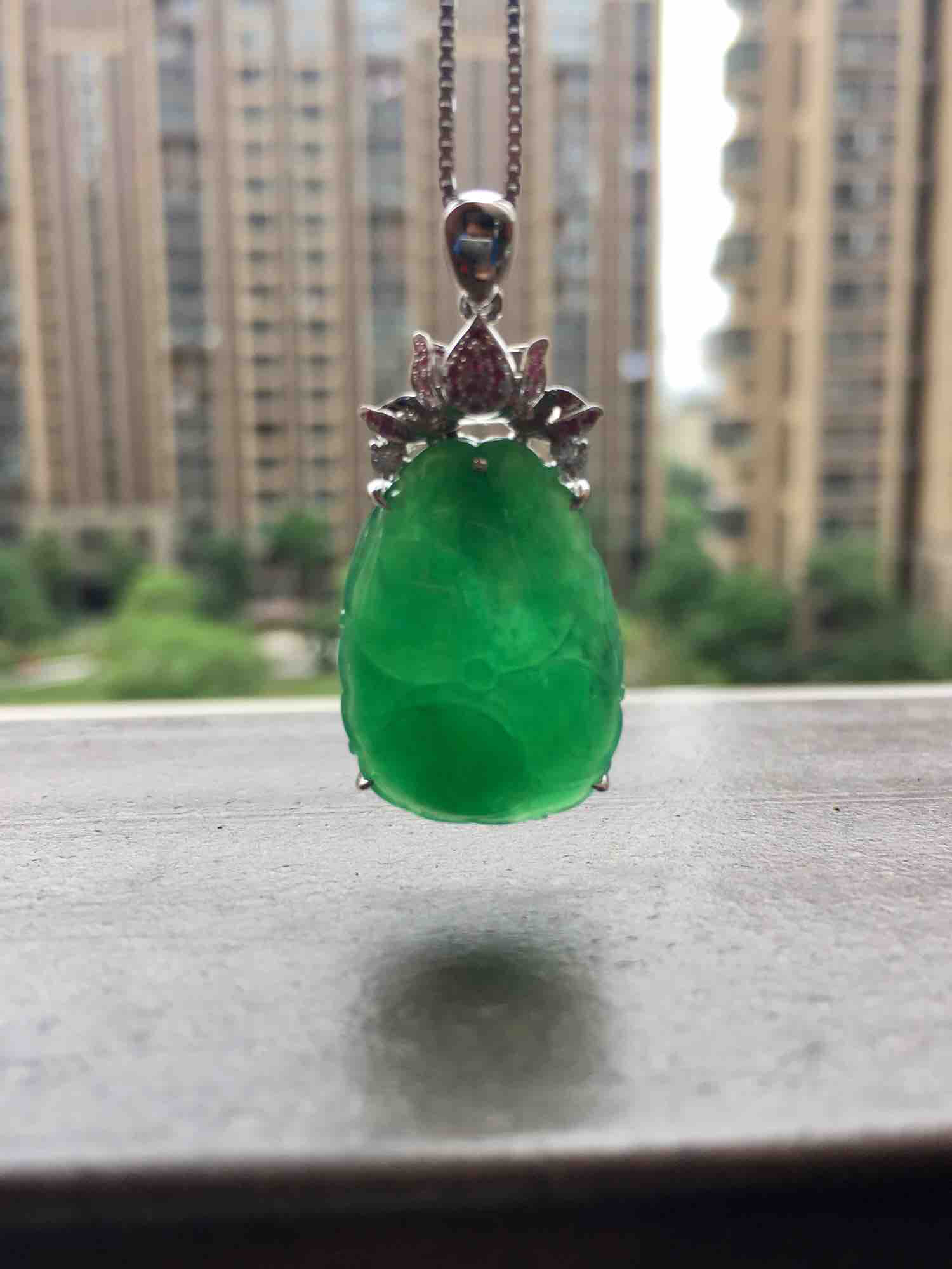 糯冰种阳绿满色和和美美,23.6×17.3×4.4mm,镶嵌后36.6×17.1×6.1mm,设计师款作品,荷叶厚实饱满,种水晶莹剔透,正阳绿艳丽,纯手工精雕细刻,18k白金红宝石镶嵌,款式充满活力,时尚大方的富贵宝贝,无论是自己戴还是送长辈都是高大上了,最难得的是同料有一对,好事成双,精品不容错过