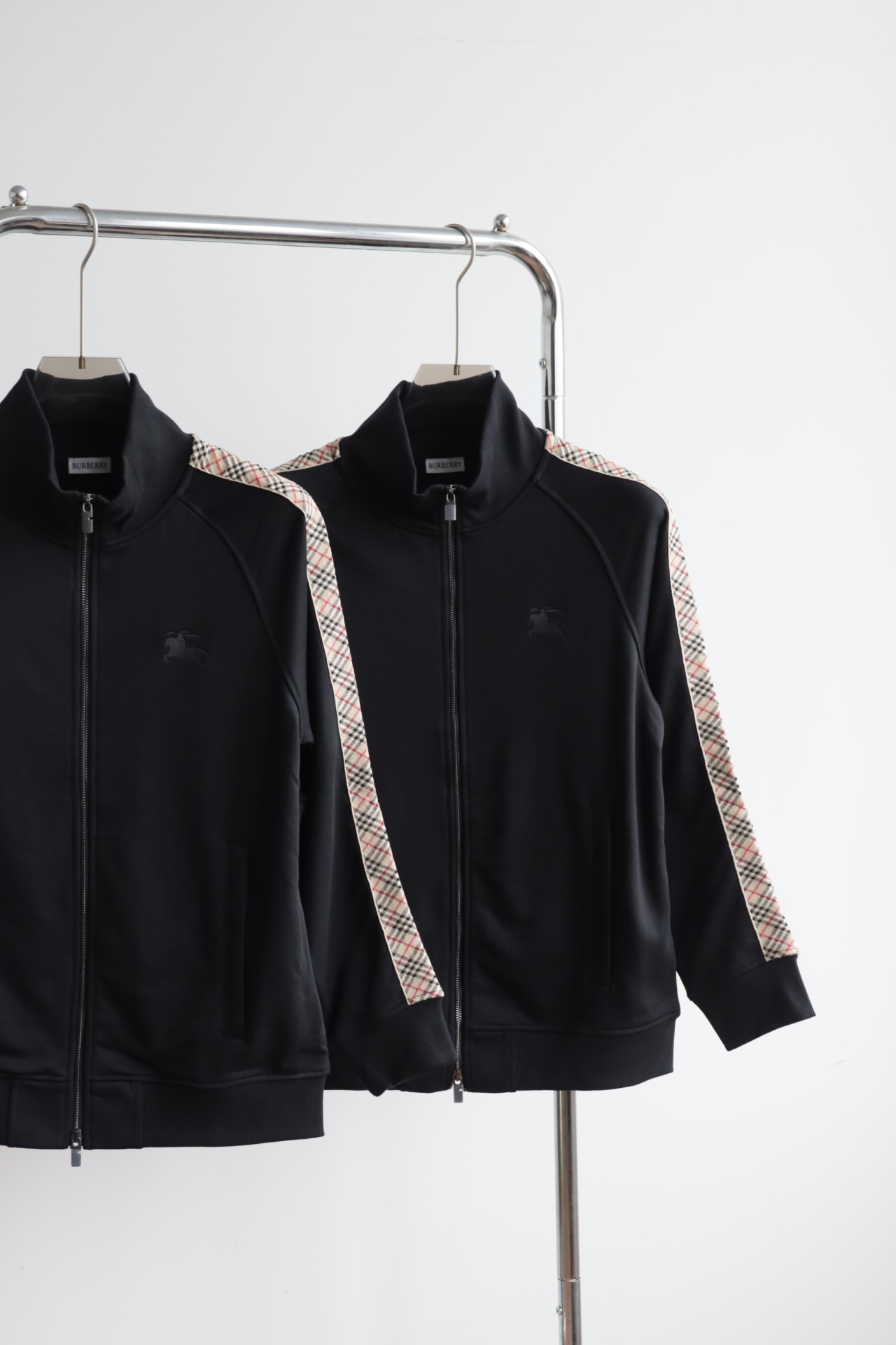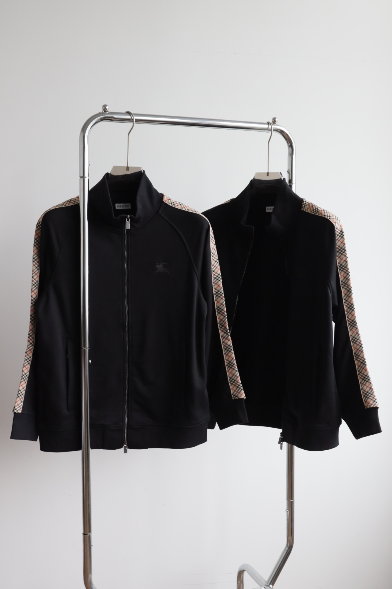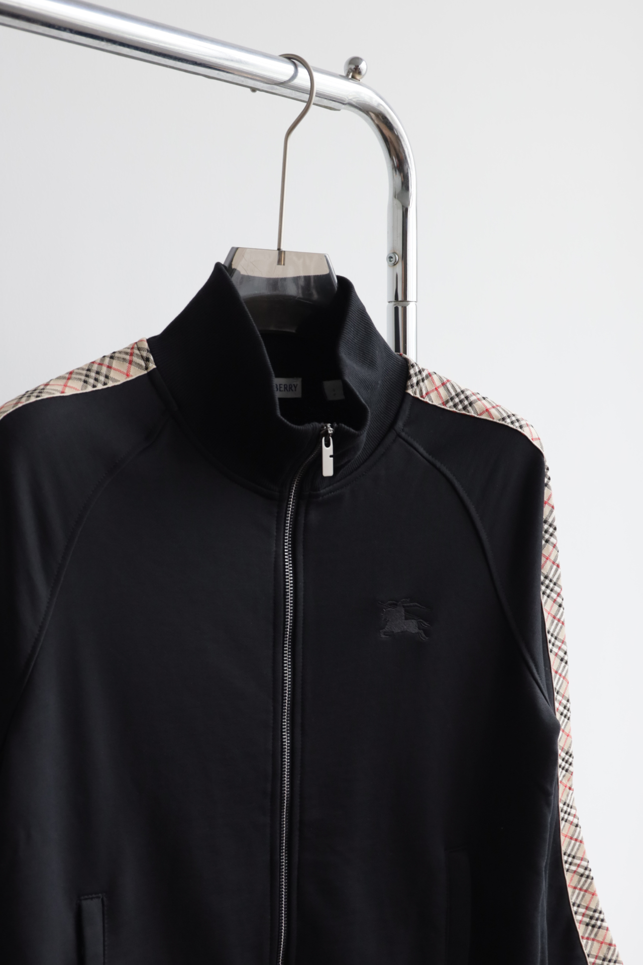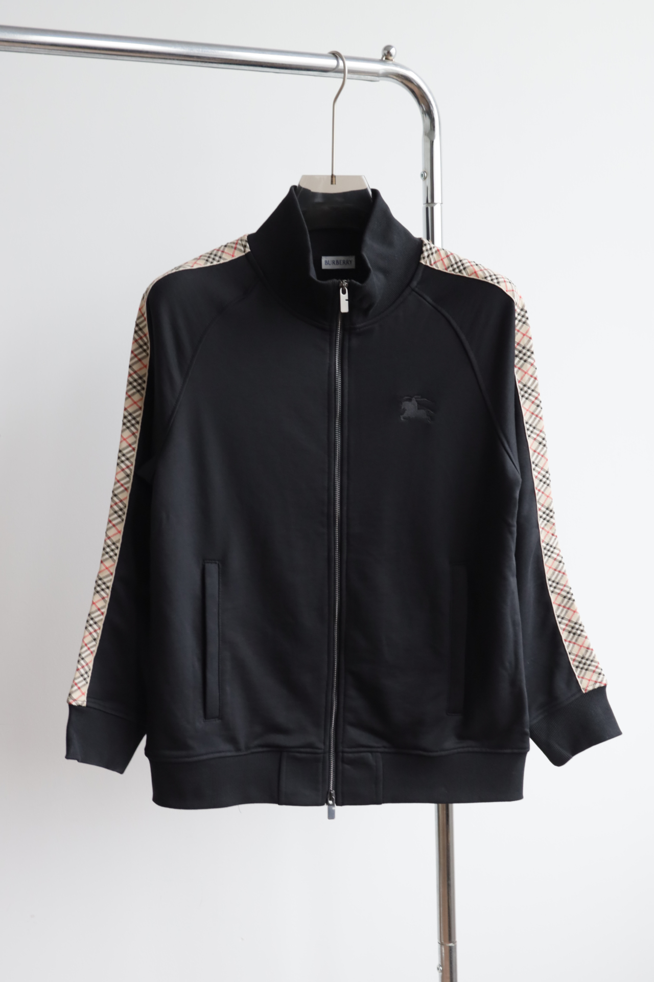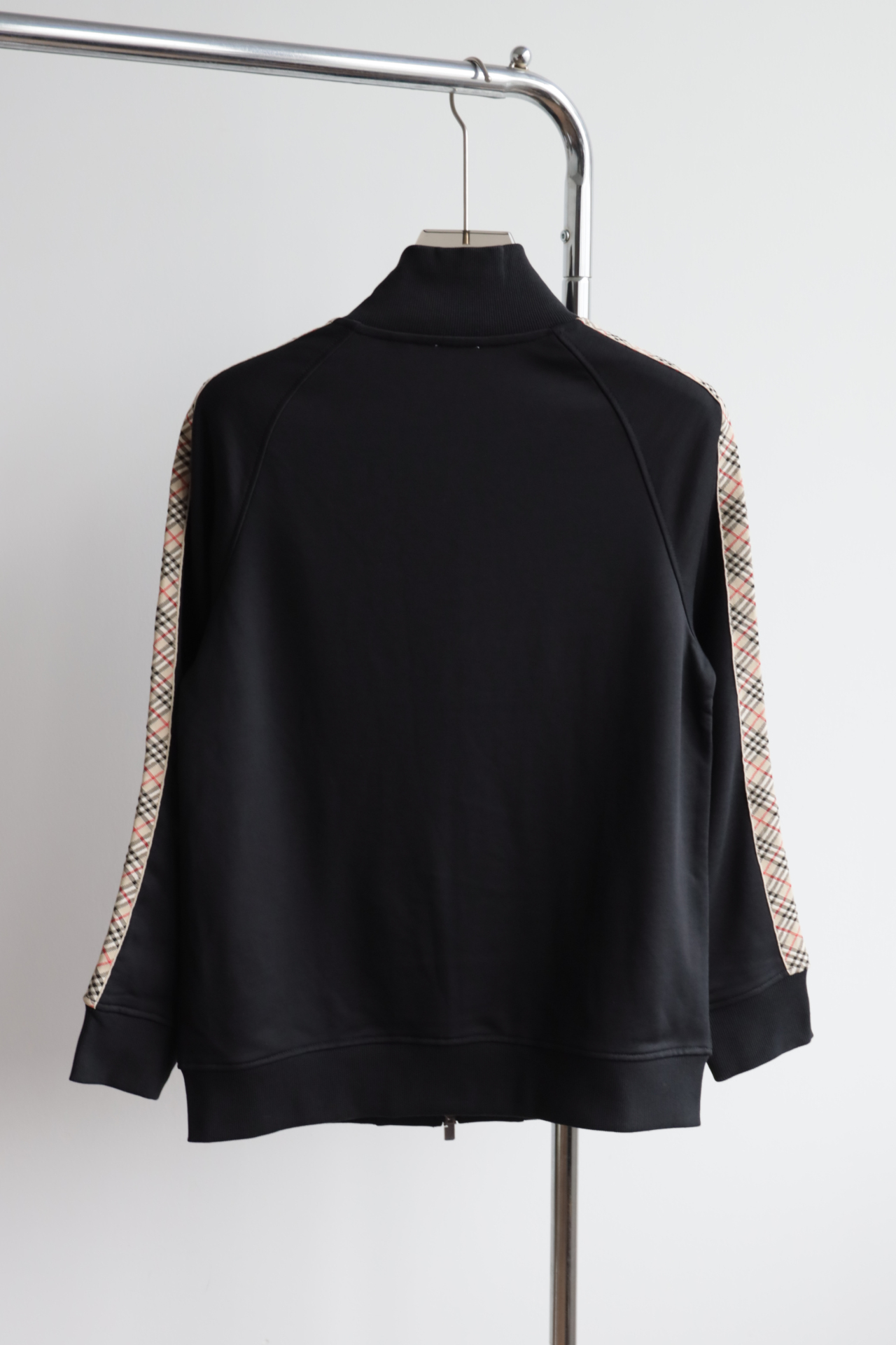 这件立领拉链外套,全棉洗水,斜纹毛圈内里,将标志性格纹与纯黑面料巧妙碰撞,打破纯色的沉闷,又比满印格纹更显低调克制。