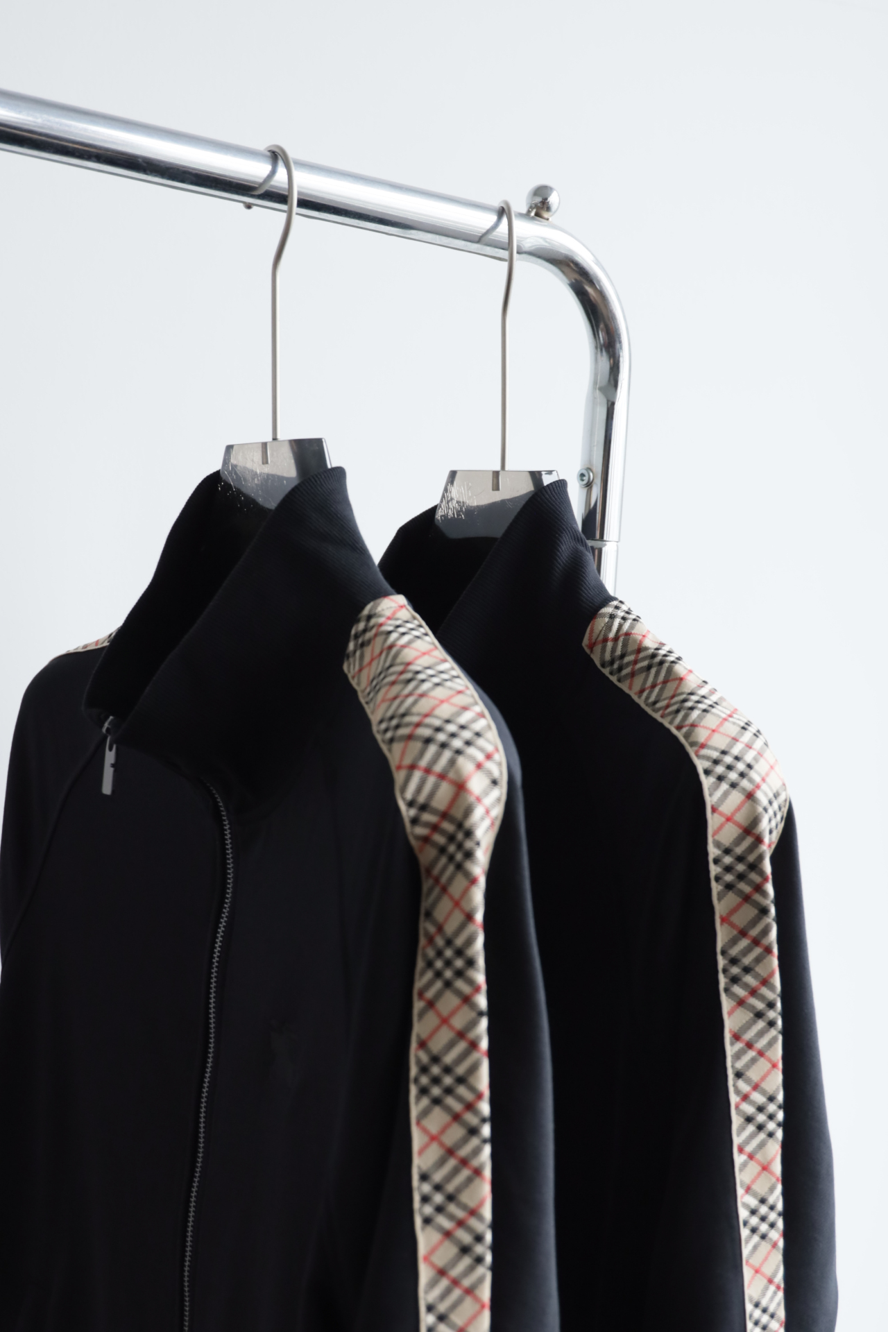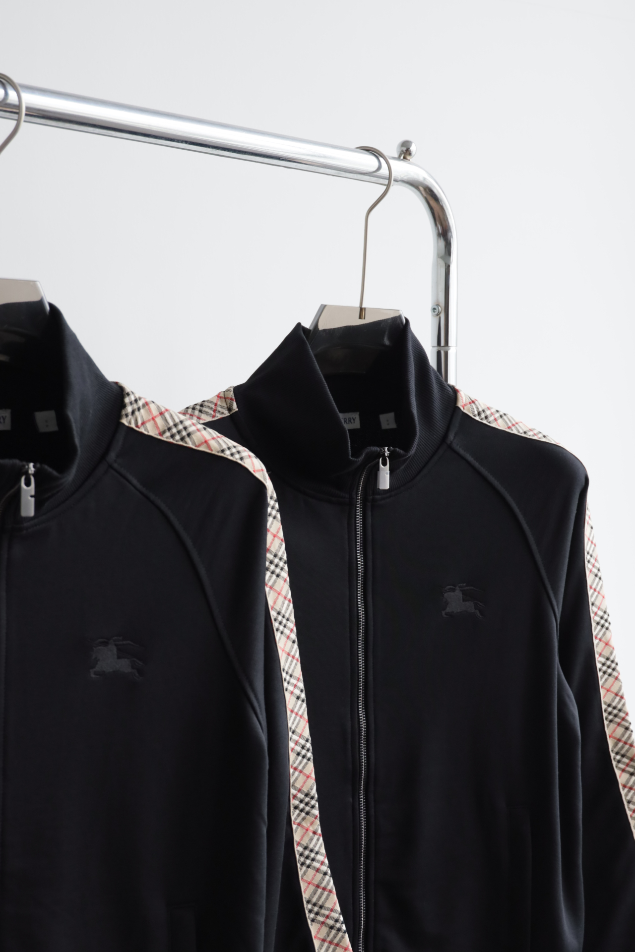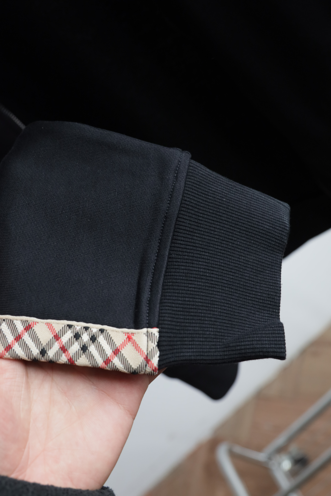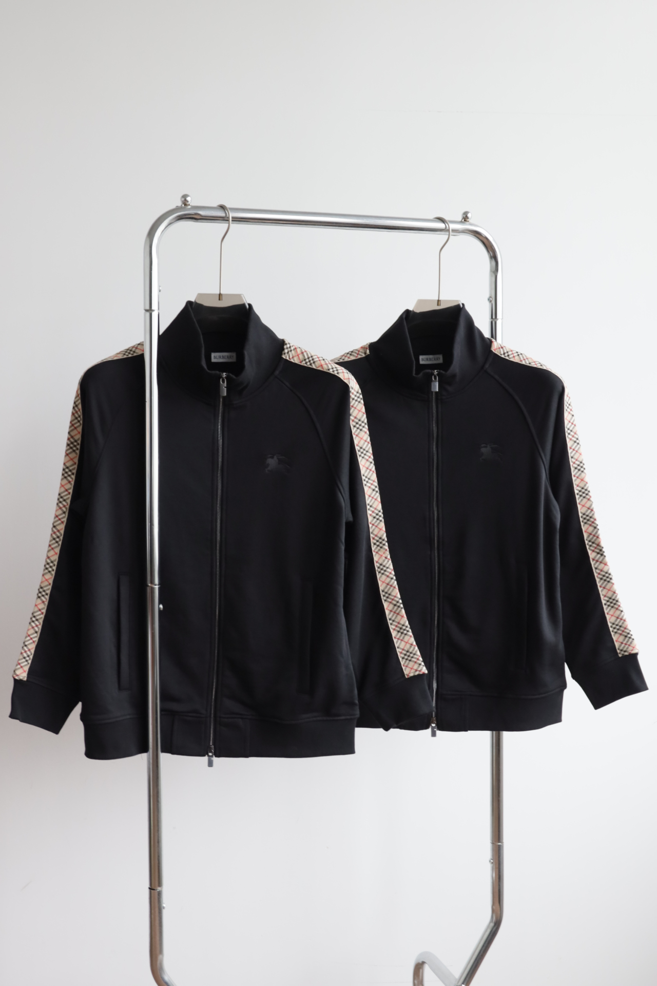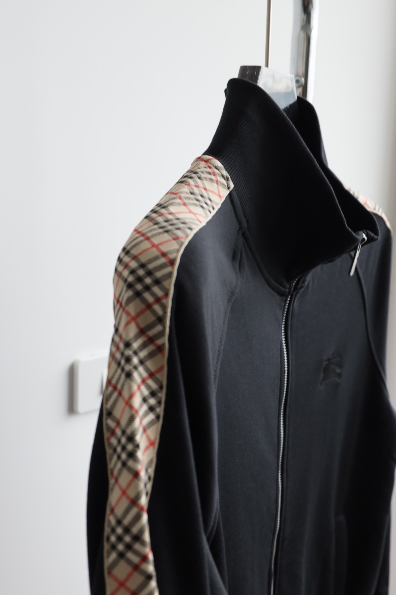 这件立领拉链外套,全棉洗水,斜纹毛圈内里,将标志性格纹与纯黑面料巧妙碰撞,打破纯色的沉闷,又比满印格纹更显低调克制。