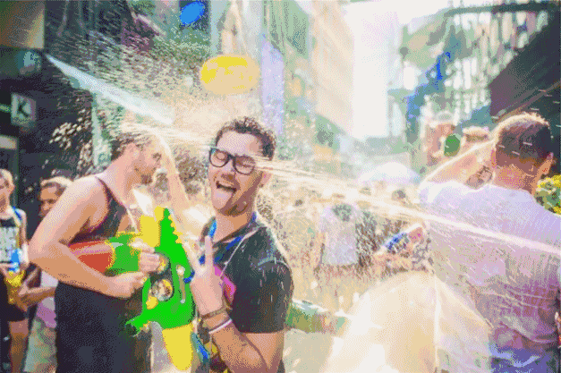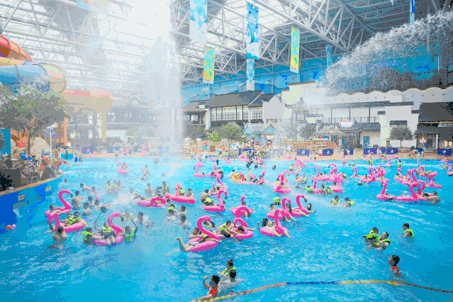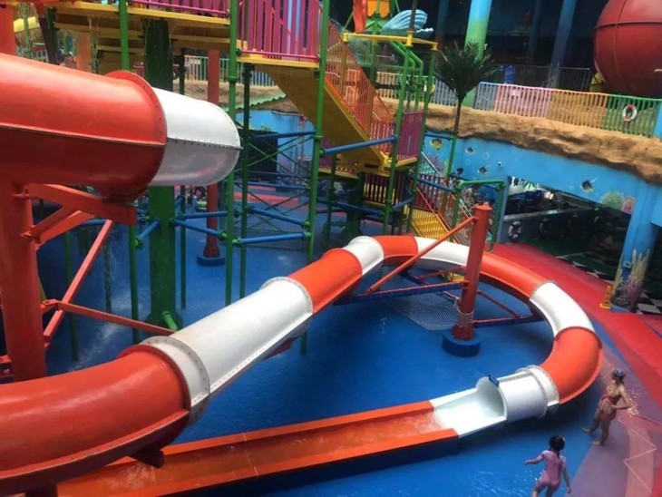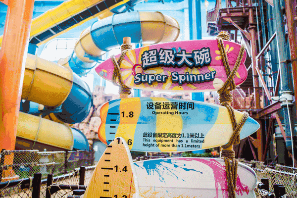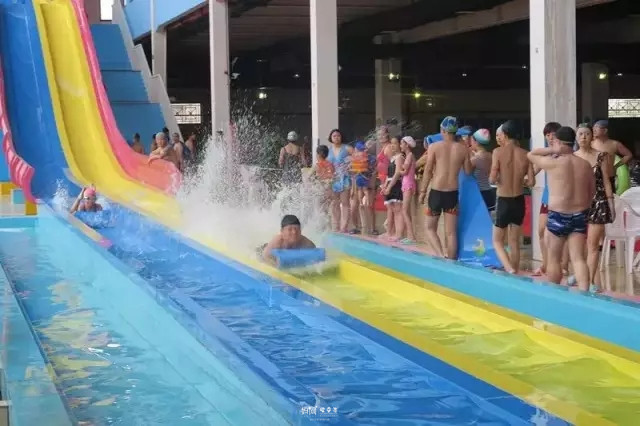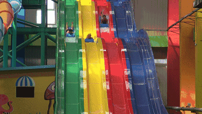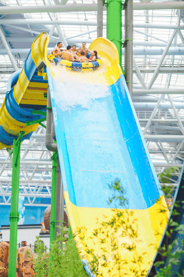 乘坐在浮筏中顺着曲折回旋的滑道疾驰而下