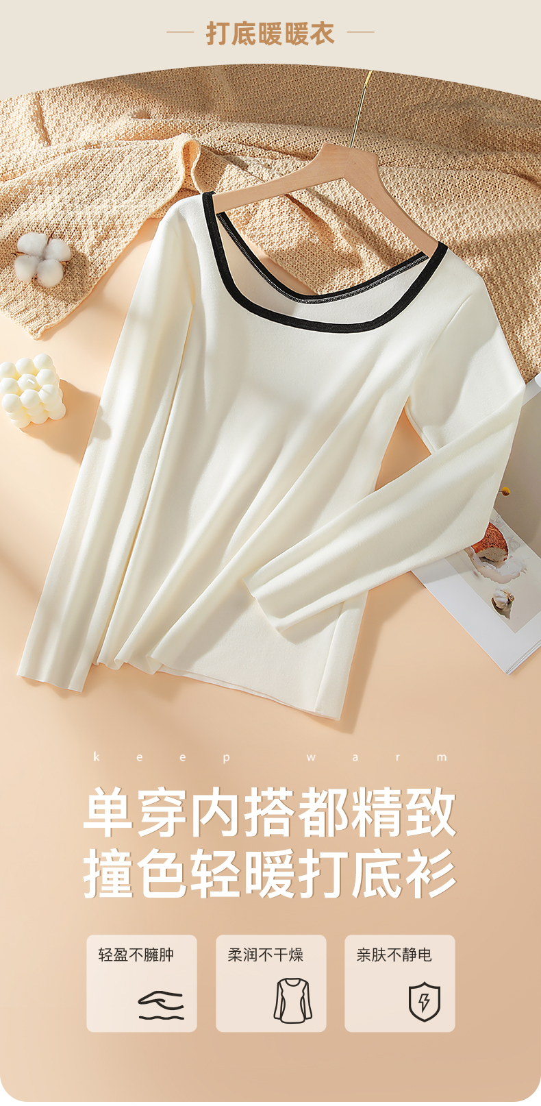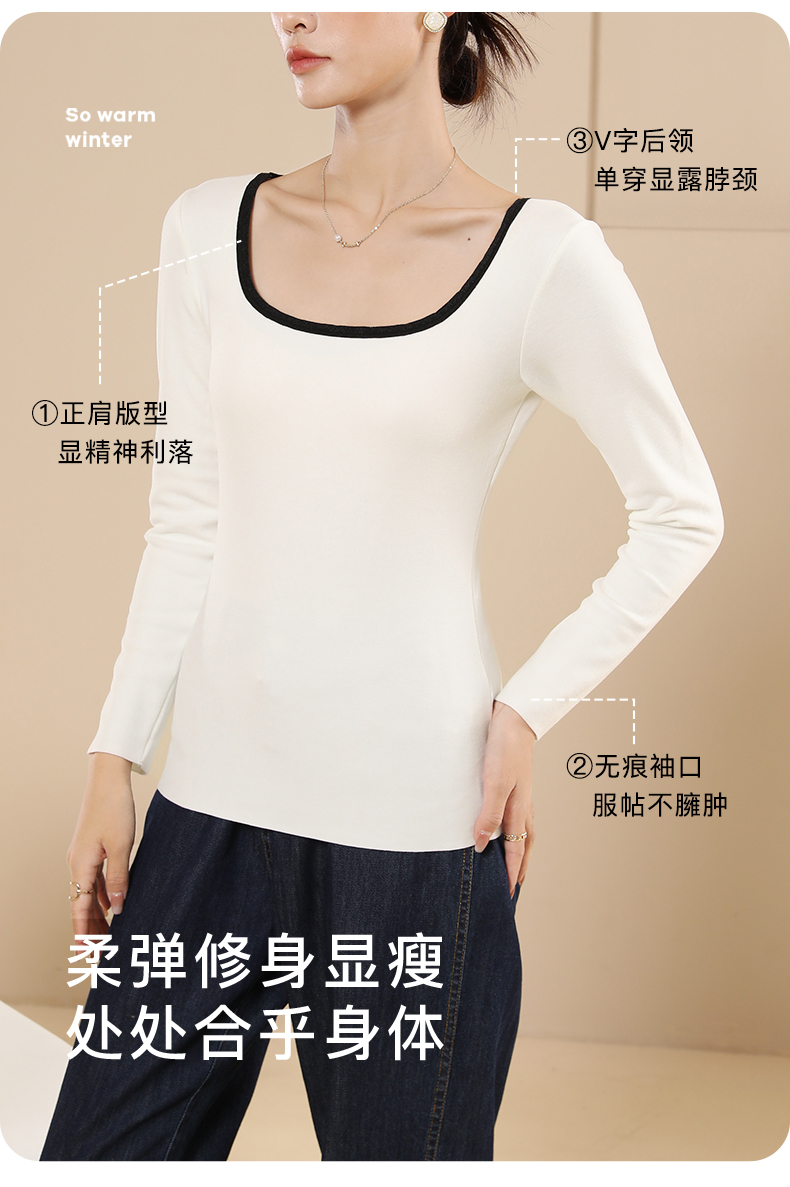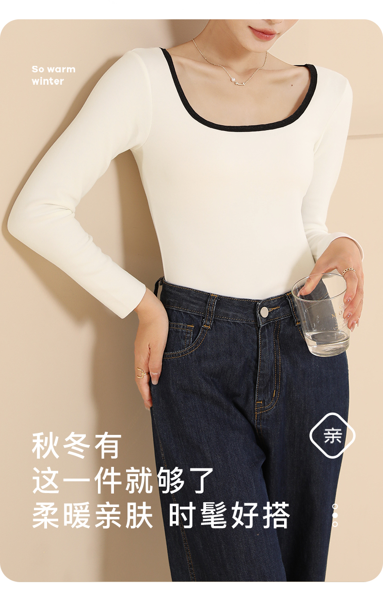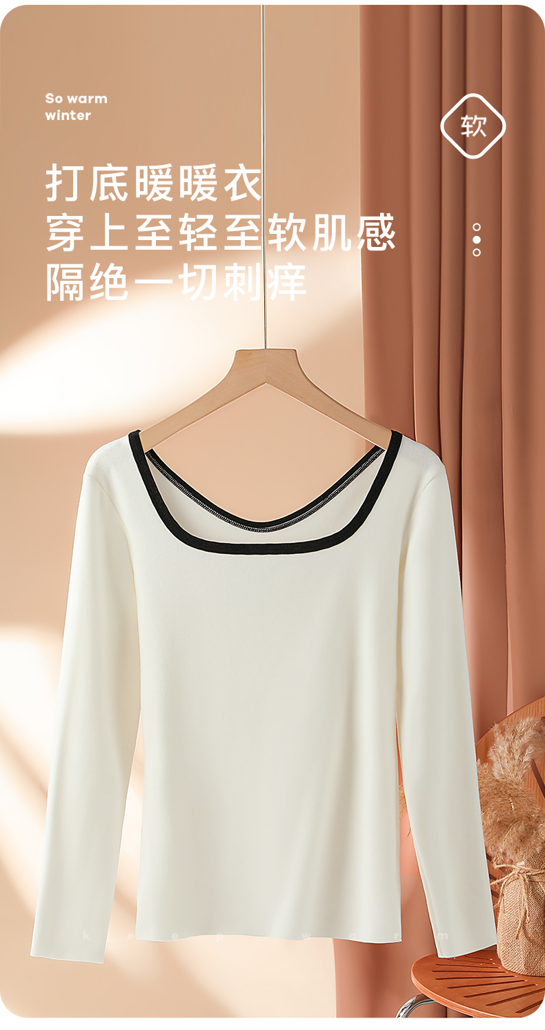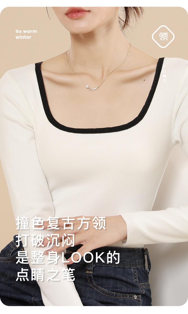 梦芭蒂时尚撞色方领女士保暖内衣轻薄修身暖绒显瘦隐形打底撞色时尚保暖上衣