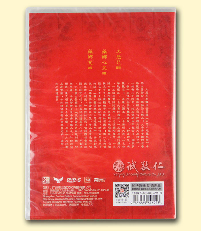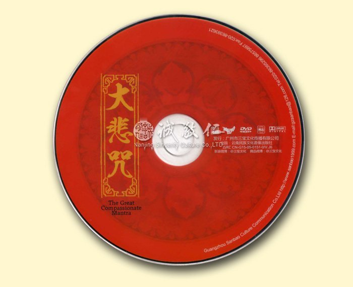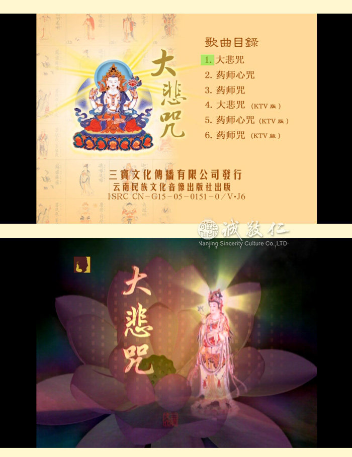 【基本信息】: 产品名称:【大悲咒】 正版DVD 简装碟 带KTV版 发烧友系列: 简装 珍藏版 音乐类型: 合集 ISRC编号:CN-G15-05-0151-0/ V?J6 音乐介质:DVD-CD 带KTV版 视频音乐 发行地区: 大陆 音乐种类: 车载CD 定价:28元/盒 【目 录】: 1、大悲咒 2、药师心咒 3、药师咒 4、大悲咒(KTV版) 5、药师心咒(KTV版) 6、药师咒(KTV版) 【产品介绍】: 大悲咒是出自《千手千眼观世音菩萨广大圆满无碍大悲心陀罗尼经》此中包含了大慈大悲观世音菩萨的大慈悲心、济世渡人之心以及无上的菩提心,是修道成佛的重要口诀。 本咒语是观世音菩萨《大悲心陀罗尼经》中的主要部分。详细的名称为:《千手千眼观世音菩萨广大圆满无碍大悲心陀罗尼经大悲神咒》。一共有八十四句。 【大悲咒持诵须知】: 一凡持诵是咒者.不拘宰官士庶.男妇老幼道士僧尼.当守戒律.竭忠于君.孝养父母.不杀不盗.不淫不妬.不嗔不恨.不骄不诈.不绮言妄语.不恶口毒舌.尊重是咒.敬而信之.如获至宝.自然所求如意.所愿遂心.功德不可思议。 一凡持诵是咒者.先念经中南无大悲观世音.愿我速知一切法云云.再念南无大悲观世音菩萨十声.南无阿弥陀佛十声.欲求某事.即观想图中某手眼宝相.至心持诵.虔诚拜祷.无不响应。 一凡持诵是经者.必须庵观寺院之内.广设坛场.作种种布施供养.洁净身心.焚修叩礼.乃为尽善.次则家庭静室.洒扫严洁.焚香供养.方可诵持.又或力不从心.即望空一香.按日持诵.但办诚心.自得孚感之应.甚至舟车鞍马.旅舍市尘.不及焚香.无由礼拜之处.只于每日清晨盥洗之后.至心望空虔诵五遍.勿令间断.大悲威神之力.亦无有不感应者。 一凡持诵是咒者.当悟经中所云.广宣流布.莫令断绝二句.或印施.或抄写.或口授.务令此咒普为流传.辗转济度.功德无量。 一持此神妙大陀罗尼之人.必由夙世已曾供养诸佛.广植善根.始能信心受持.是人幼德.已无量无边.获福亦不可思议.但始勤终怠.修行人所忌.怀不信心.罪业更深.经云.于咒疑者.乃至小罪轻业亦不得灭.何况重罪.普愿同志善友.信心坚固.善果圆成.实厚望焉。 【大悲咒的由来】: 大悲咒,是观世音萻萨的大慈悲心,无上菩提心,以及济世渡人,修道成佛的重要口诀。其中一字一句都包含着正等正觉的真实工夫,没有一丝一毫的虚伪。本咒是观世音菩萨「大悲心陀罗尼经」中的主要部份,共有八十四句。其详名为:「千手千眼观世音菩萨广大圆满无碍大悲心陀罗尼经大悲神咒。」 其得名的由来是:有一次佛陀告诉阿难尊者说:「如是神咒,有种种名:一名广大圆满、一名无碍大悲、一名救苦陀罗尼、一名延寿陀罗尼、一名灭恶趣陀罗尼、一名破恶业障陀罗尼、一名满愿陀罗尼、一名随心自在陀罗尼、一名速超十地陀罗尼。」它的被称为千手千眼观世音菩萨的因由是:有一次他曾经在千光王静住如来住所时,静住如来特为了他说了「广大圆满无碍大悲陀罗尼」,并且对他说:「善男子弹汝当持此心咒,普为未来恶世一切众生作大利乐。」据经的记载:当时观世音菩萨听了此咒后,即由初地证至第八地--不动地。于是发出誓愿说:「设我当来之世能利乐一切众生者,令我即时身生千手千眼具足。」如此发愿后,果真顿时身生千手千眼,并且十方大地为之震动,十方诸佛亦都放出无量光明,遍照十方的无边世界。 至于本咒所以有种种异名,释尊曾经告诉阿难说:这是起因于观音菩萨的宏愿。菩萨曾在世尊处发誓说:「设若诸人天诚心念我名者,亦应念本师阿弥陀如来名,然后诵此陀罗尼神咒。如一夜能持诵五遍,则能除灭百千万亿劫生死重罪。设若诸人天诵持大悲章句者,即于临命终时,十方诸佛皆来授手接引,并且随其所愿往生诸佛国土。设若诸人天诵持大悲心咒者,十五种善生,不受十五种恶死。」因此大悲咒,不但能除一切灾难以及诸恶病苦,且能成就一切善法远离一切怖畏,所以我们应以十分虔敬的信心与清挣心去受持它,方能契合菩萨的大悲心,获得无上的利益。沉沦在三界五趣众生,果能经常持诵大悲咒,不但能治一切心病与身病,且能由此超脱生死轮回,愿众生齐诵本咒,同证佛果。
