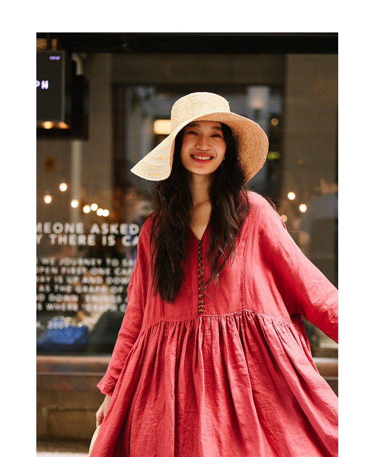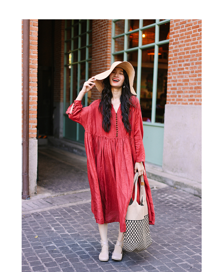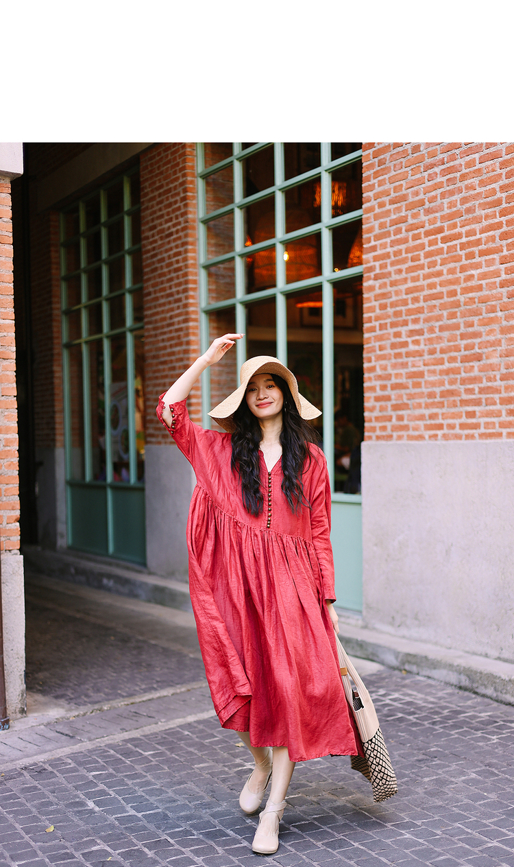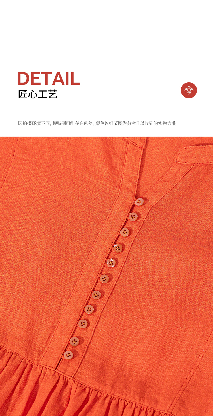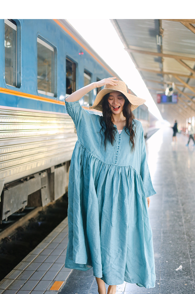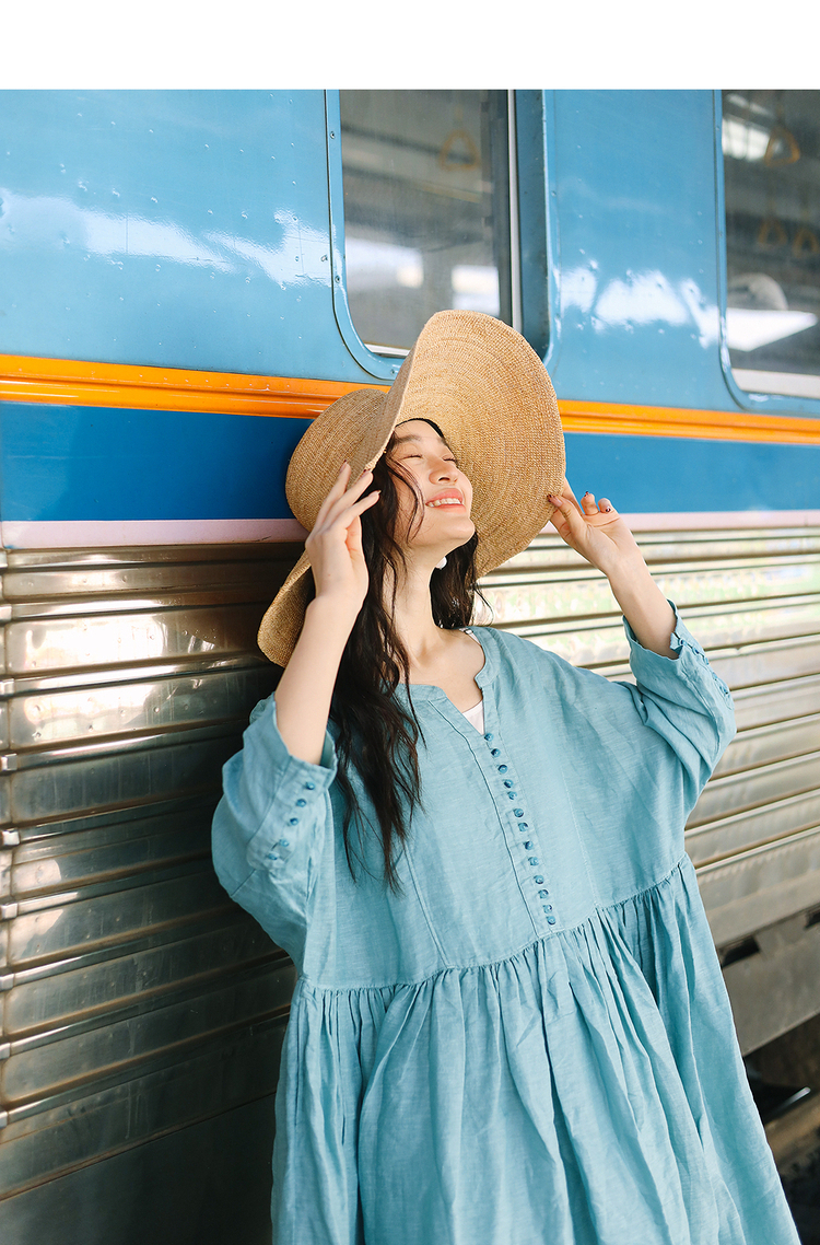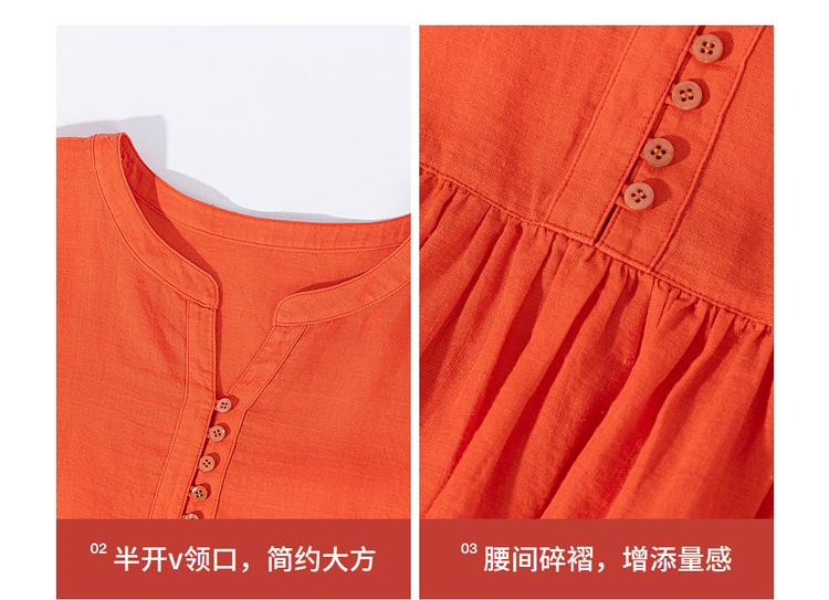 绽放076朵/干洗亚麻宽松重工碎褶文艺防晒V领七分袖简约连衣裙
