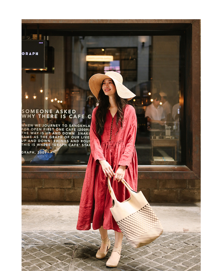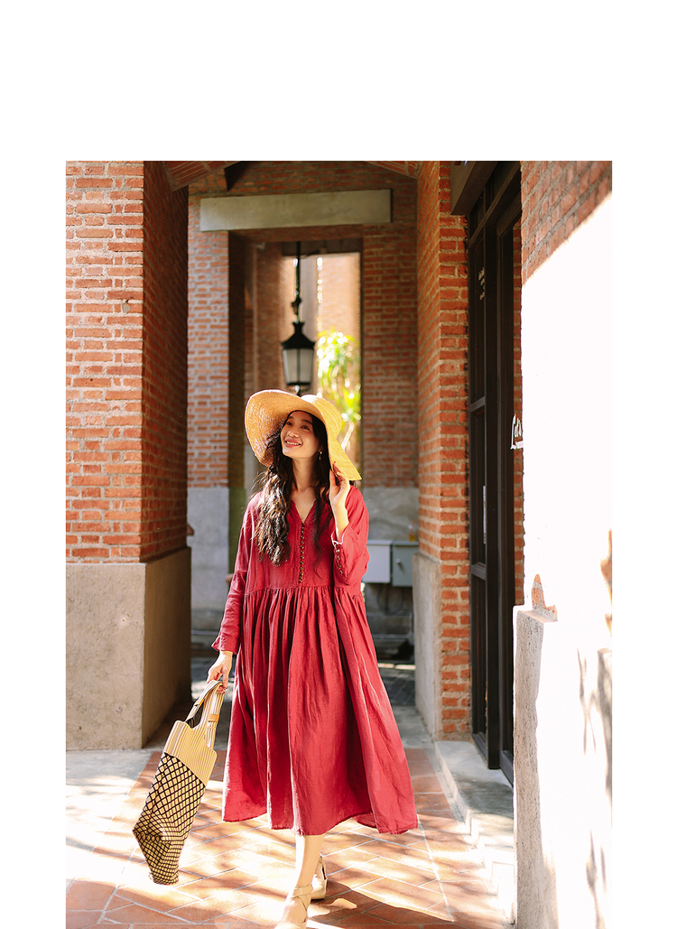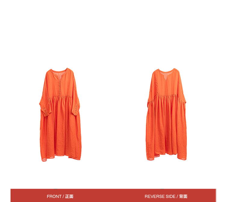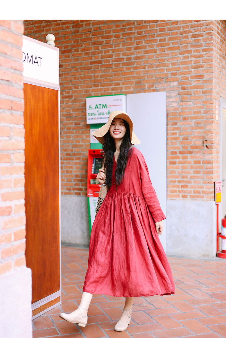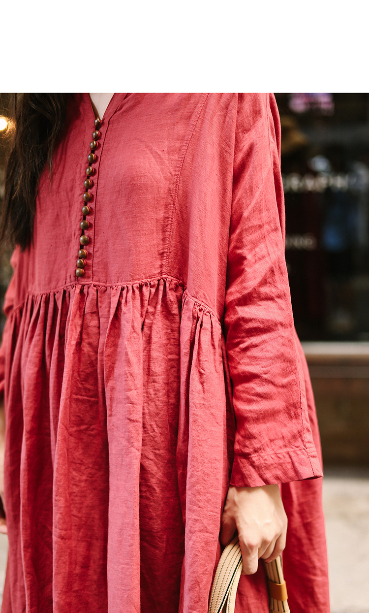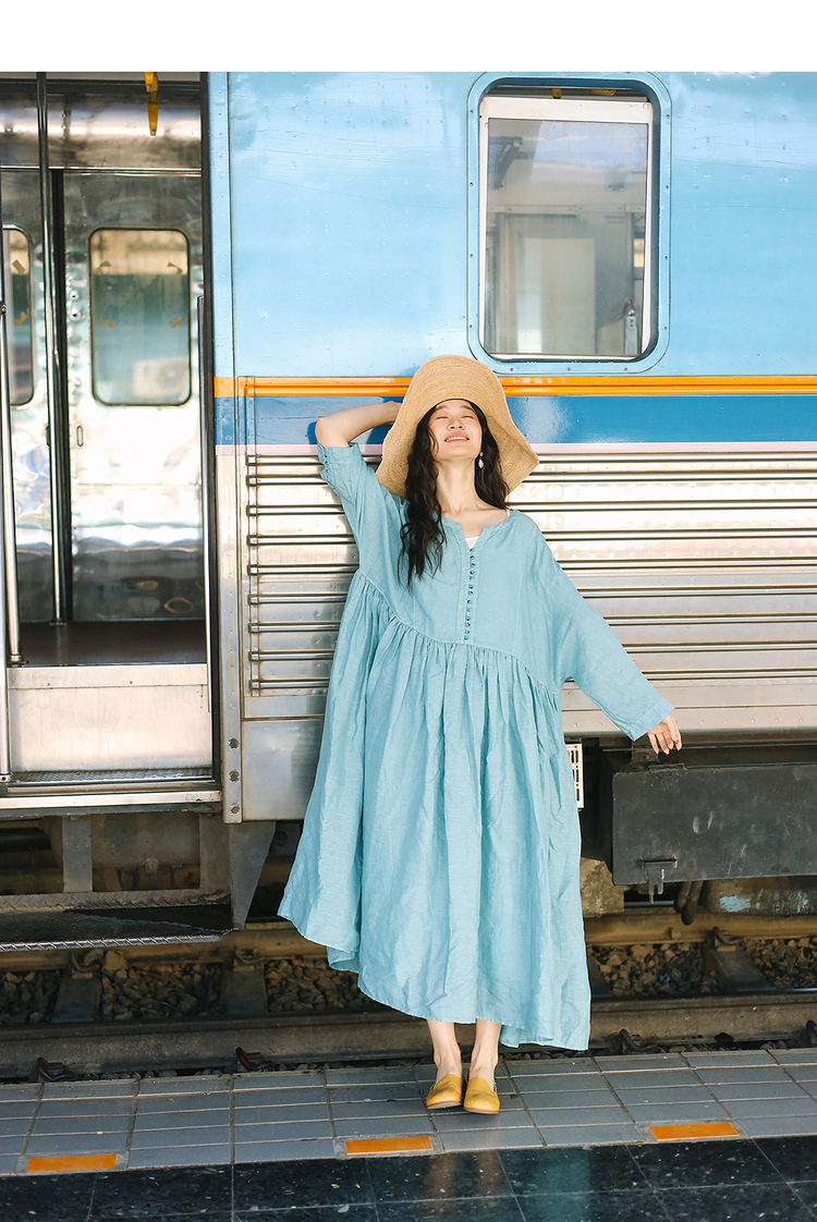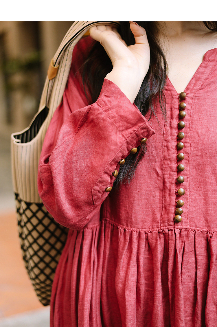 绽放076朵/干洗亚麻宽松重工碎褶文艺防晒V领七分袖简约连衣裙