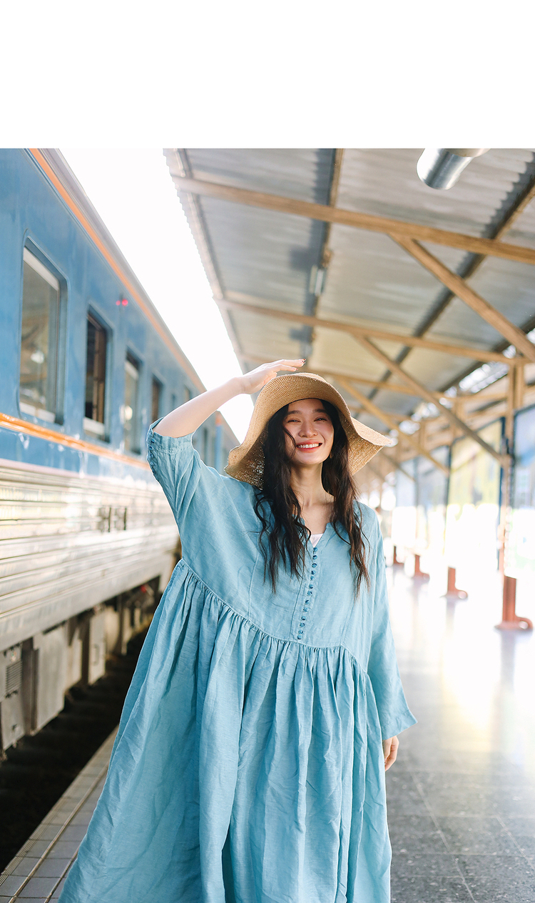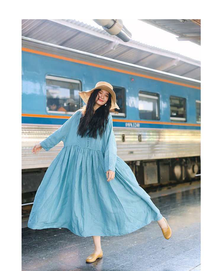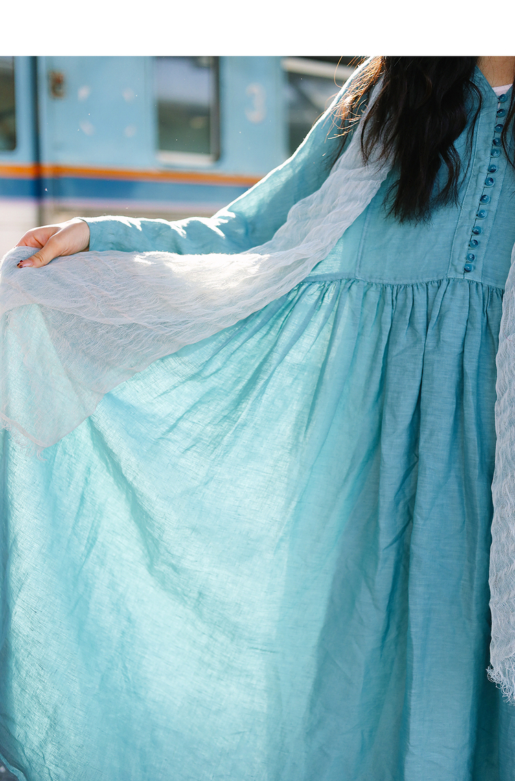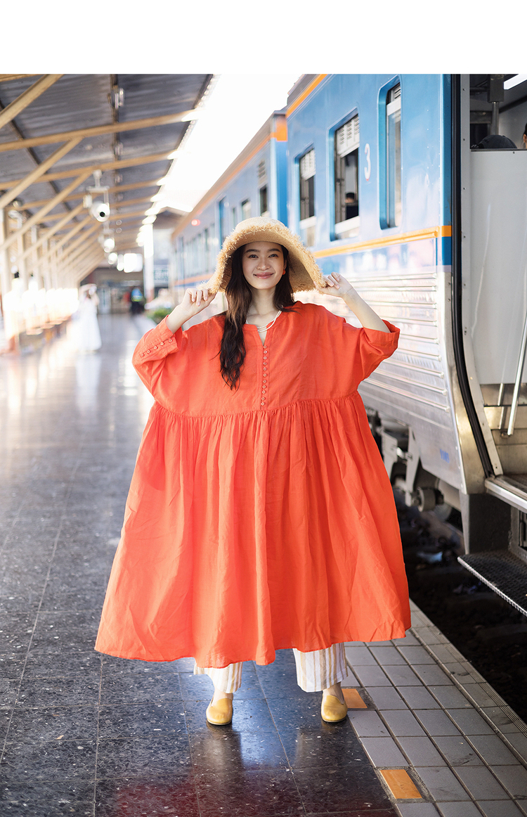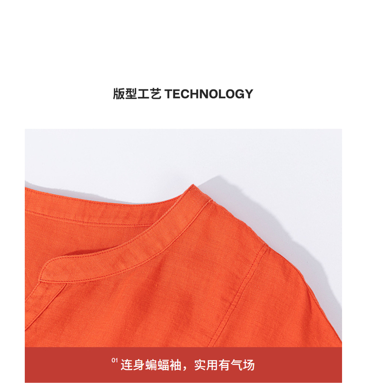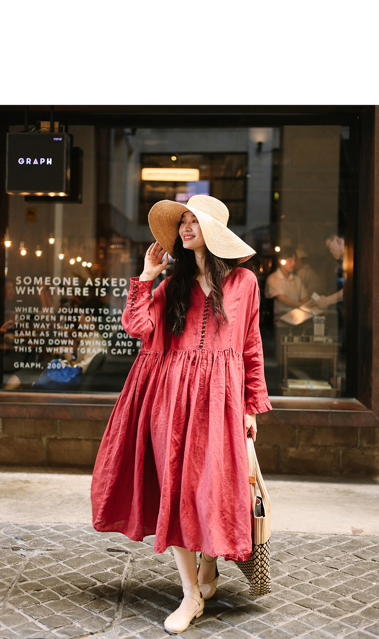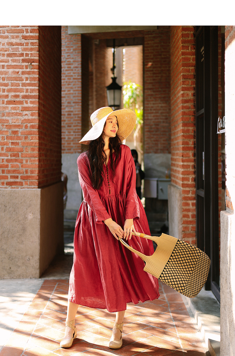 绽放076朵/干洗亚麻宽松重工碎褶文艺防晒V领七分袖简约连衣裙
