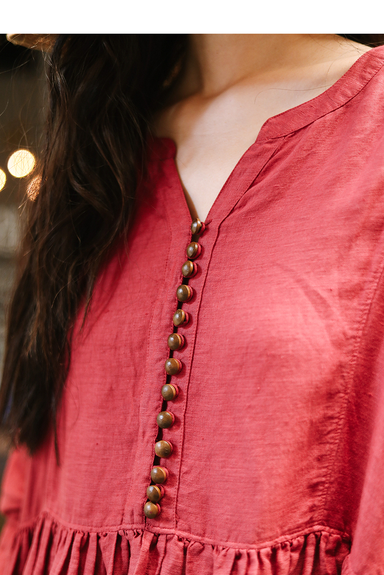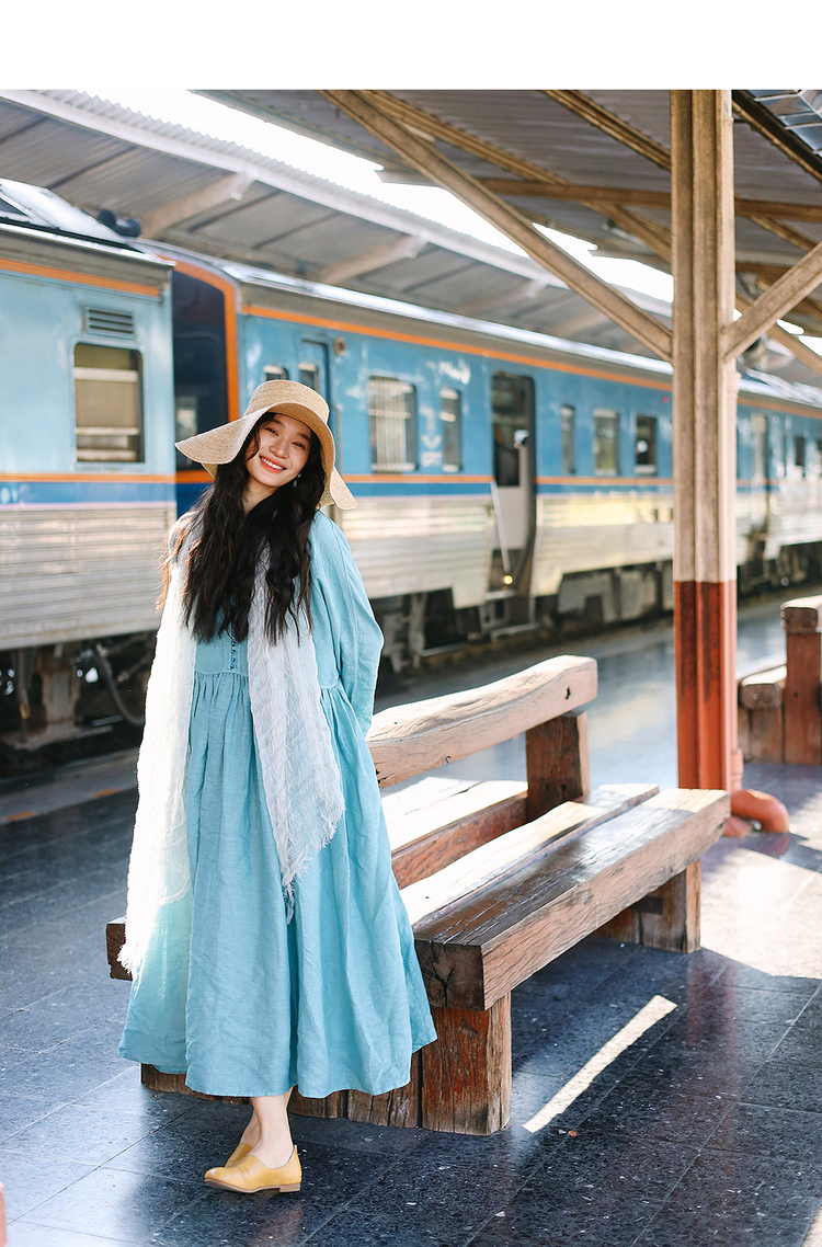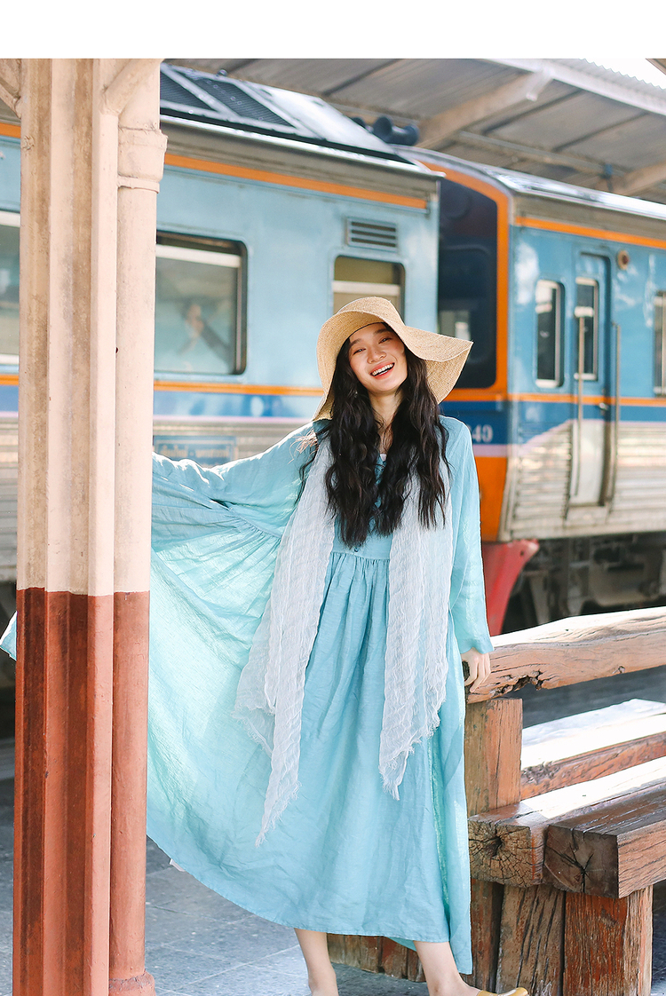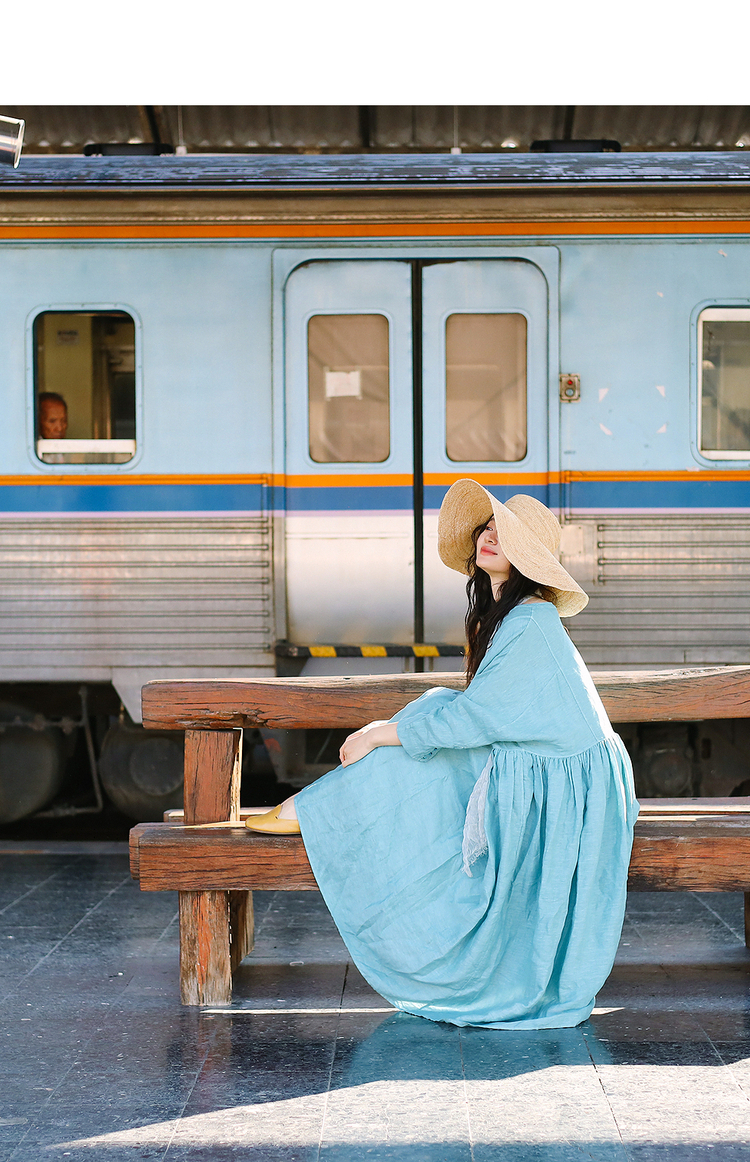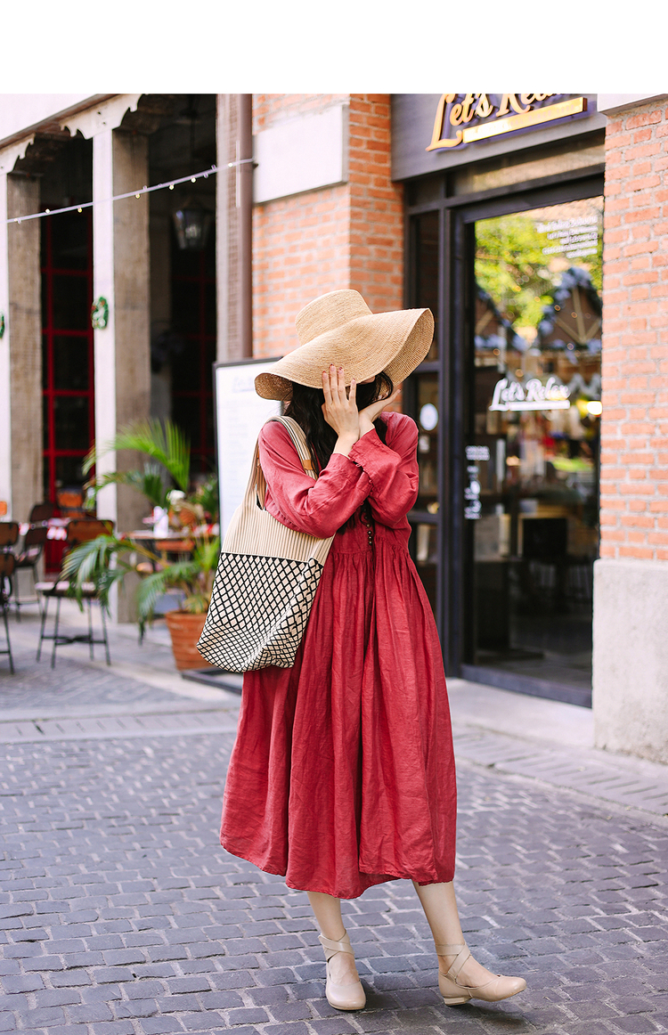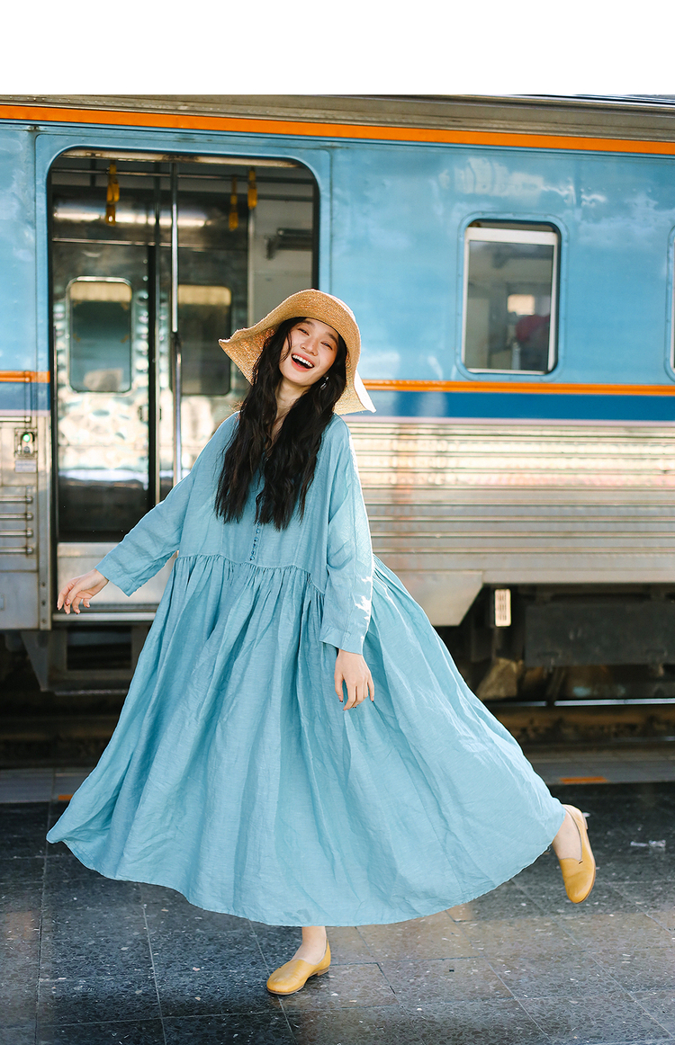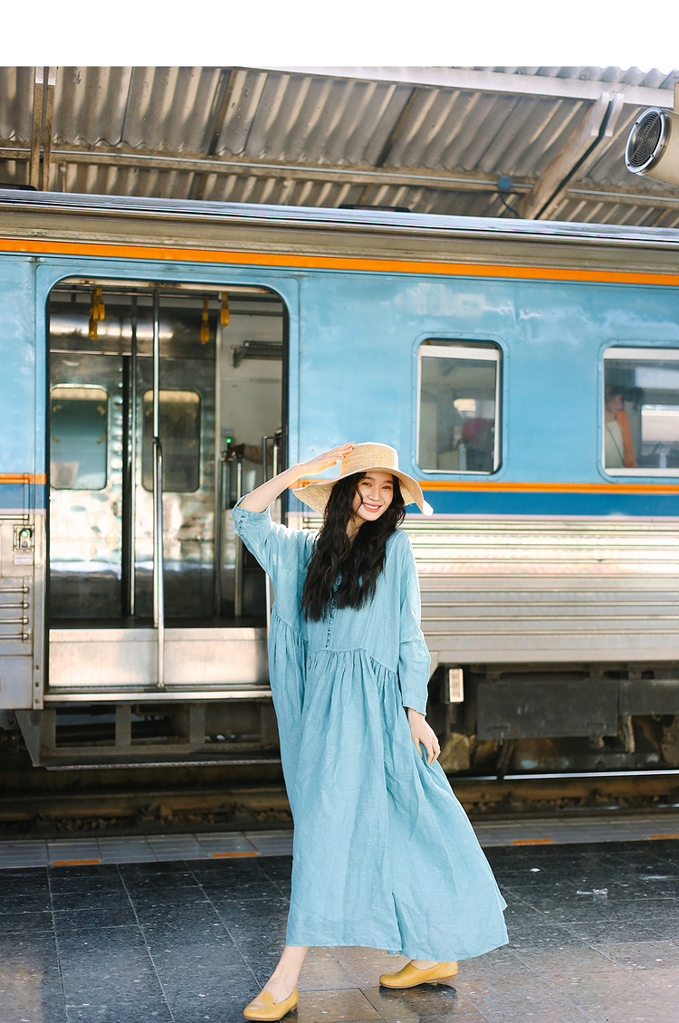 绽放076朵/干洗亚麻宽松重工碎褶文艺防晒V领七分袖简约连衣裙