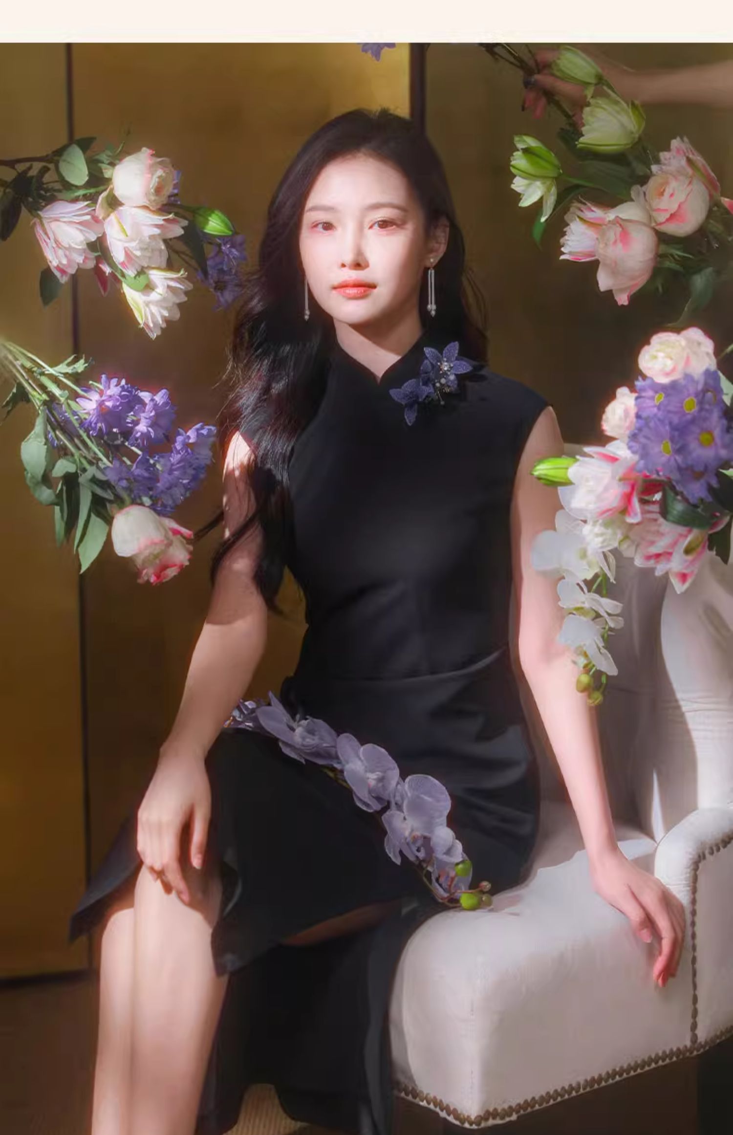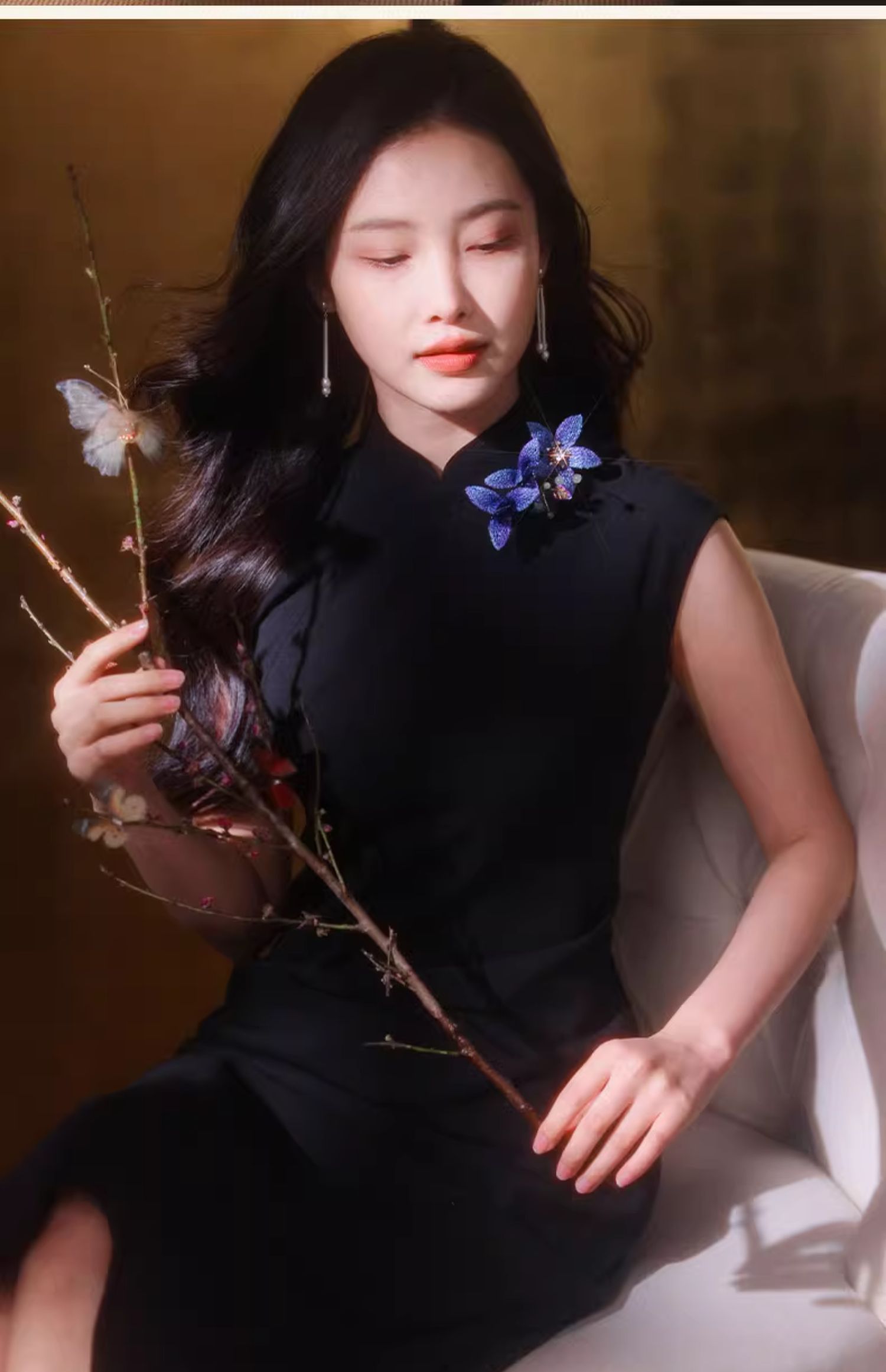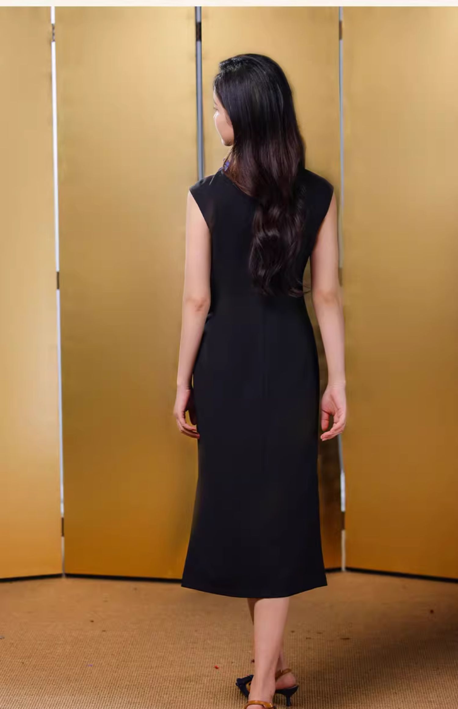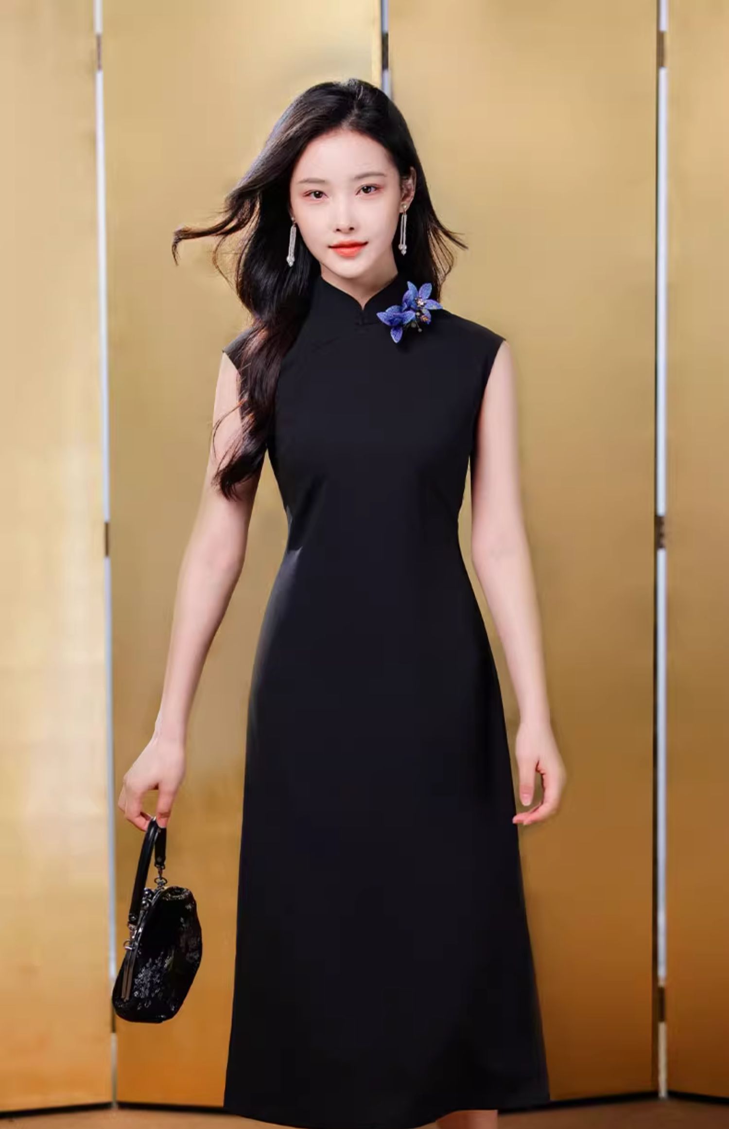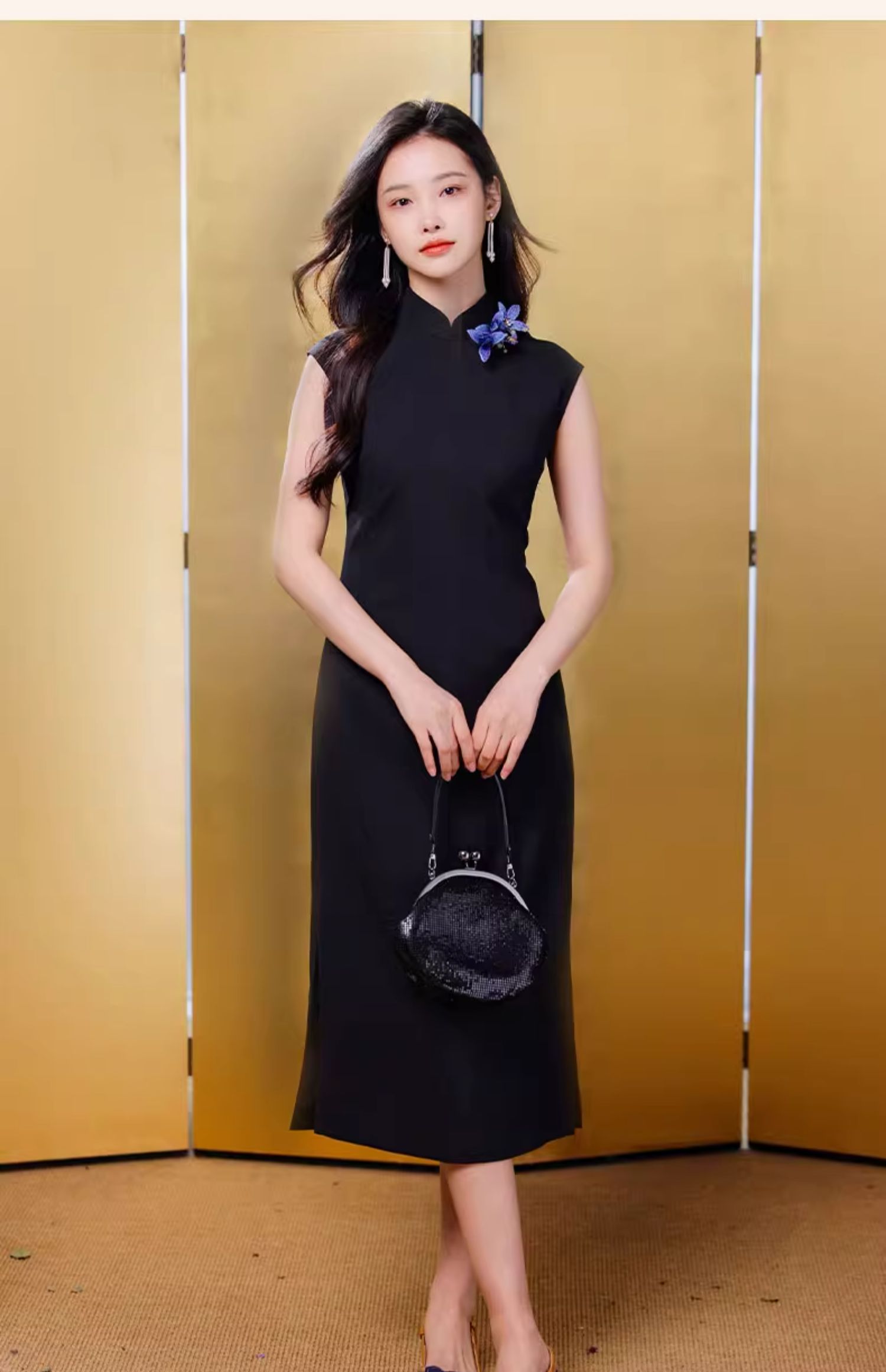 逸红颜悦然2025夏新款略宽松显腰身版微弹雪纺通勤改良旗袍小黑裙