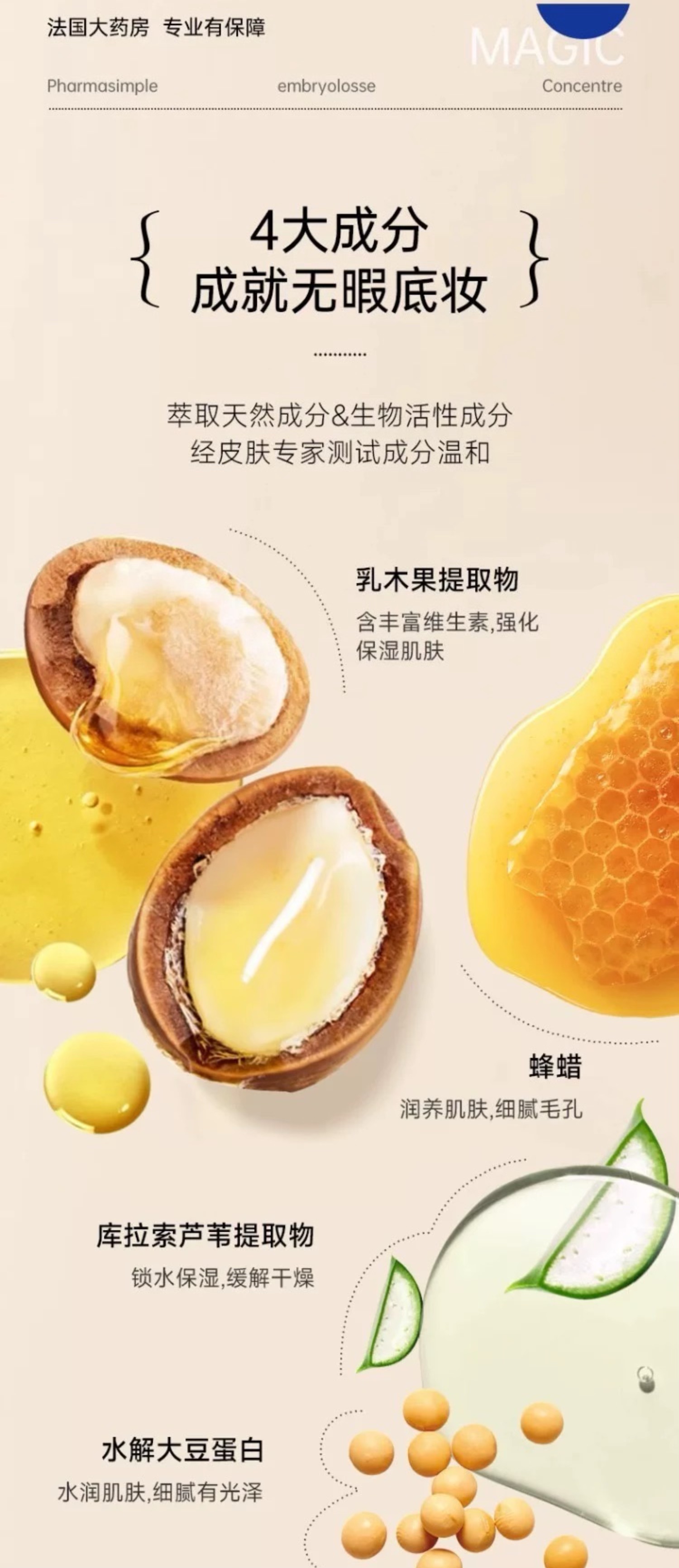 法国大宝最让人惊艳的是一瓶顶多瓶的全能实力,而这一切都源于它的四大天然核心成分:乳木果提取物富含维生素,能深层滋润肌肤,改善干涩粗糙,让皮肤变得柔软细腻;库拉索芦荟提取物主打锁水与舒缓,牢牢锁住肌肤水分,缓解干燥泛红,特别适合敏感肌日常维稳;蜂蜡不仅能润养肌肤,还能细腻毛孔,让皮肤表层更平整,为后续上妆打下好基础;水解大豆蛋白则能补充肌肤水分,改善暗沉无光,让肤质更通透,自带自然健康光泽。这些成分科学搭配,温和又高效,干皮、混皮、油皮、敏感肌都能适配。