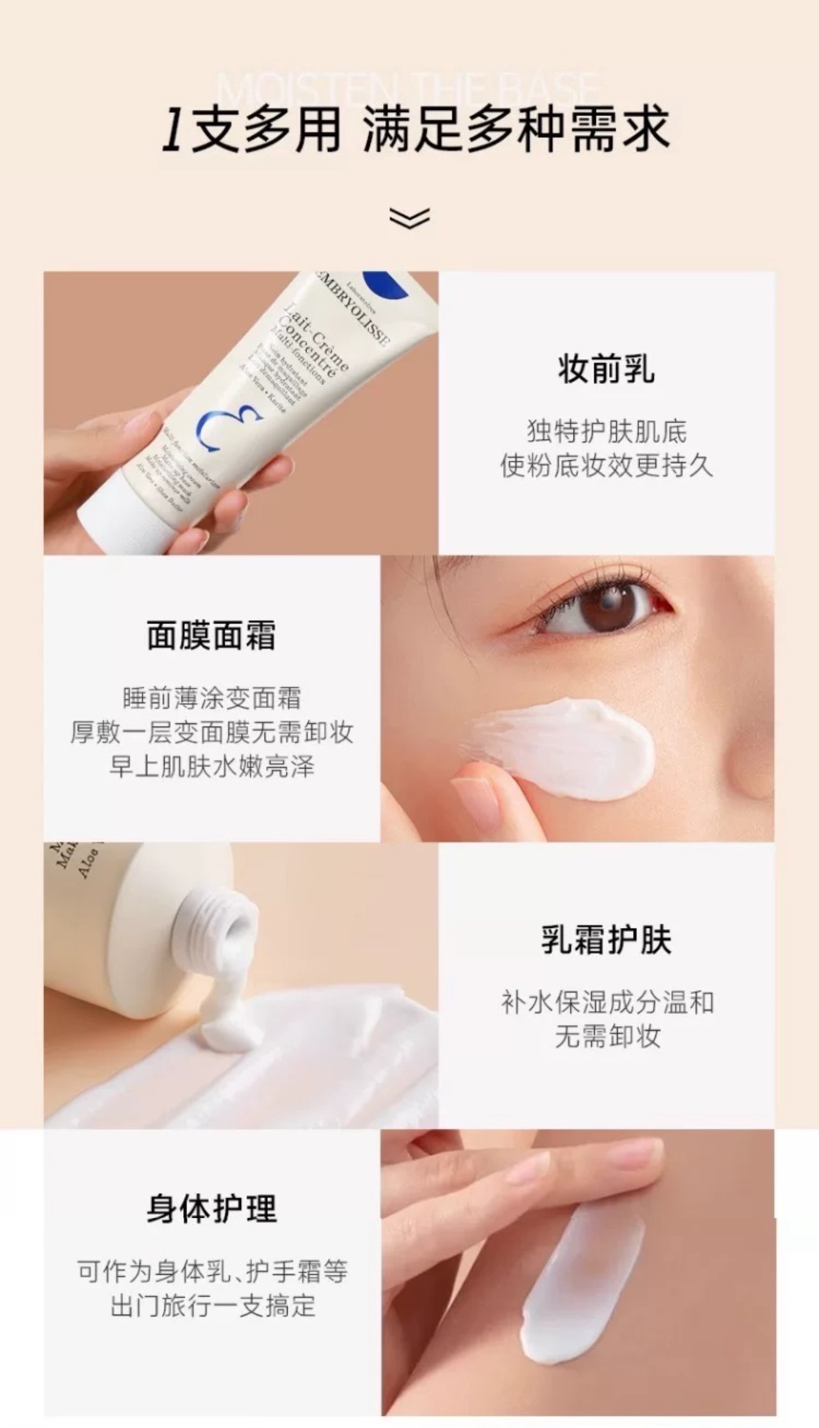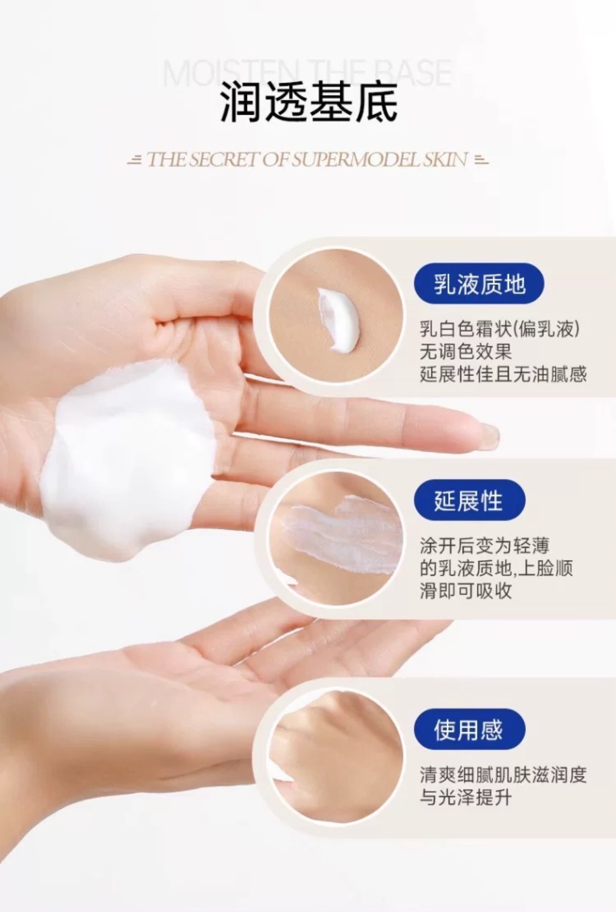 作为妆前乳,它的质地像牛奶般丝滑,轻薄水润好推开,不仅能锁水保湿、平衡水油,让后续不卡粉不浮粉,持妆一整天也不容易脱妆,还能有效隔离彩妆和外界粉尘;日常薄涂时,它就是一款支滋润度在线的乳液,空调房里用也能远离干燥泛红的困扰;换季敏感或熬夜后,厚敷一层当睡眠面膜,第二天醒来皮肤更是水嫩透亮;旅行时带它真的很省心,还能当护手霜,又能做身体乳,一支多用!